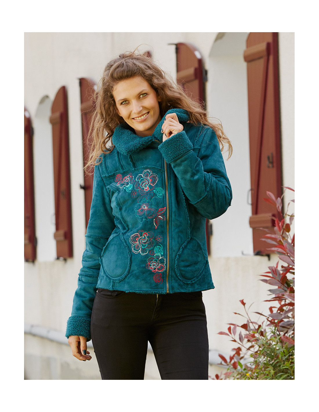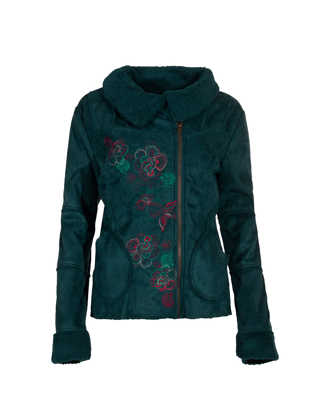 This short coat is ultra feminine with its beautiful floral embroidery going up along the asymmetrical metal zipper. It is in soft suede and fully lined with warm faux fur. We love its pockets and its stitched seams that reveal the fur and the construction of this model. Length S: 60cm - XXL: 67cm.