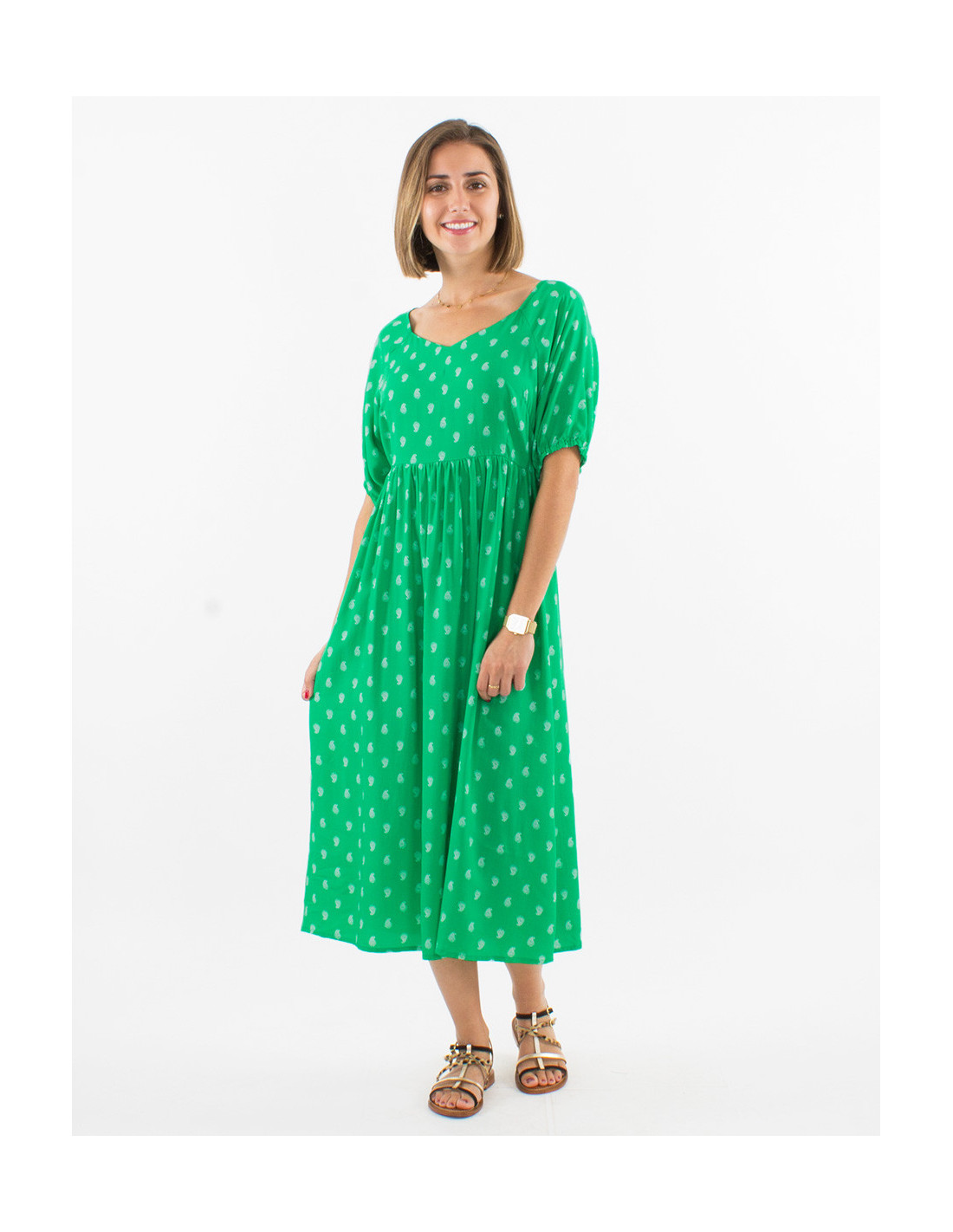 Mid-calf dress chic woman for summer green with gold patterns boho