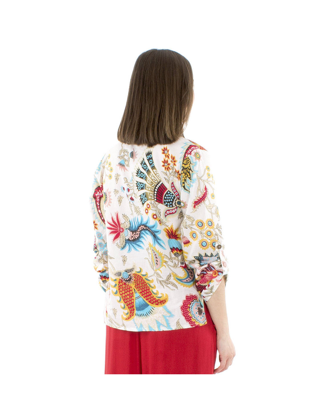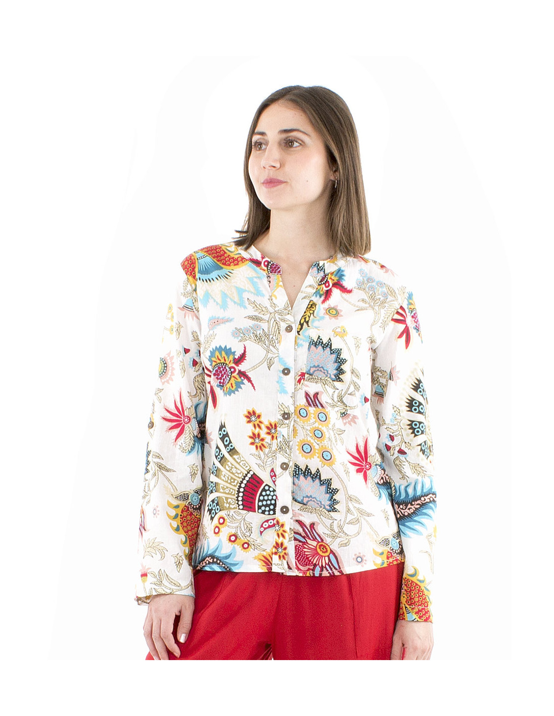 This vibrant women's blouse will delight you : made from 100% cotton you'll appreciate its breathable fabric, featuring an original and colorful ethnic print inspired by India (available in two different colors to suit all your tastes), a loose and comfortable fit for ultimate ease of movement, and coconut wood buttons that add a touch of originality and natural charm to your style. Available in sizes S to XXL.