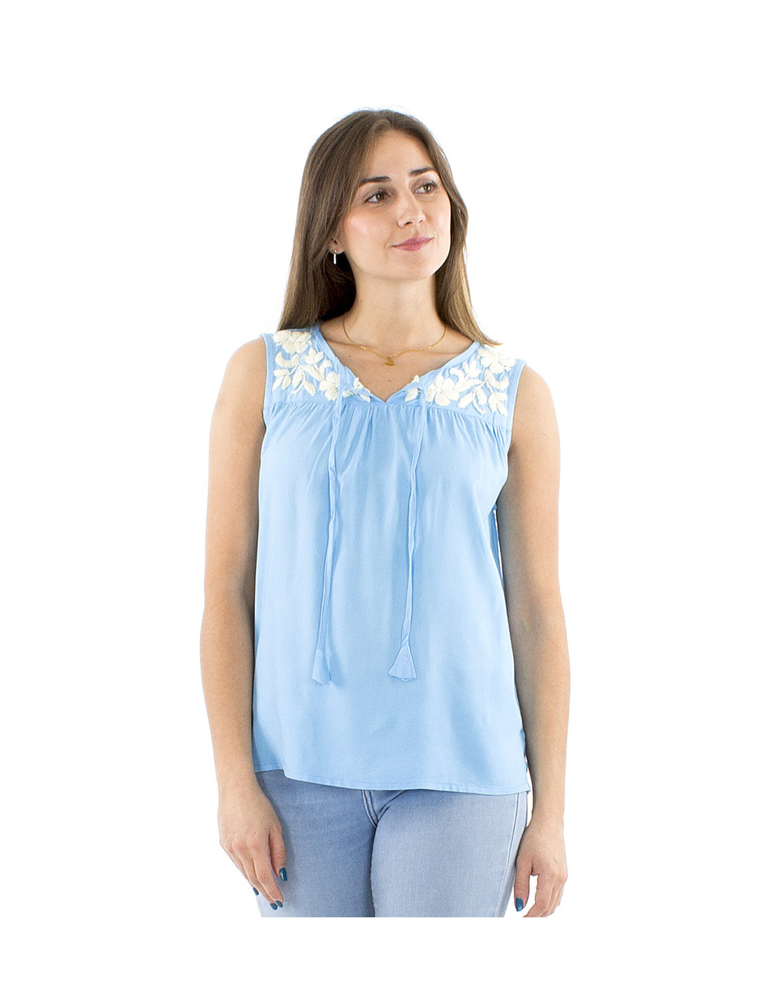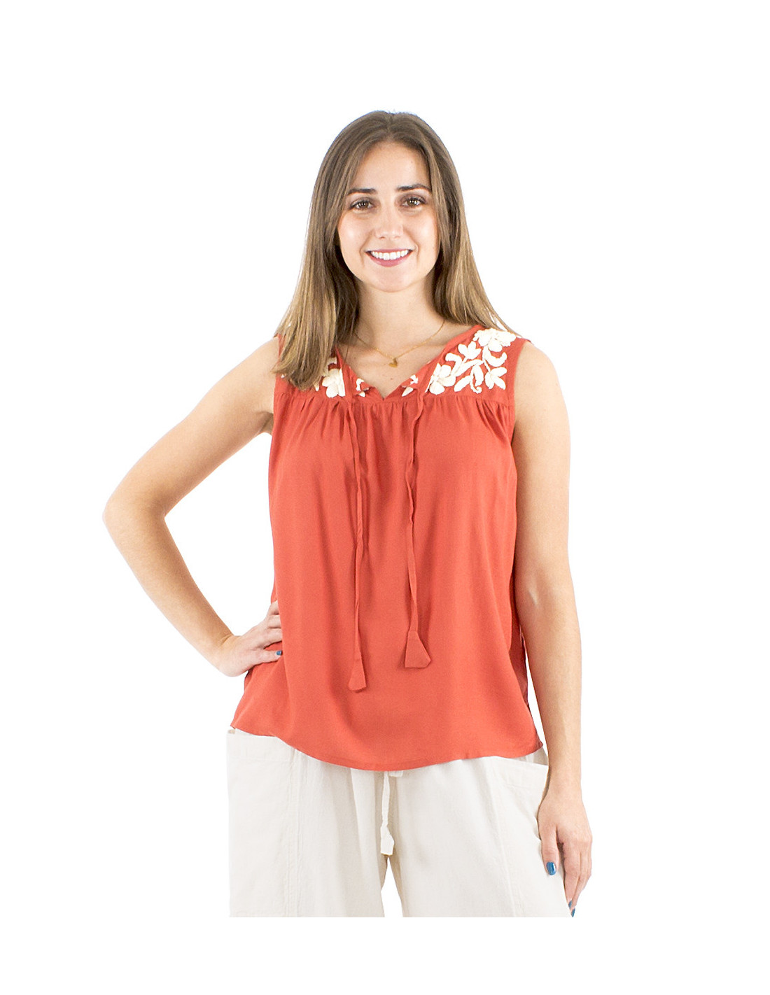 Looking for a bohemian and original top in a fluid and comfortable fabric ? This tank top is just what you need : made of viscose, it has a perfect drape and its loose fit will be incredibly comfortable on warm summer days. The neckline can be worn open in a V-shape, or you can tie the attached ties for a more discreet and girly look. You'll love the hand-embroidered details on the shoulders and the gathers at the bust. This bohemian and feminine piece is available in 3 colors, from S to XL.