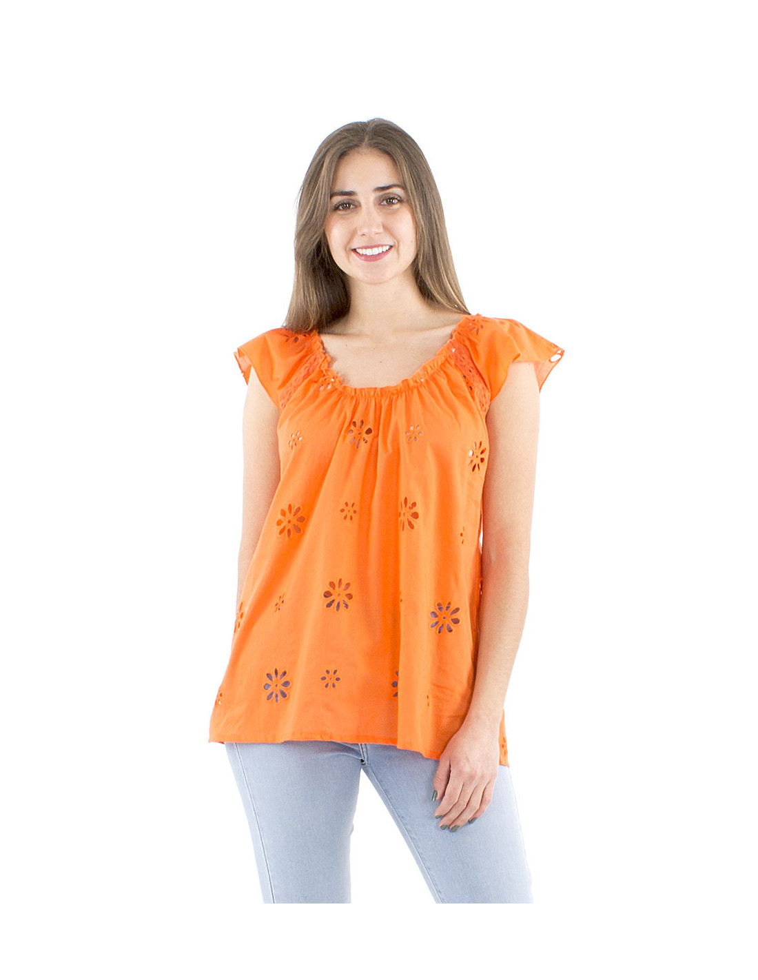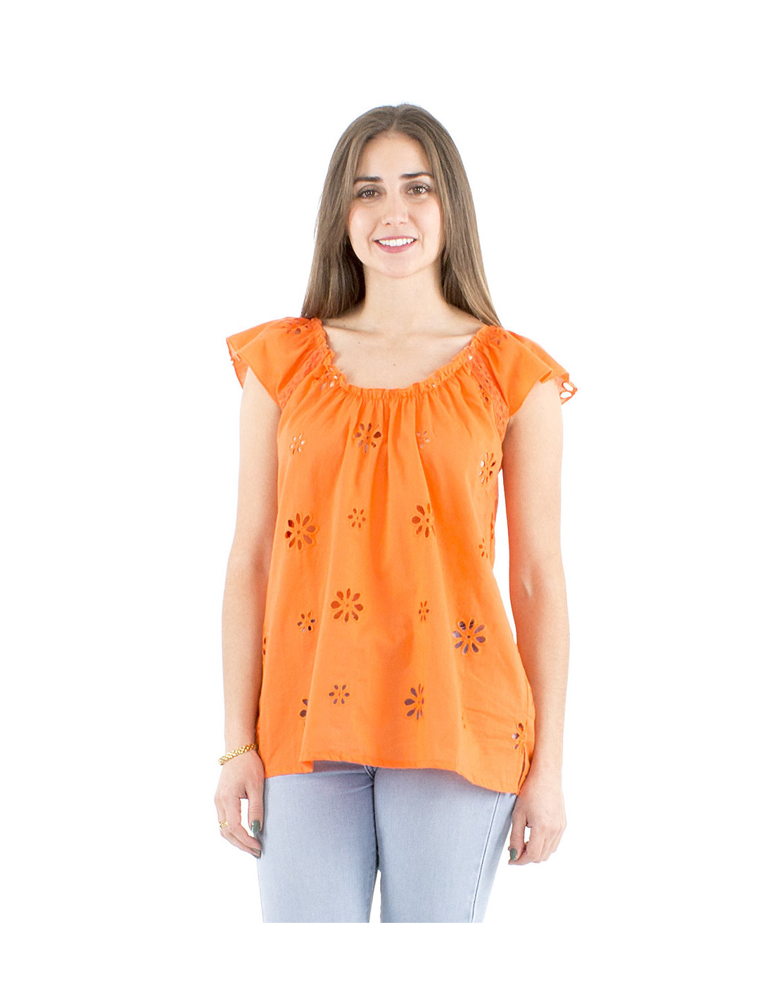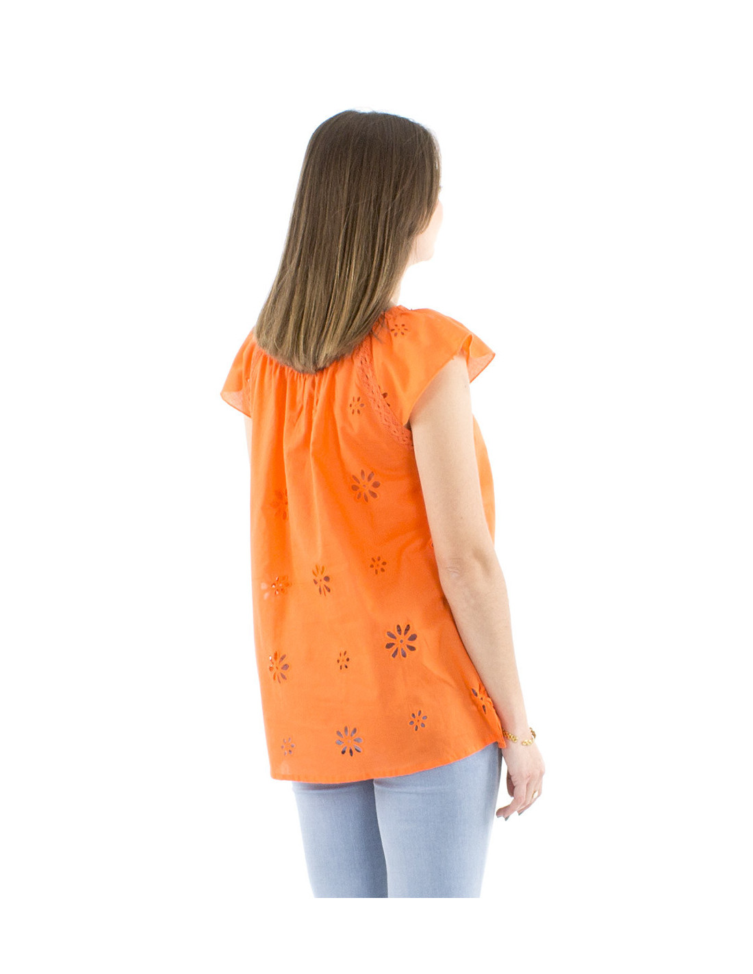 Women's cotton blouse with floral eyelet embroidery : a perfect piece for spring and summer with its short sleeves and flared cut, a wide, rounded, gathered neckline that flatters your bust without being ostentatious, and delicate ruffled sleeves that add a romantic and girly touch. This bohemian and original blouse is available in three colors : white or natural for those who prefer neutral tones, or coral to add a pop of color to your wardrobe. Sizes S to XL to fit most body types.