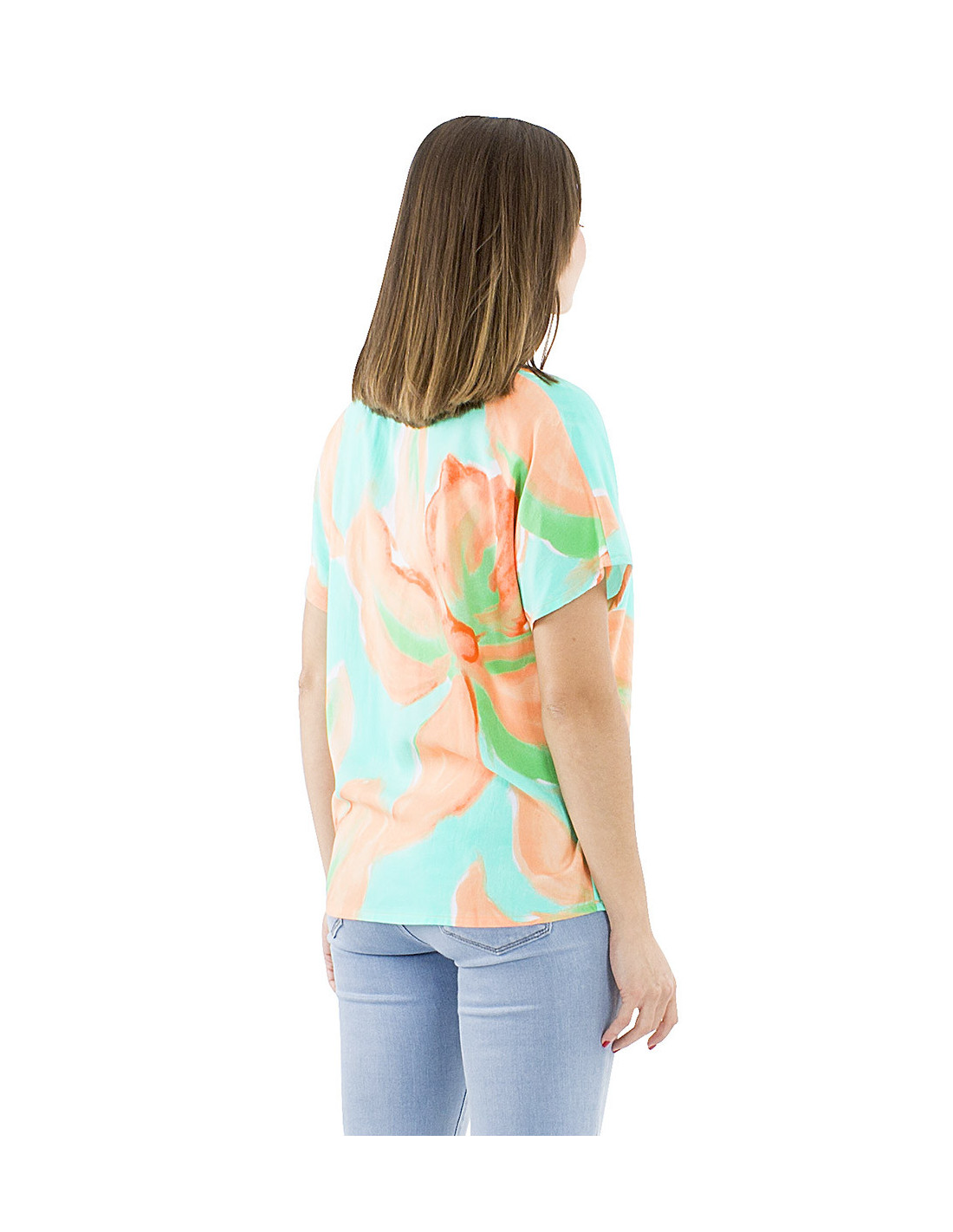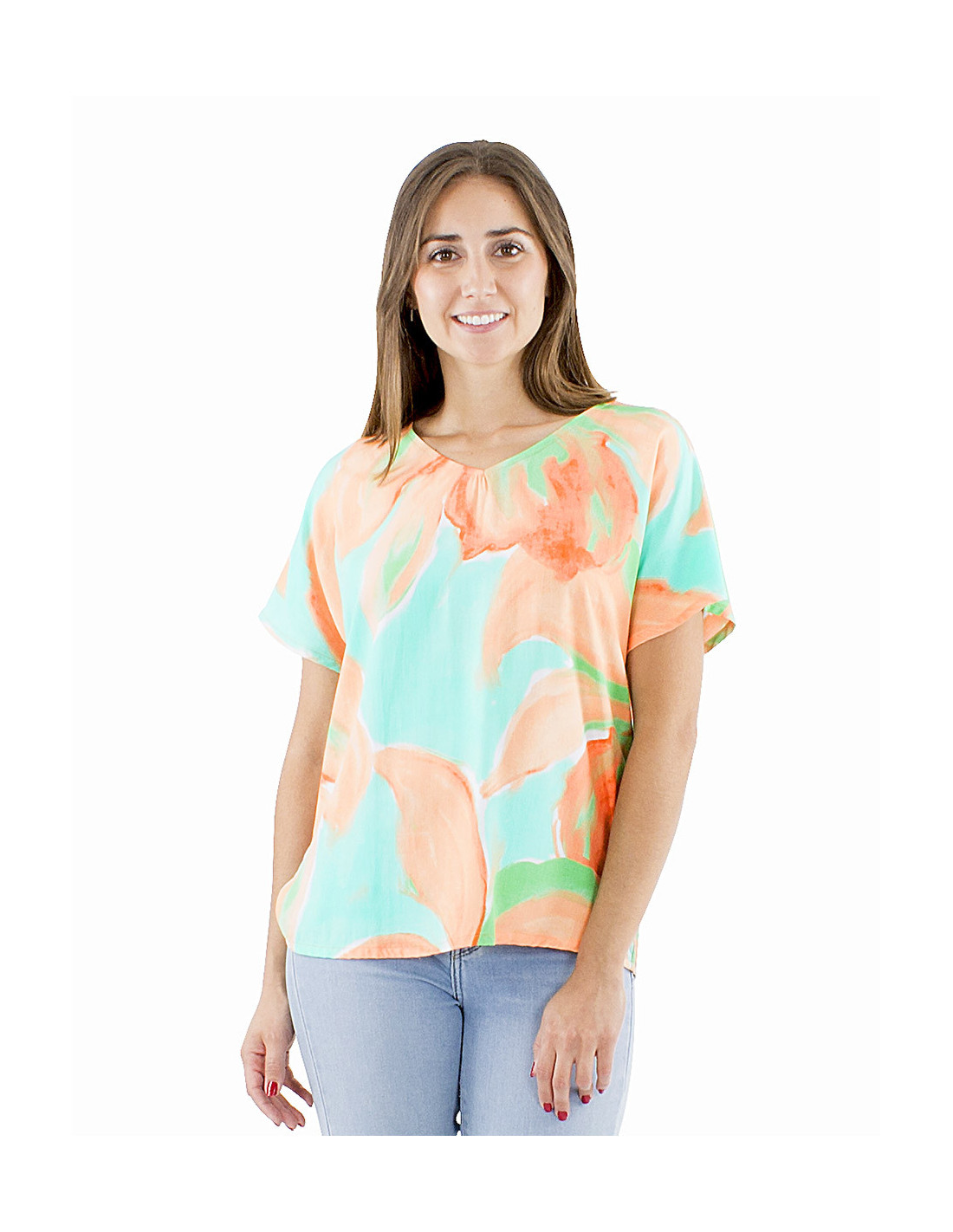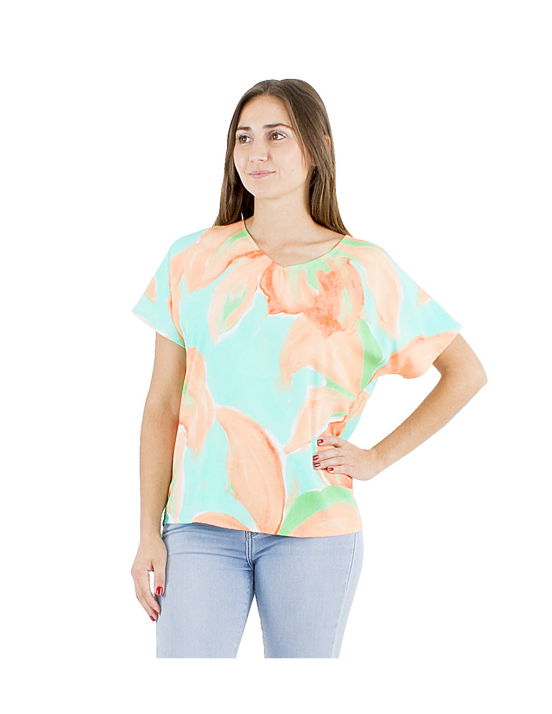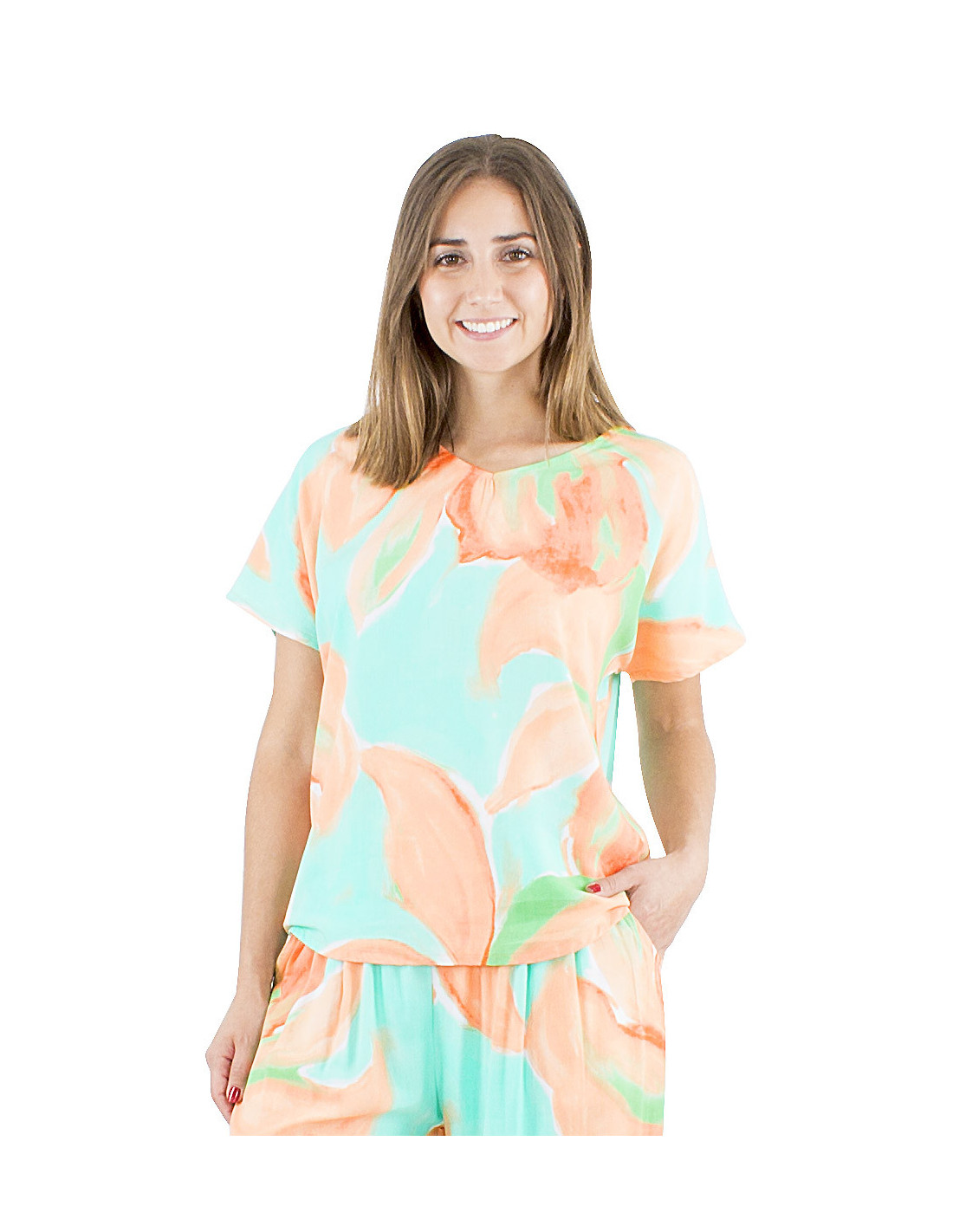 Do you love original, artistic, and colorful patterns ? Then you'll adore this summer top : an XXL floral print in pastel shades that gives it a slightly abstract and poetic style, all in a simple and comfortable cut. This short-sleeved top is roomy enough for guaranteed comfort, made from a fluid and soft-to-the-touch fabric, with a discreet round neck to balance the bold and original pattern. And for those who love the total look the matching pants and shorts are also available in the same print in blue and orange. The top comes in sizes S to 3XL to suit all body types.