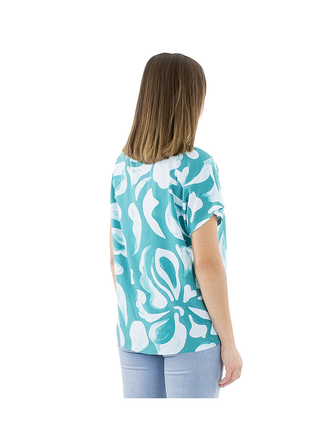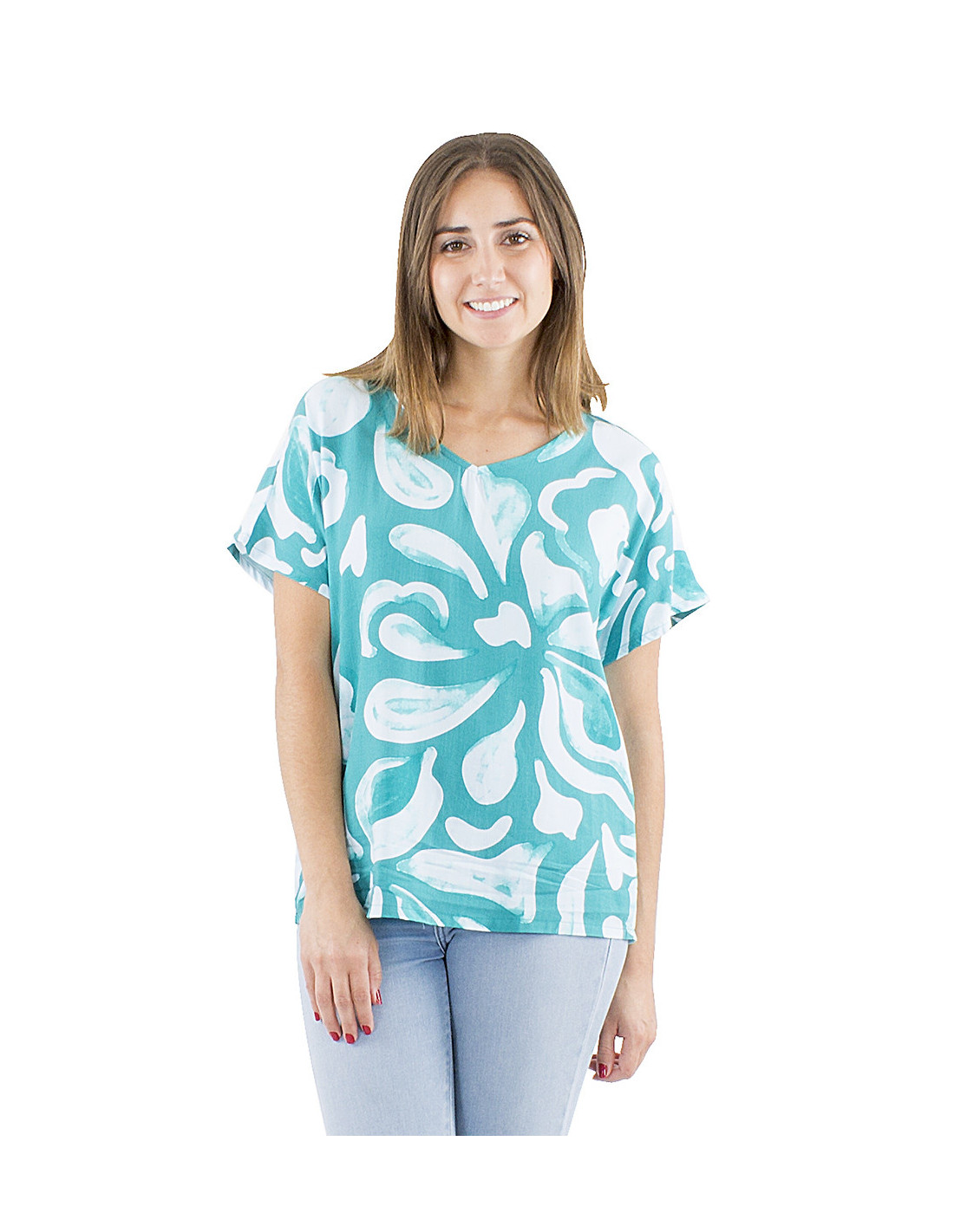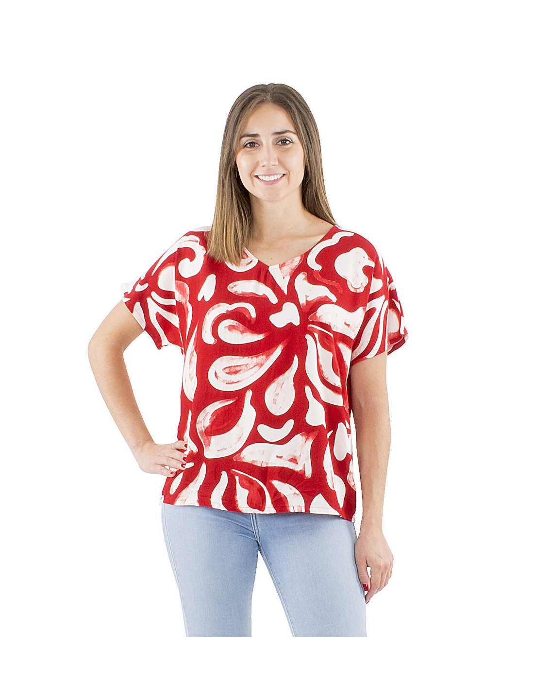 Flowy women's blouse with an original, bohemian print : We're smitten with this oversized pattern, an original design with slightly abstract, curved lines reminiscent of broad brushstrokes in a fluid movement. Choose from a vibrant red or a striking emerald blue. This piece is sure to turn heads and will guarantee comfort and lightness all day long thanks to its loose fit, fluid drape, and unparalleled softness. The subtly V-neck adds a touch of femininity. Find this summer top in sizes S to 3XL, suitable for all body types.
