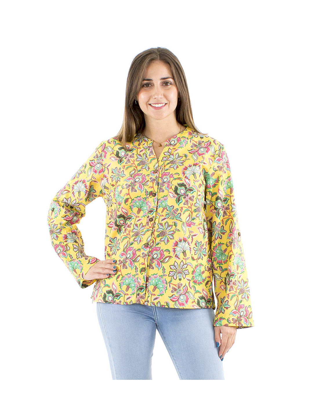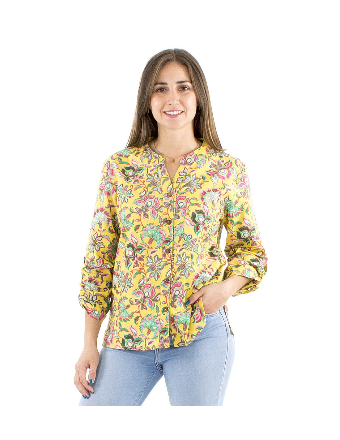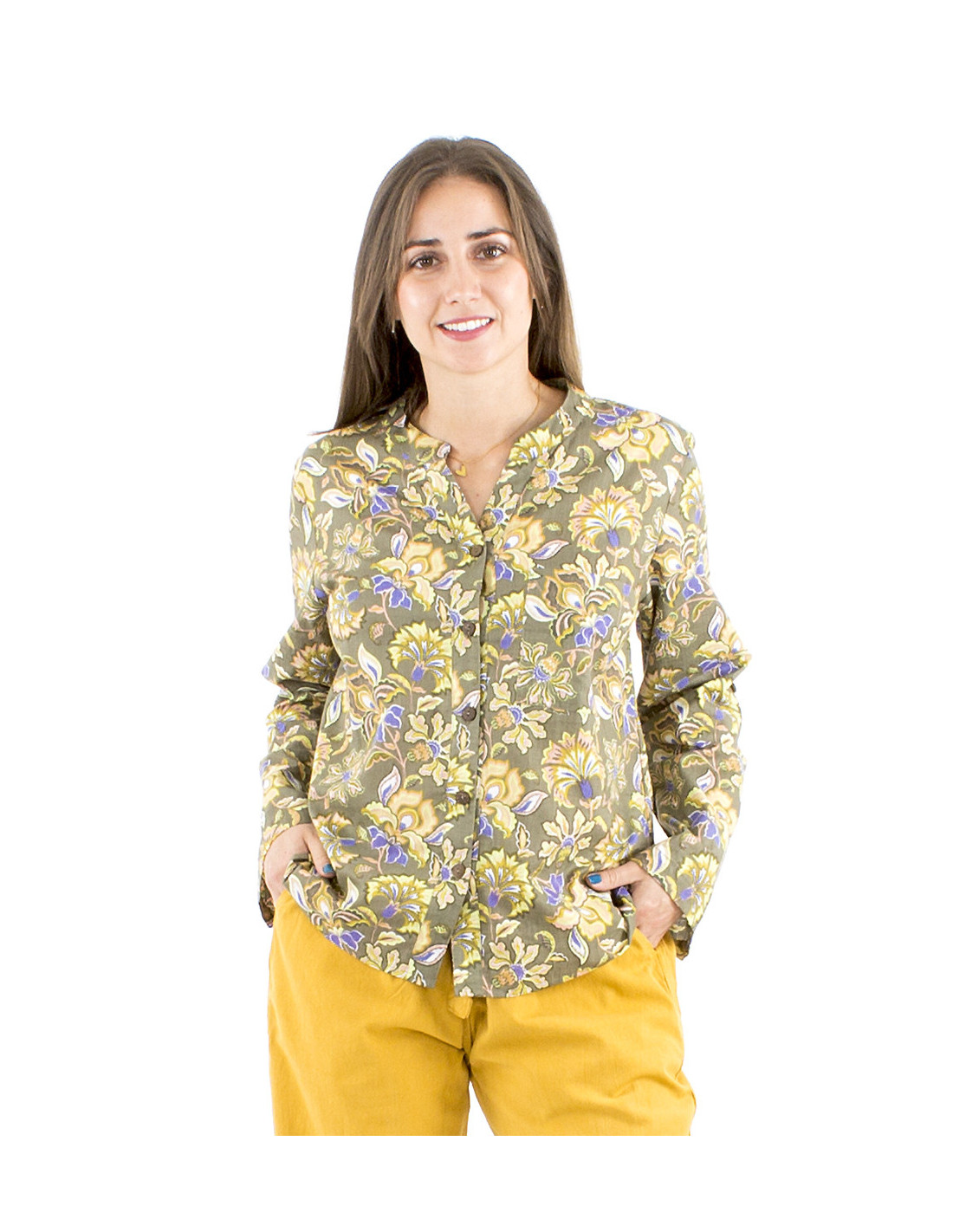 Women's bohemian blouse in 100% cotton : We love this rich and colorful ethnic-inspired print, adorned with baroque-style flowers that transport us to an artistic world and inspire wanderlust. This straight yet loose cut ensures maximum comfort, with a small V-neck enhanced by rounded Mao-style trim and adjustable sleeves to adapt your outfit to the season. In short, an original and versatile piece, suitable for all body types and styles. Available in three colors, from S to XXL.