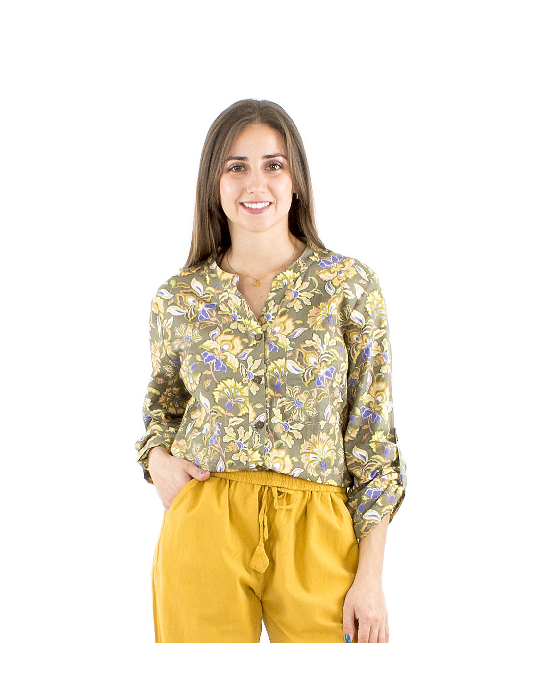Women's bohemian blouse in 100% cotton : We love this rich and colorful ethnic-inspired print, adorned with baroque-style flowers that transport us to an artistic world and inspire wanderlust. This straight yet loose cut ensures maximum comfort, with a small V-neck enhanced by rounded Mao-style trim and adjustable sleeves to adapt your outfit to the season. In short, an original and versatile piece, suitable for all body types and styles. Available in three colors, from S to XXL.