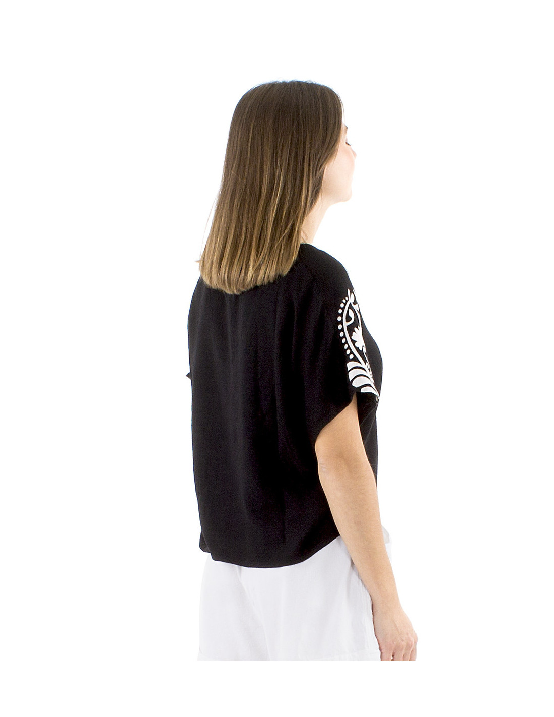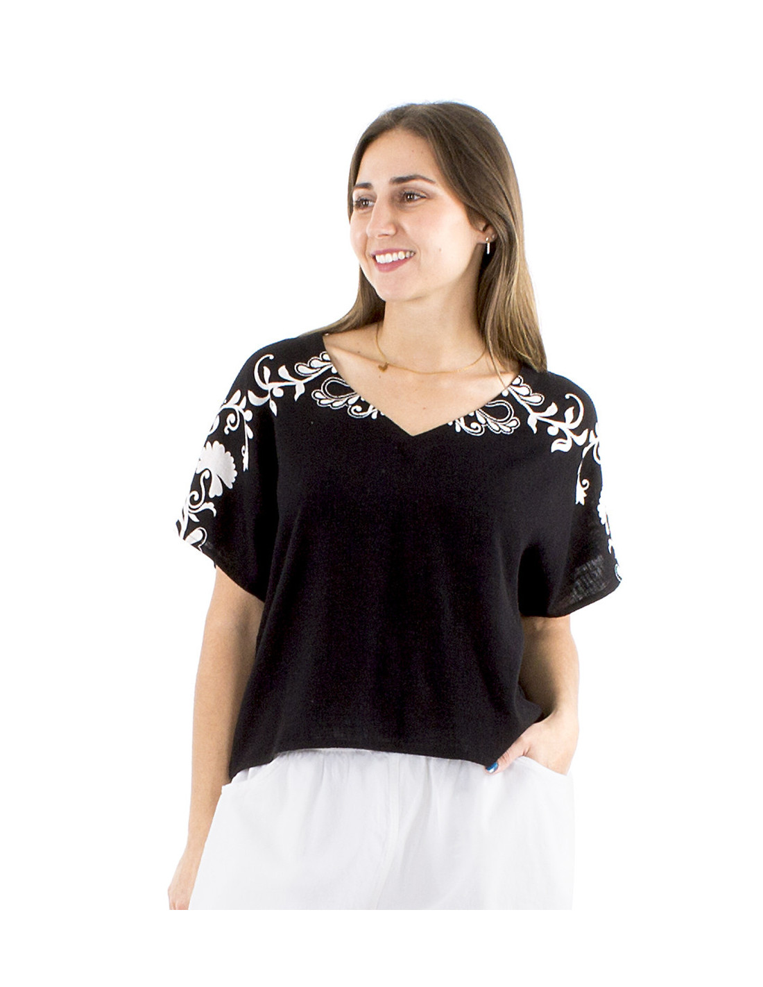 Oversized short-sleeved gypsy-style top : The bohemian blouse reimagined, featuring an original baroque motif along the shoulders and sleeves, a loose, comfortable fit, all in black and white for a guaranteed boho-chic look. Made from 70% viscose and 30% linen for a fluid and natural feel. Available in sizes S to XXL, for all body types.