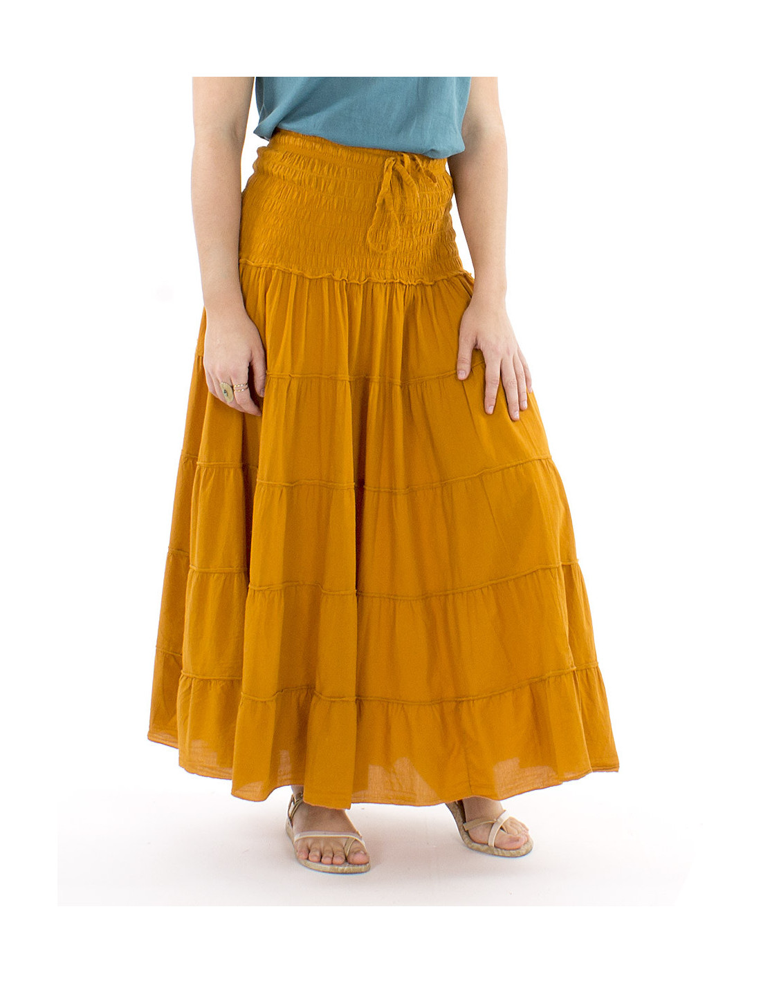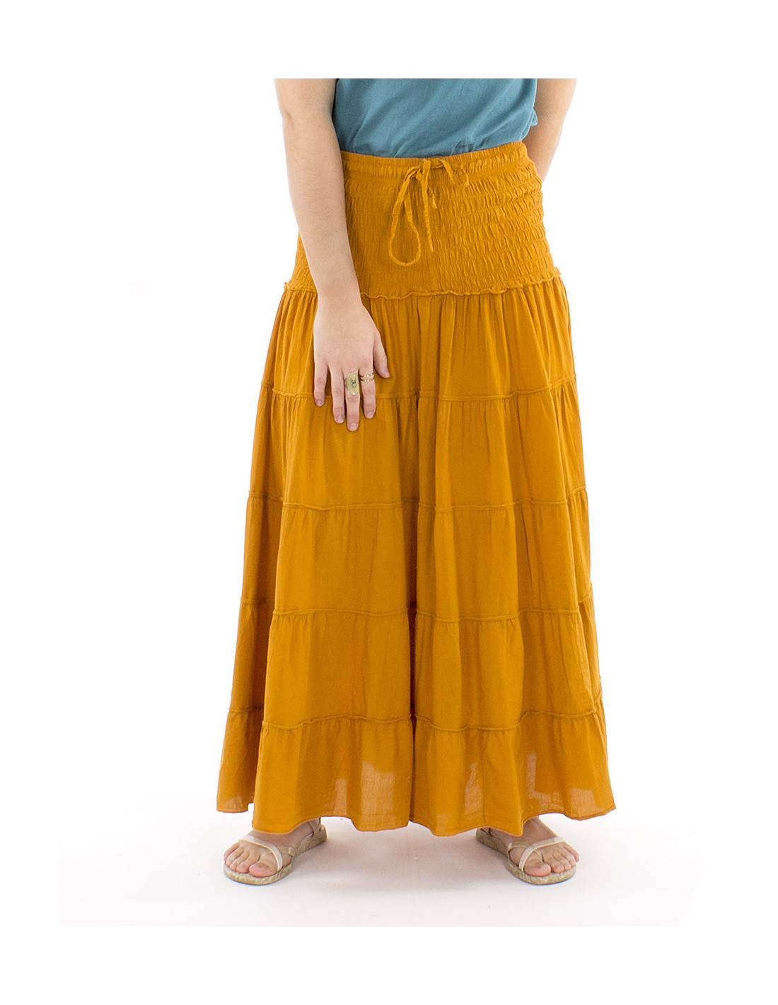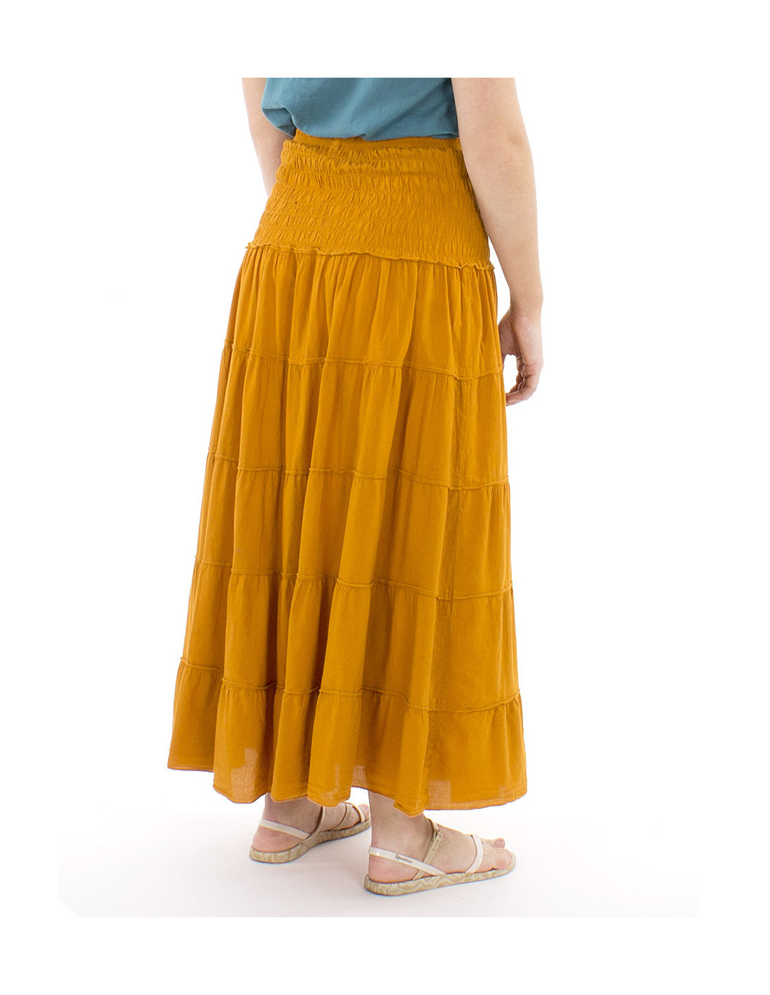 Long, ruffled, solid-color skirt in 100% cotton : The quintessential bohemian skirt, original with its variety of available colors, mint, mustard, fuchsia, petrol blue, or simply black to go with everything, it's especially comfortable thanks to its smocked waistband. This skirt adapts to your body shape, not the other way around ! A must-have in every color if you're a dopamine girl !