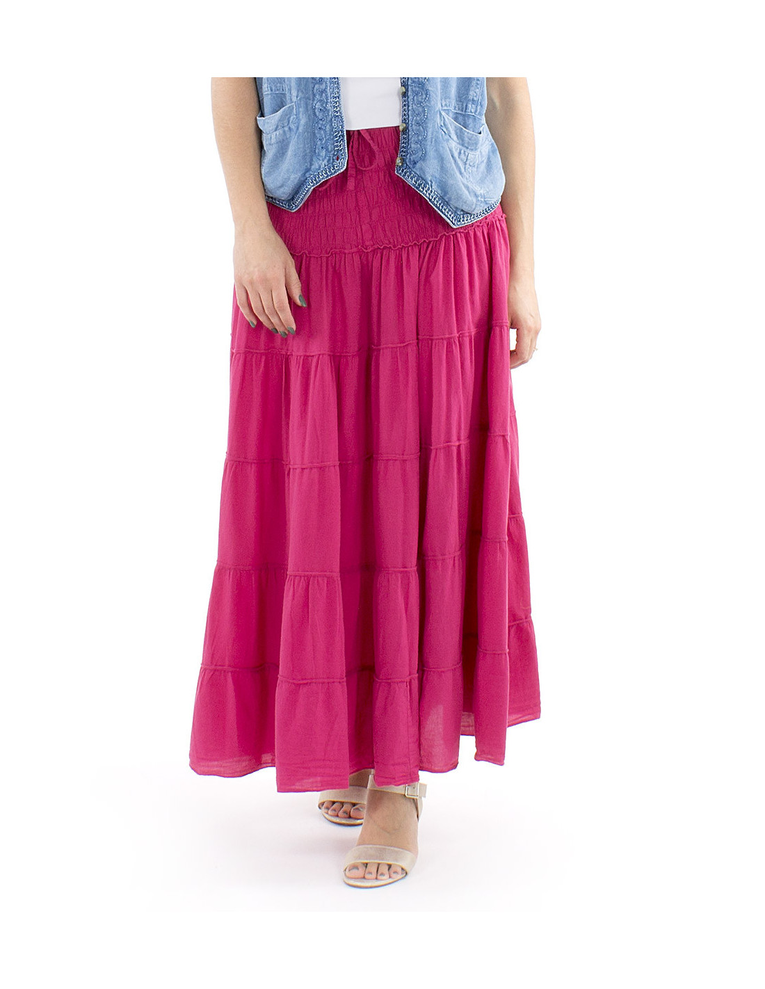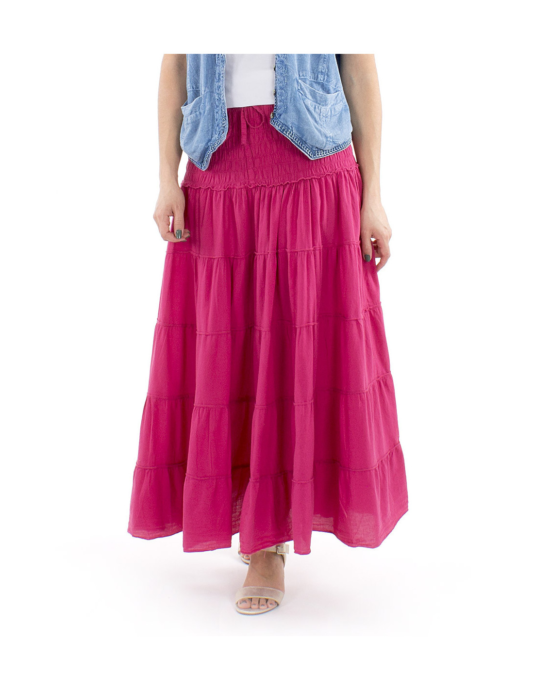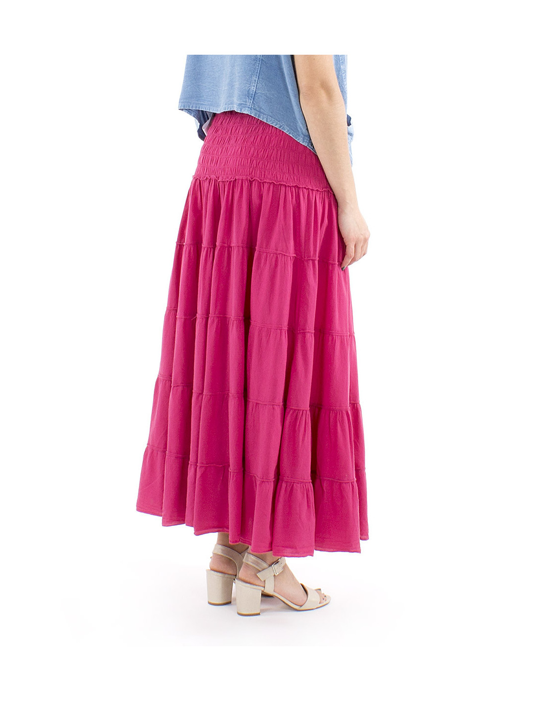 Long, ruffled, solid-color skirt in 100% cotton : The quintessential bohemian skirt, original with its variety of available colors, mint, mustard, fuchsia, petrol blue, or simply black to go with everything, it's especially comfortable thanks to its smocked waistband. This skirt adapts to your body shape, not the other way around ! A must-have in every color if you're a dopamine girl !