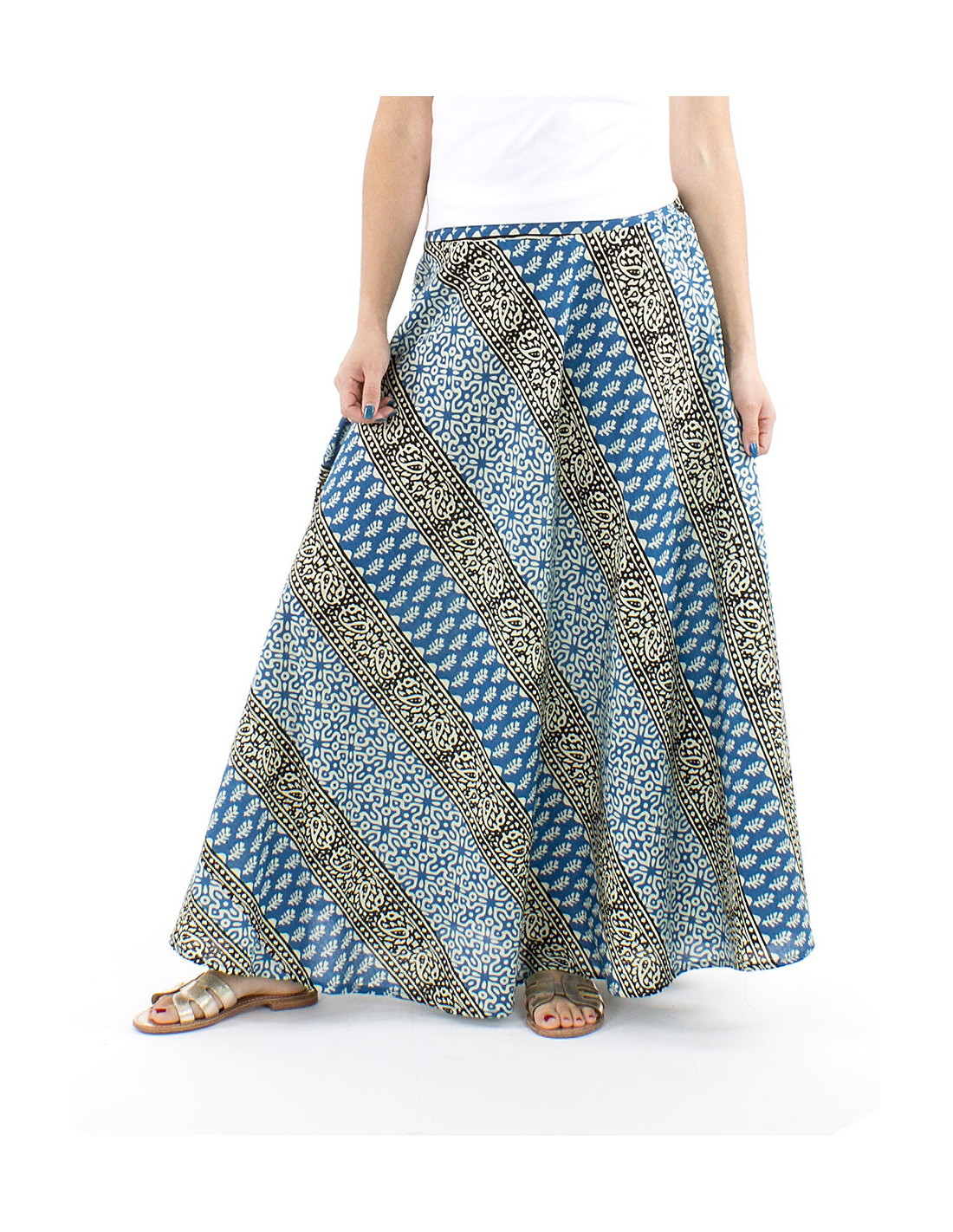 Long cotton skirt in an Indian ethnic style : fall for this original and colorful print, arranged diagonally, which instantly adds movement to this 100% cotton maxi skirt. A design inspired by Indian batiks, a flared cut at the bottom for a feminine and bohemian silhouette, and what's more, a smocking panel at the back waist for better support without sacrificing comfort, a skirt that adapts to your changing body throughout the year, not the other way around.