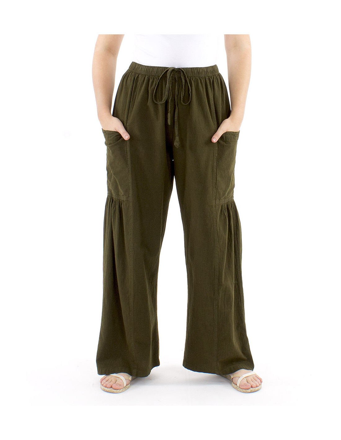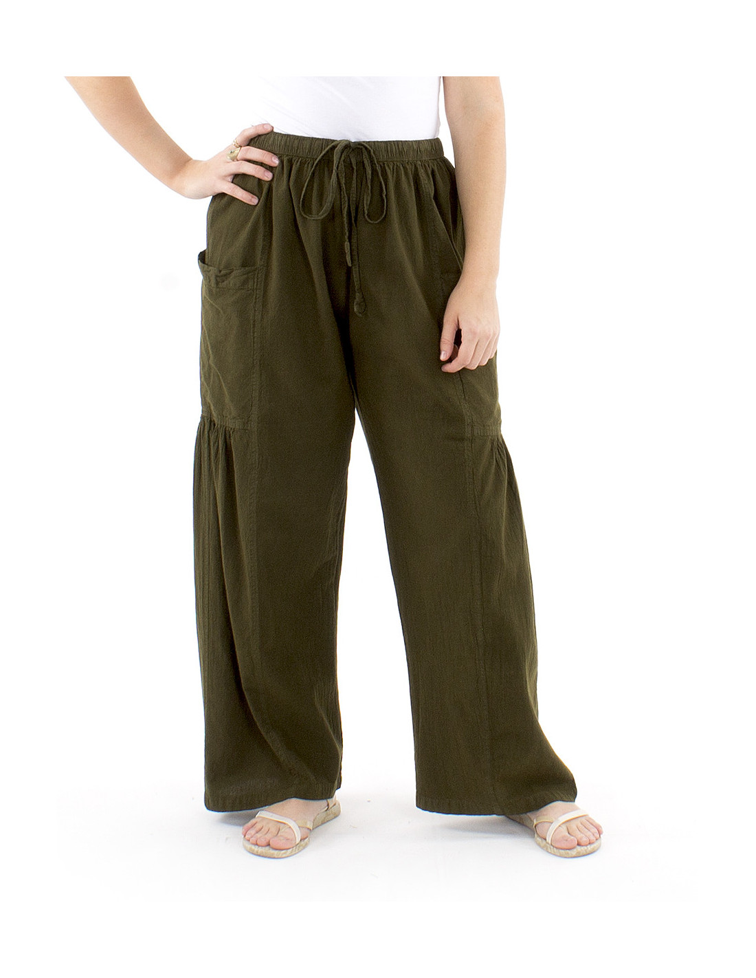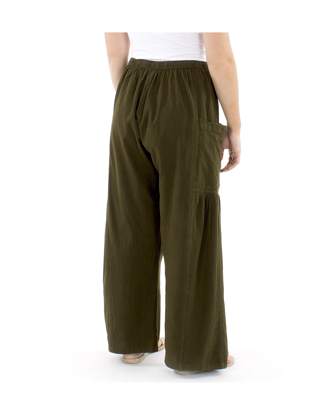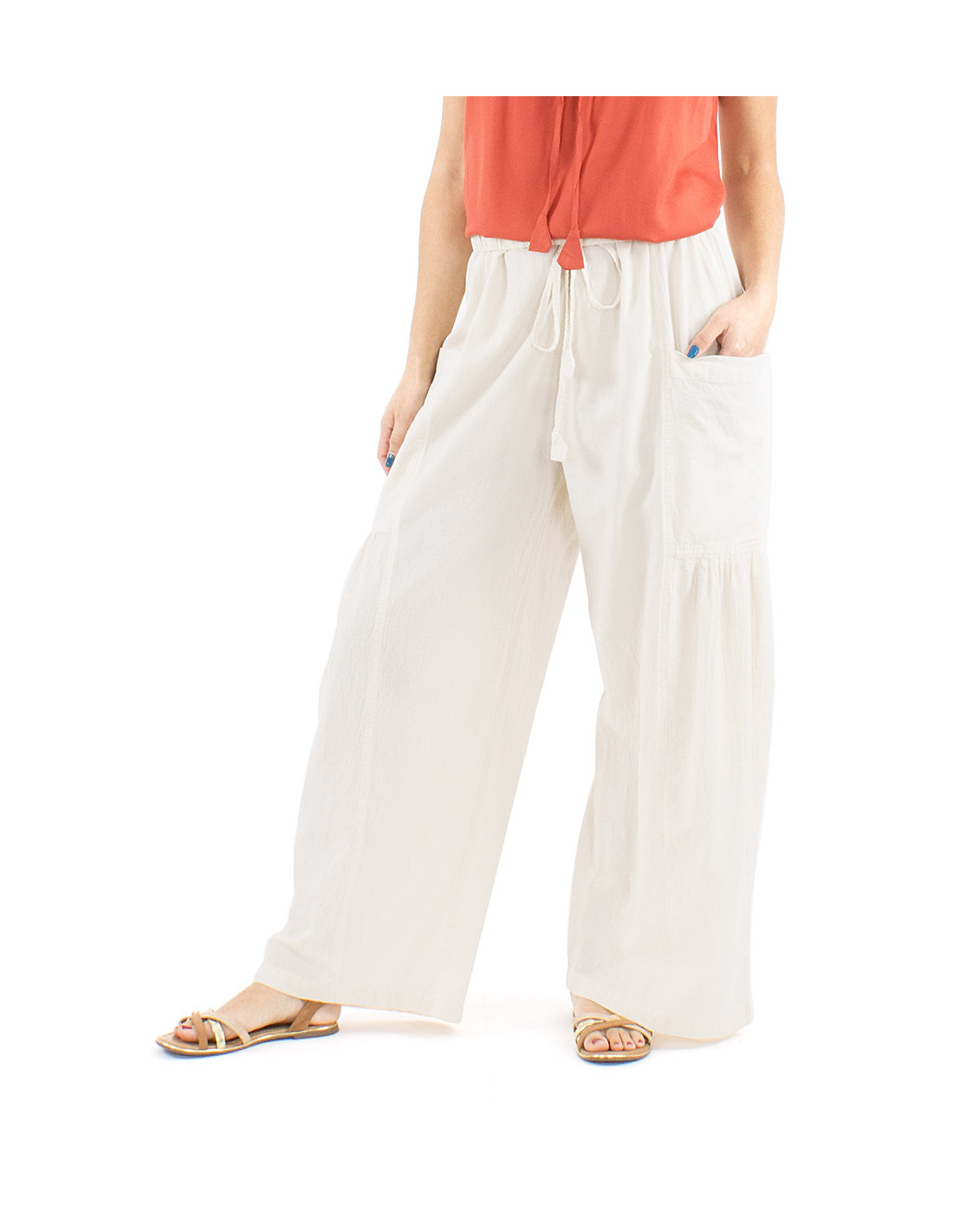 Original 100% cotton trousers : wide-leg trousers in plain cotton, with pockets, gathers at the pockets to create a play of volume, an elasticated waistband, and ties at the waist. A bohemian and original piece, perfect for a relaxed, bohemian chic look. Available in 5 different colors, sizes S to XL.
