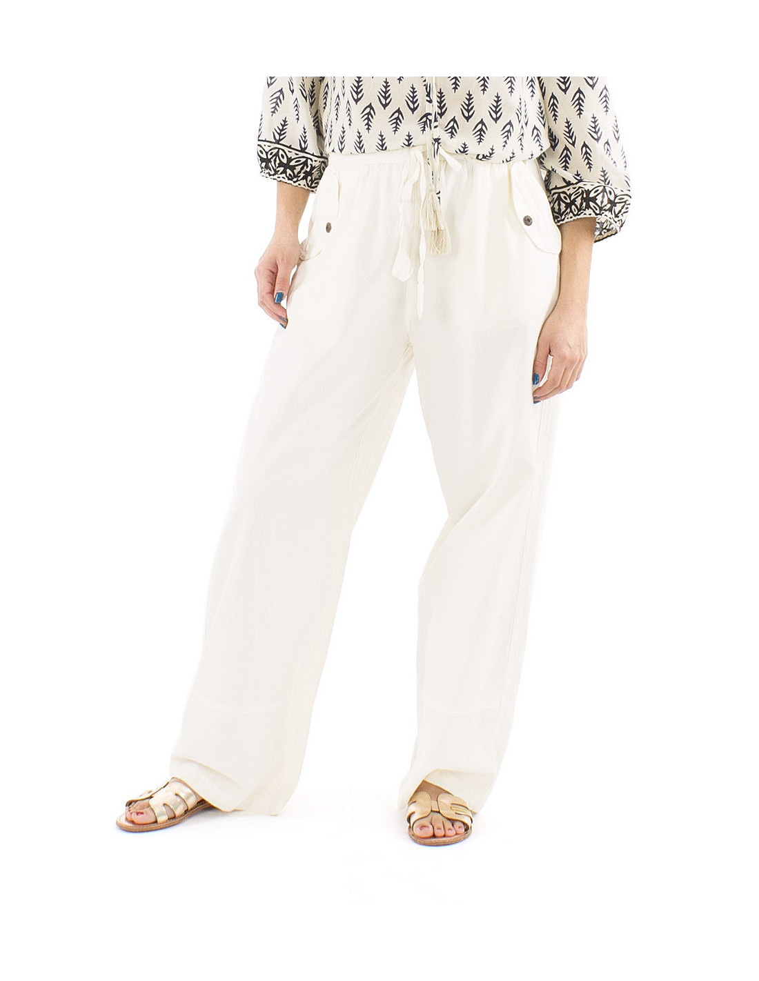 Plain 100% cotton trousers, wide straight leg : fall in love with these 100% cotton trousers, ideal for the summer season, comfortable with their wide leg and elasticated waist, and original thanks to their flap pockets and coconut wood buttons. Available in 4 different colors, sizes S to XL.