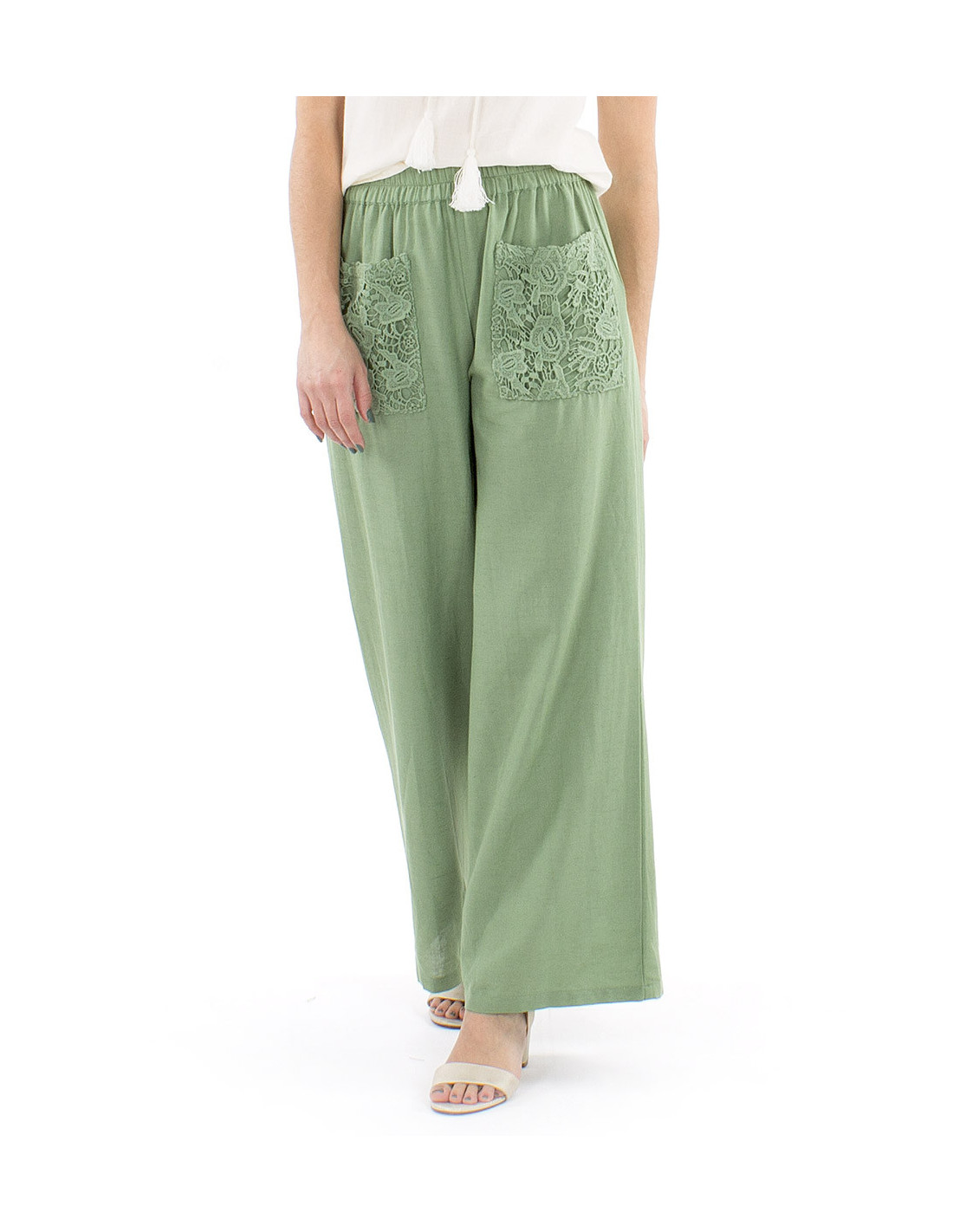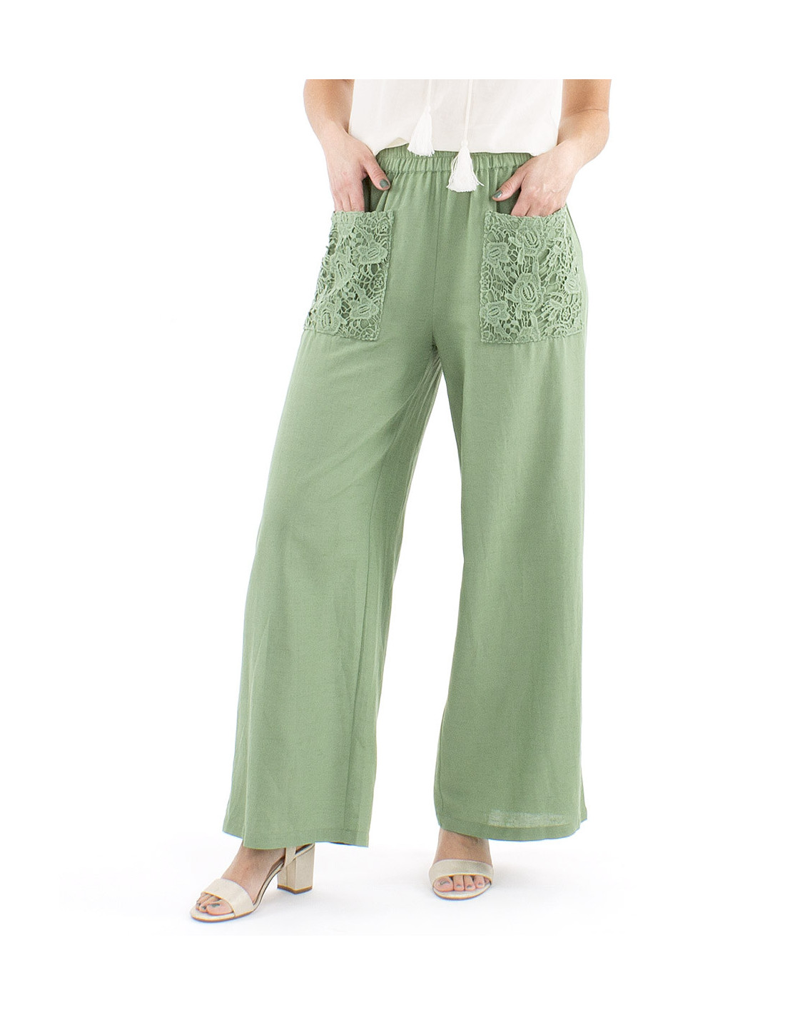 Bohemian chic trousers with embroidery : Be original and unforgettable with these elegant, straight-leg trousers. Their lace pockets add an effortlessly chic, bohemian touch, while the elasticated waist ensures all-day comfort. Perfect for any occasion, from city life to holidays, these trousers are fluid and comfortable thanks to their 91% viscose and 9% linen composition. You won't want to take them off. Available in 3 different colors, sizes S to XL.