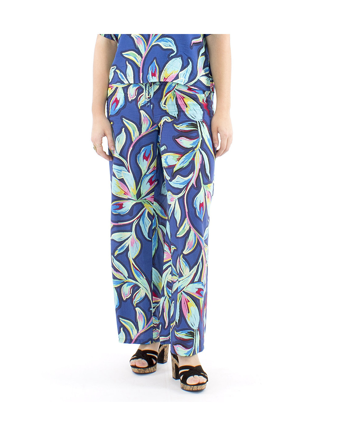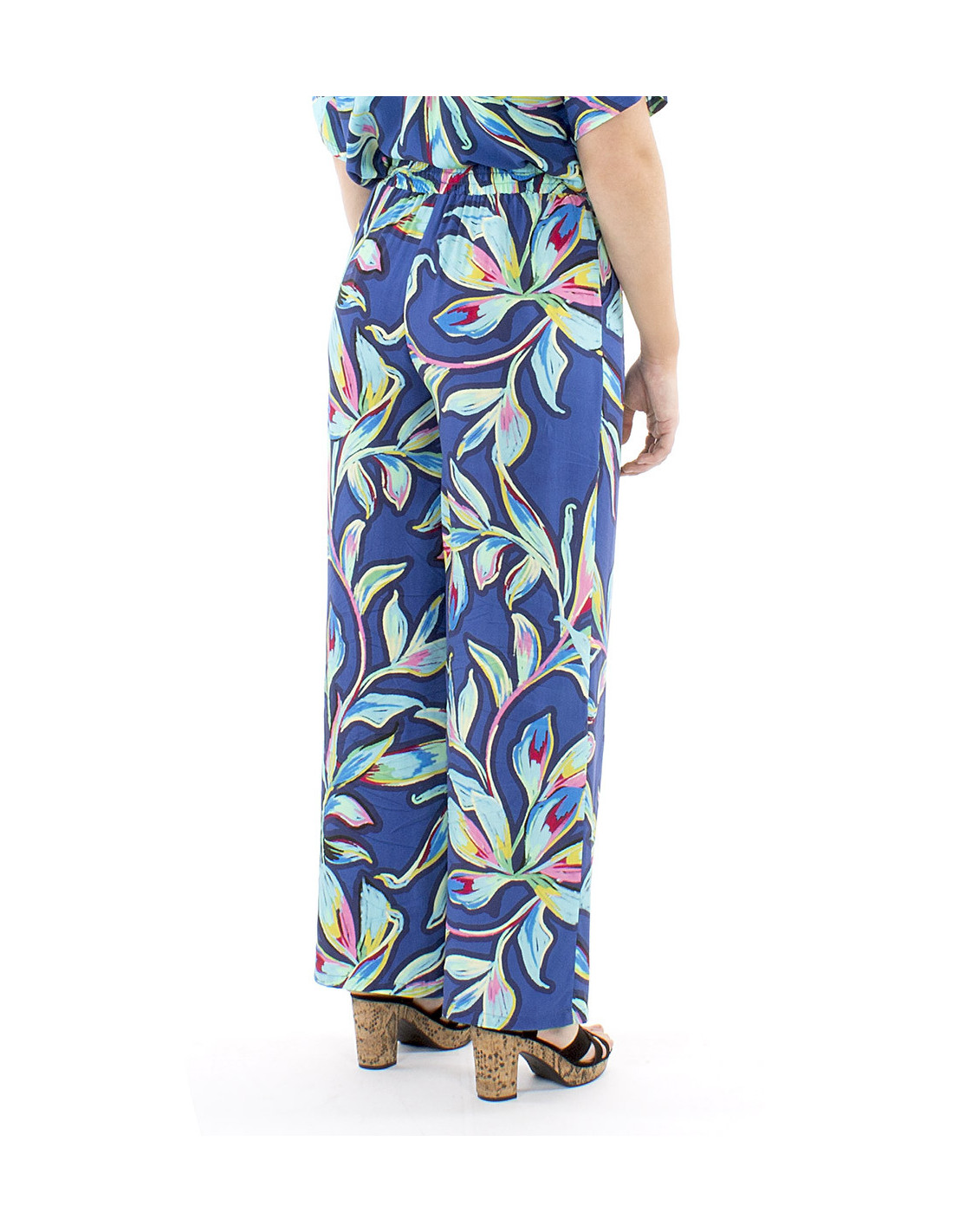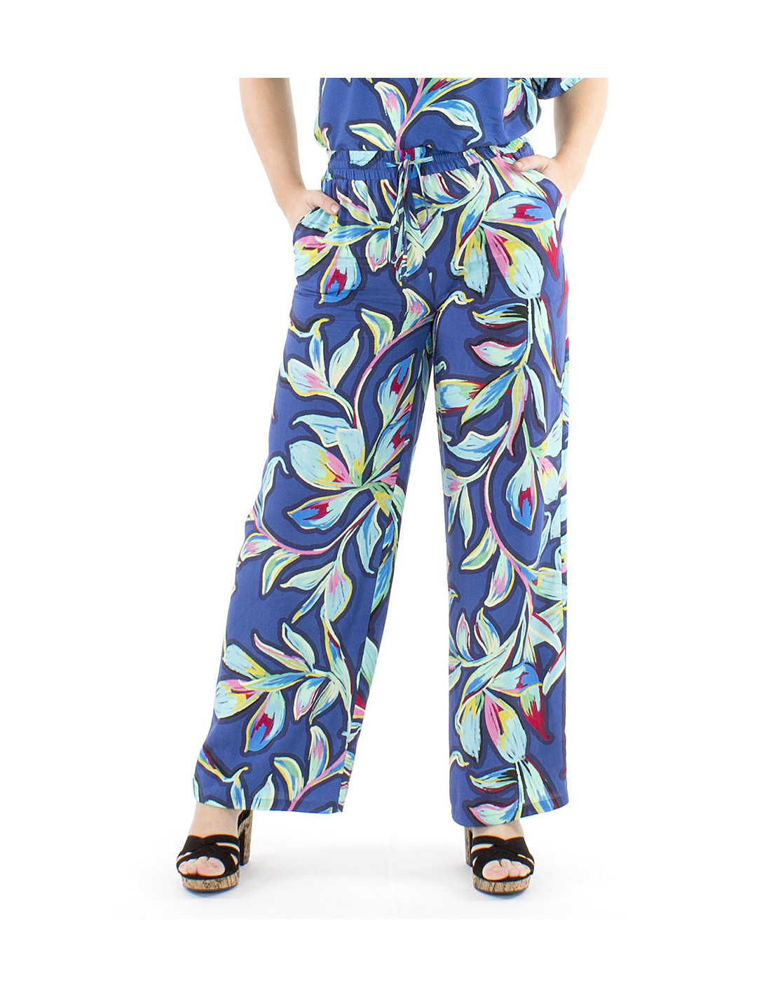 Colorful tropical print palazzo pants : The palazzo cut is ideal for those who want an elegant outfit without necessarily choosing a dress or skirt. Straight and wide, it guarantees optimal comfort. And because at Coline, we never sacrifice comfort for style, our palazzo pants (and many others) are all designed with an elasticated waistband. They also feature drawstrings to adjust the fit and pockets for added convenience. The trendy XXL floral print will give your outfit a boost with its vibrant color gradient, available in red or blue, from S to XL.