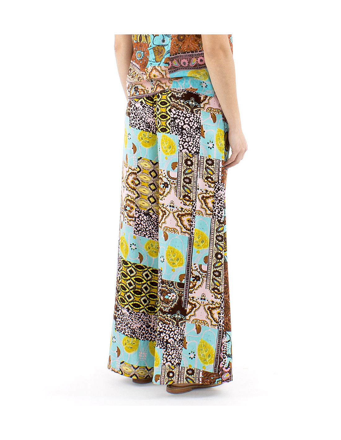 Wide-cut palazzo pants with an original pattern : fall for this ultra-colorful patchwork design, inspired by African motifs. You'll love its blend of vibrant blue with shades of brown and yellow. They feature a flared leg and a matching fabric belt to tie at the waist, which is elasticated for maximum comfort all day long. Available in sizes S to XXL to suit all body types.