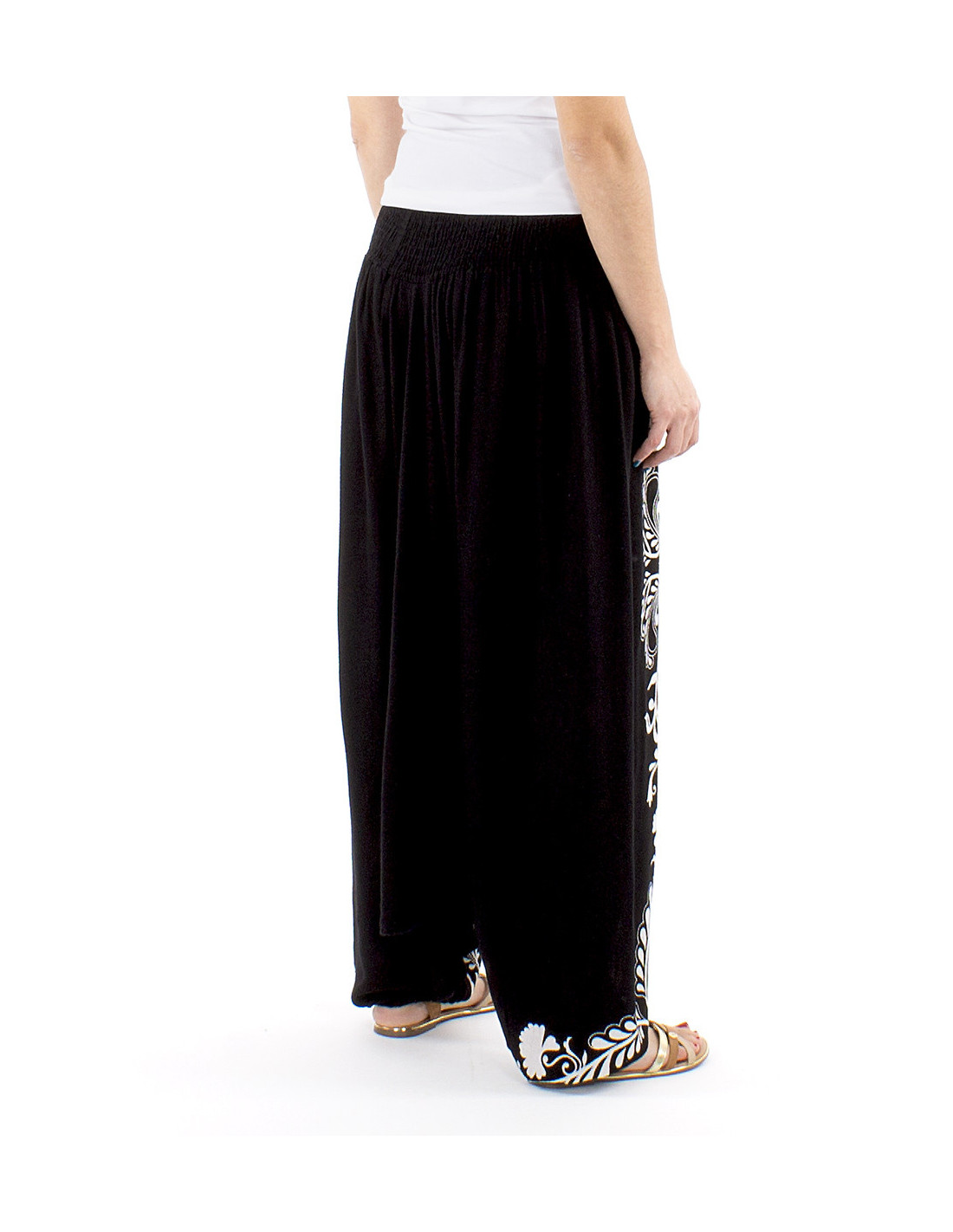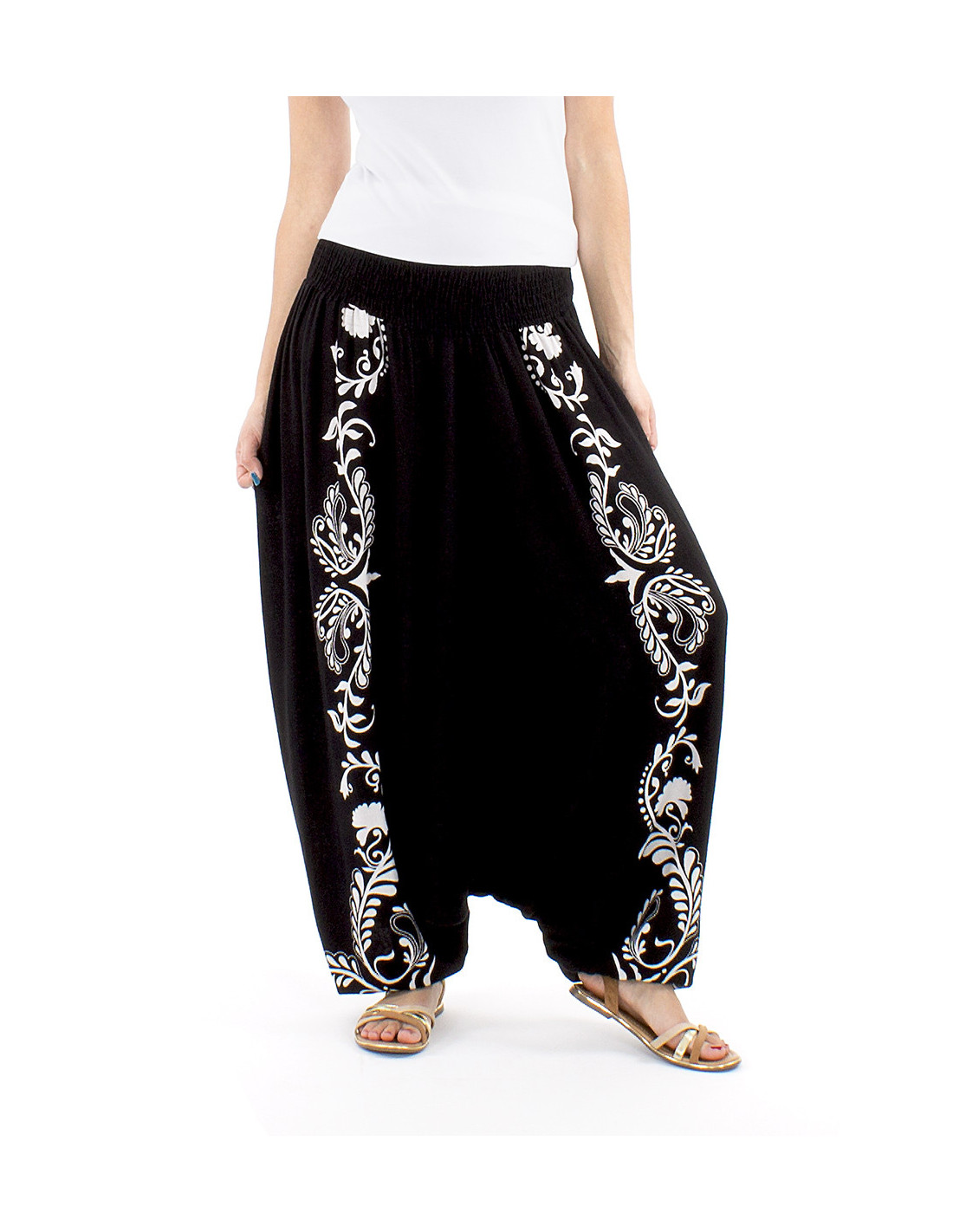 Bohemian Gypsy Print Harem Pants : You'll love the unparalleled comfort of these low-crotch harem pants, the unmatched freedom of movement, and the pleasant feel thanks to the blend of 70% viscose and 30% linen. The white-on-black pattern of various plant shapes reminiscent of arabesques instantly transports you to a bohemian atmosphere and takes you on a journey. The elasticated waistband is an added comfort feature you're sure to appreciate.
