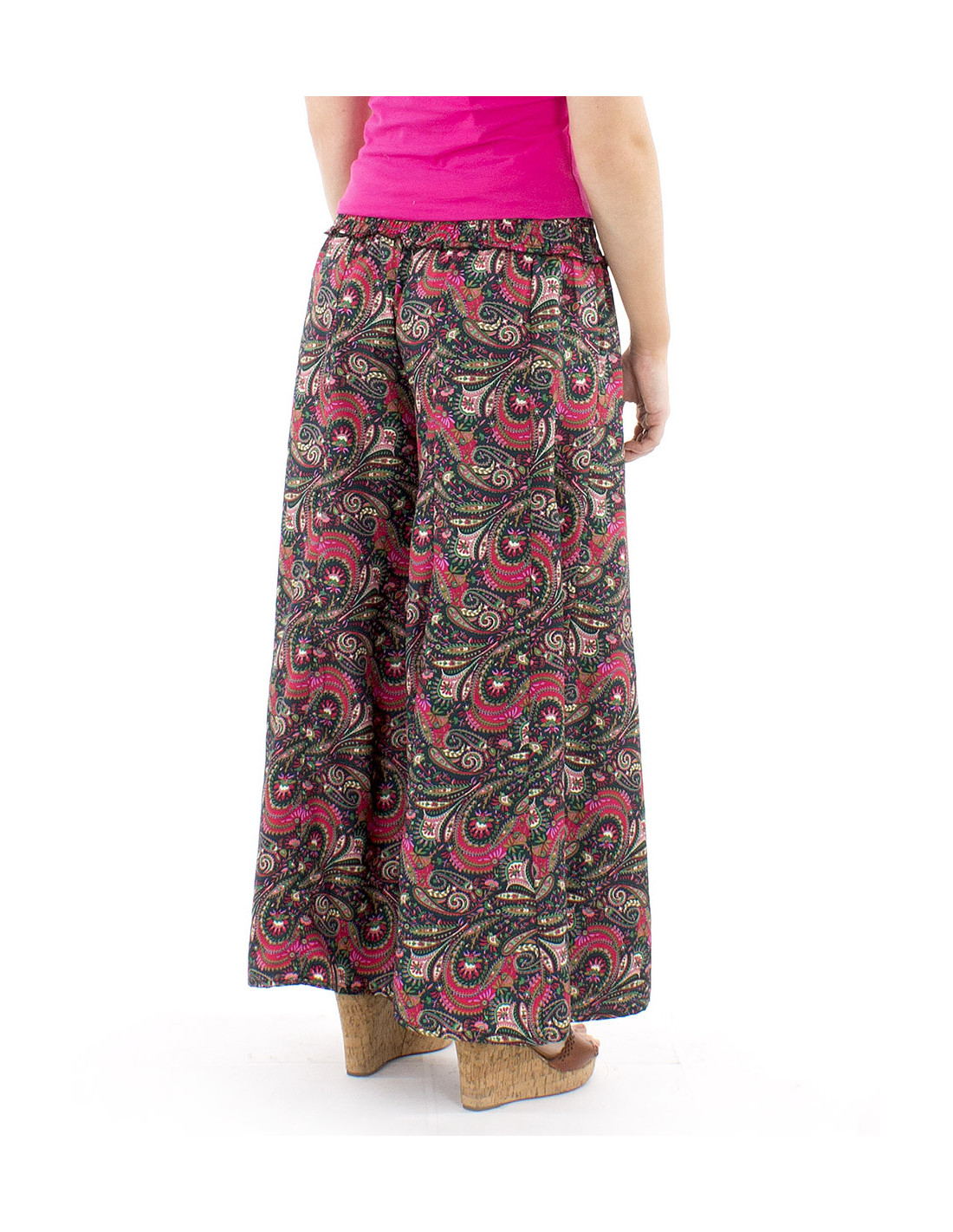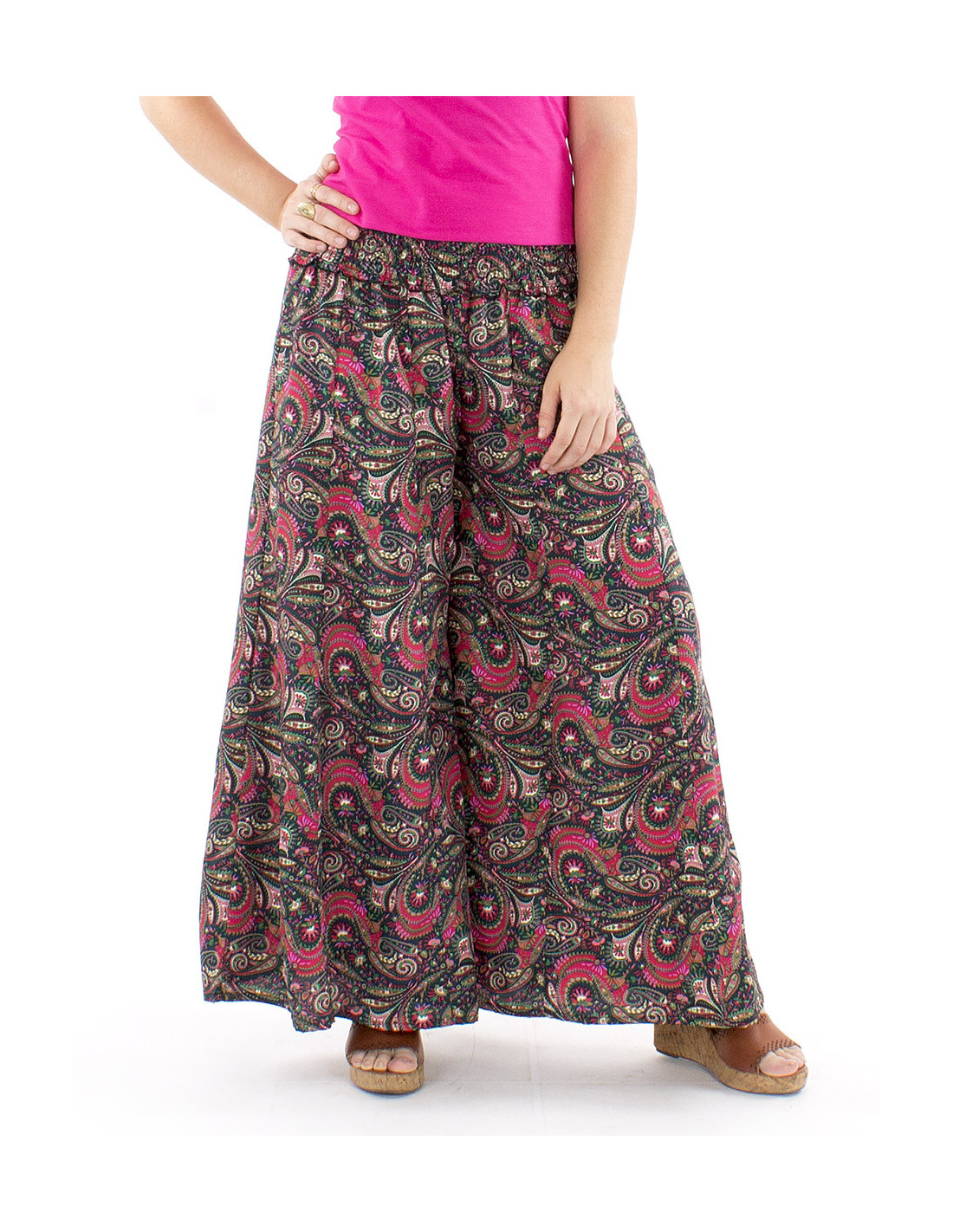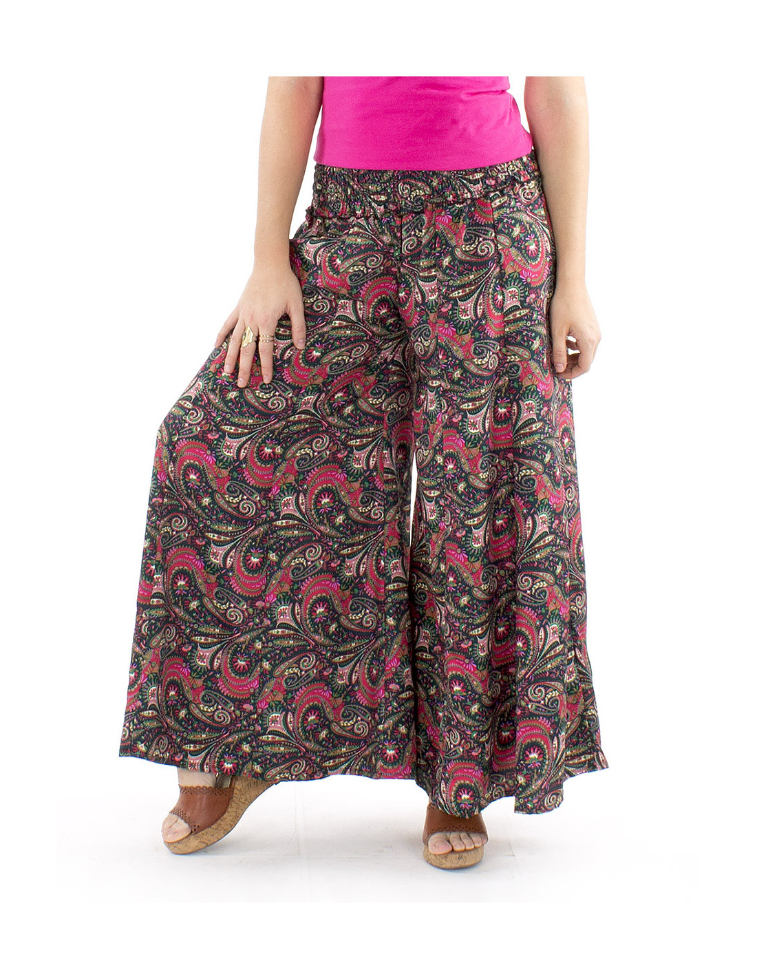 Oversized trousers with an Indian sari print : the extra-wide cut of these trousers is your greatest comfort asset. The smocked waistband ensures you feel at ease in any situation and regardless of your body shape, curvy-friendly trousers that flatter every woman, whatever her figure. Colorful and original with its paisley print available in various colors, it also boasts a fluid and lightweight drape without being see-through. Available in sizes S to XL.
