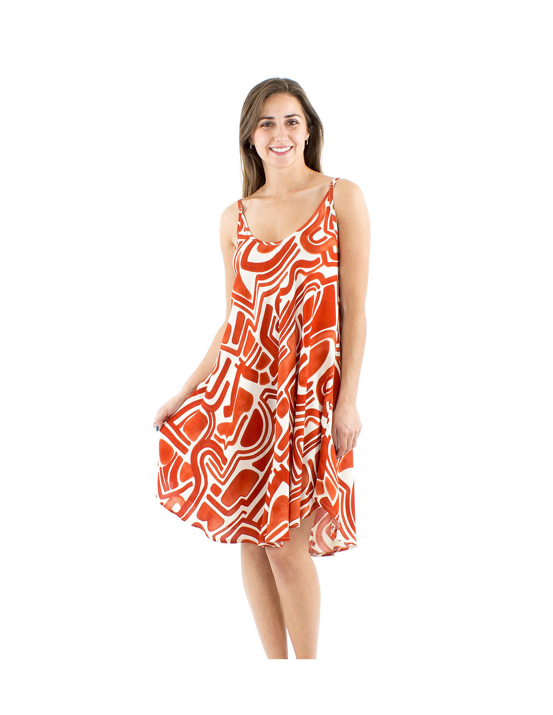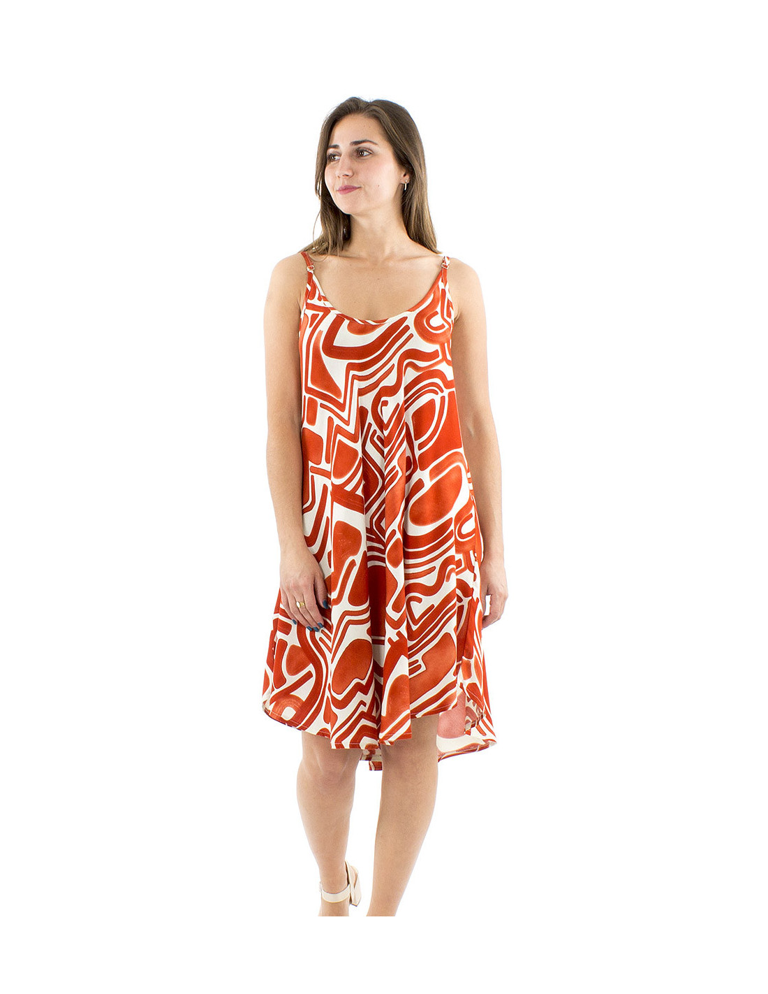 This flowing, wide-leg mini dress with straps features an original boho-ethnic print, thin straps, and an umbrella-style cut, making it a truly exceptional piece ! Easy to wear, it's a statement piece in itself. Its fluid drape ensures an elegant and sensual look, and you'll appreciate its soft feel and lightness on hot summer days. The round neckline adds a touch of sophistication, creating a discreet yet subtly suggestive low-neck. It's such a comfortable dress that you'll find it hard to take it off at the end of the day. Whether worn as a beach dress, a daytime dress, or a prom dress, this piece will become THE little dress of your summer.