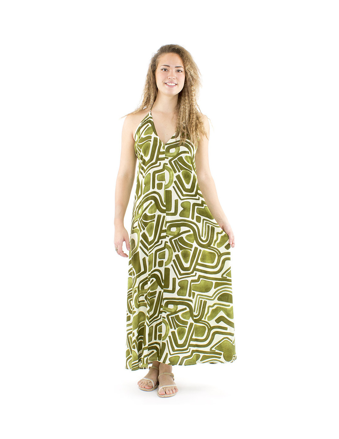Long backless dress with colorful ethnic pattern : Fall in love with this original piece of fashion, a comfy summer dress, full of sensuality with its backless cut, its long and large laces to tie in the neck that give it a sensual charm without doing too much. Made in 100% viscose for a soft touch and a fluid effect, it will follow your moves and give you the best comfort. You'll like its original colorful print inspired from the african batiks, and its discreet and feminine V-neck. Available in two colors, a terracotta rust red or a deep teal blue, depending on your preferences. One size fits all.
