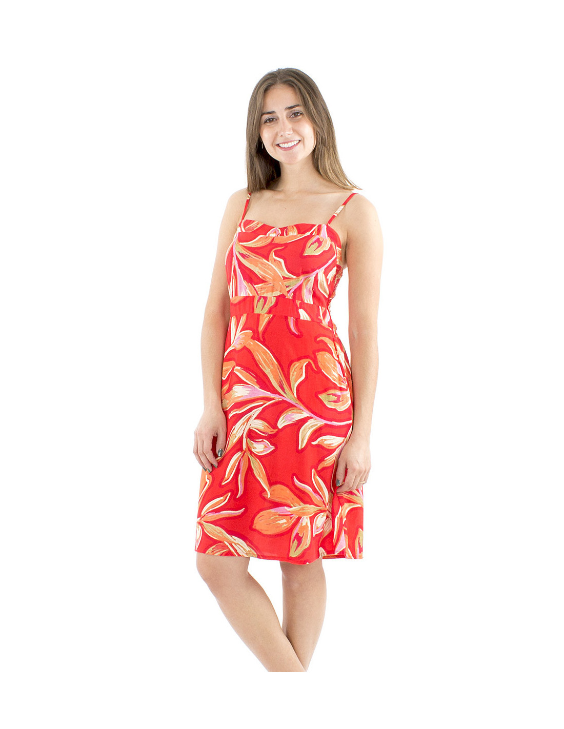 Short summer dress with an original and colorful print : this dress is a real dopamine shot with its vegetal colorful pattern, in different shades of color, very modern, made in 100% viscose, it's a fluid and light summer dress, you'll feel comfy all day long in it. A little bit fitted under the breast, it's a really feminine dress but it's still comfortable to wear thanks to its flared cut. It's thin straps will let your shoulders appear with sensuality while remaining chic and discreet. It's classical straight bust cut won't let your breast show too much and makes you feel comfortable whatever your breast size is. A dress designed to value all the type of shapes, available in deep blue or red, from S to XL.