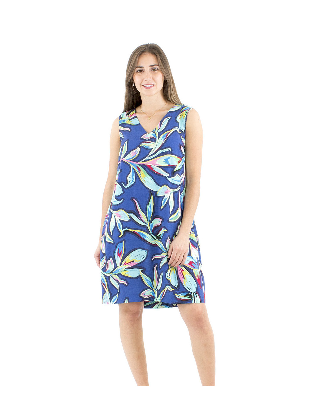 Short flared summer tropical dress : feminine, classy and full of colors, this dress is perfect for summer, to wear as an everyday dress, for any event or friends night out. A large flared cut for comfort, a really feminine V-neck and an original modern tropical print, full of different shades and colors, that put us in a tropical mood, like if you were in the west indies, along the beach watching the ocean. Fluid and soft to touch, you will feel like if it is a second skin. To wear as much as you want, available in red or deep blue, from S to XL.