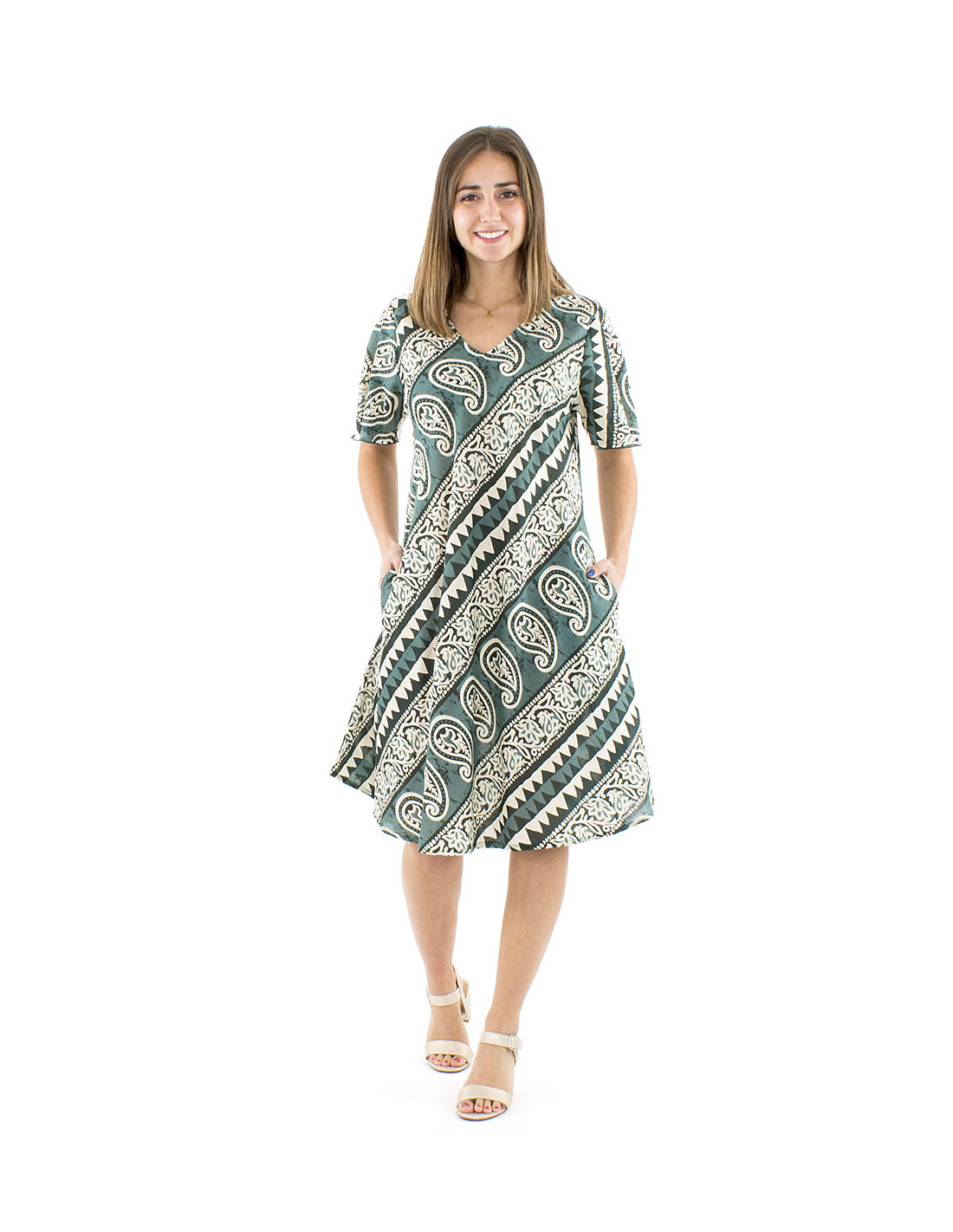 Original flared cut short ethnic dress 100% cotton : this model of summer dress in cotton will marry ease and originality with its modern paisley pattern and its graphic designs placed in an asymetrical way. A disruptive piece, inspired from east asian countries, with a feminine and comfy cut which will please your bodyshape. Its 100% cotton fabric add to this little summer dress charm, a light and comfortable fabric to wear, a natural touch for optimum ease. This short summer dress has two side pockets for practical use and coolness. Find it in two different colors, from S to XL.