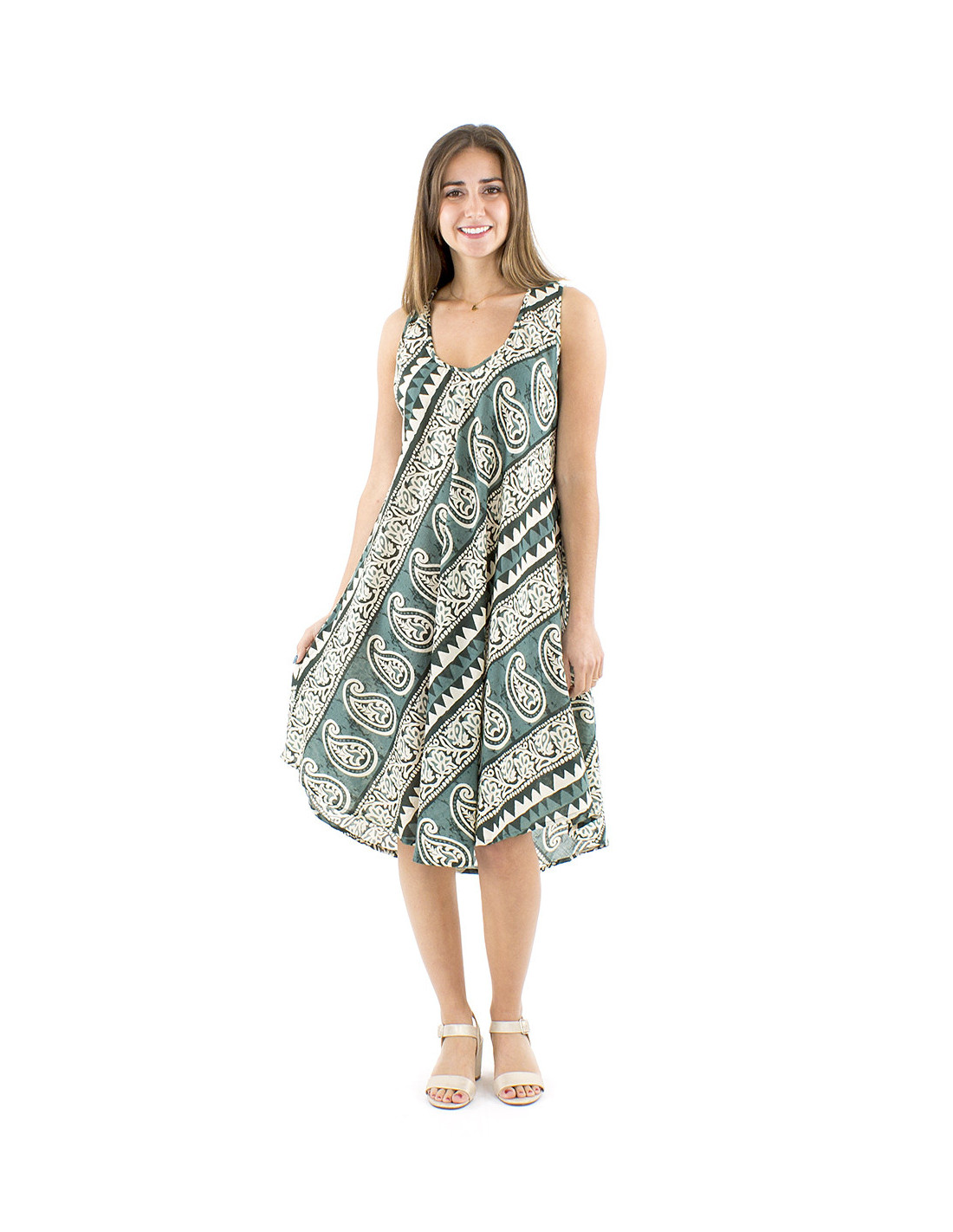 Cotton summer dress with an umbrella cut and ethnic design : the umbrella cut is a pleasant cut for every kind of bodyshape, perfect to wear in summer, it allows your body and your skin to breath freely while being feminine and original. Fall in love with this ethnic pattern, a neo paisley pattern, a pattern that comes directly from India and east-asian countries, and its graphical designs placed in diagonal for an instant stylish effect. Its large straps will assure you comfort, and its round neck cut will fit to every size of breast. Look closer to its round cut at the bottom of this summer dress, which brings a little more of softness and femininity. Choose between the green or the red one, from S to XL.