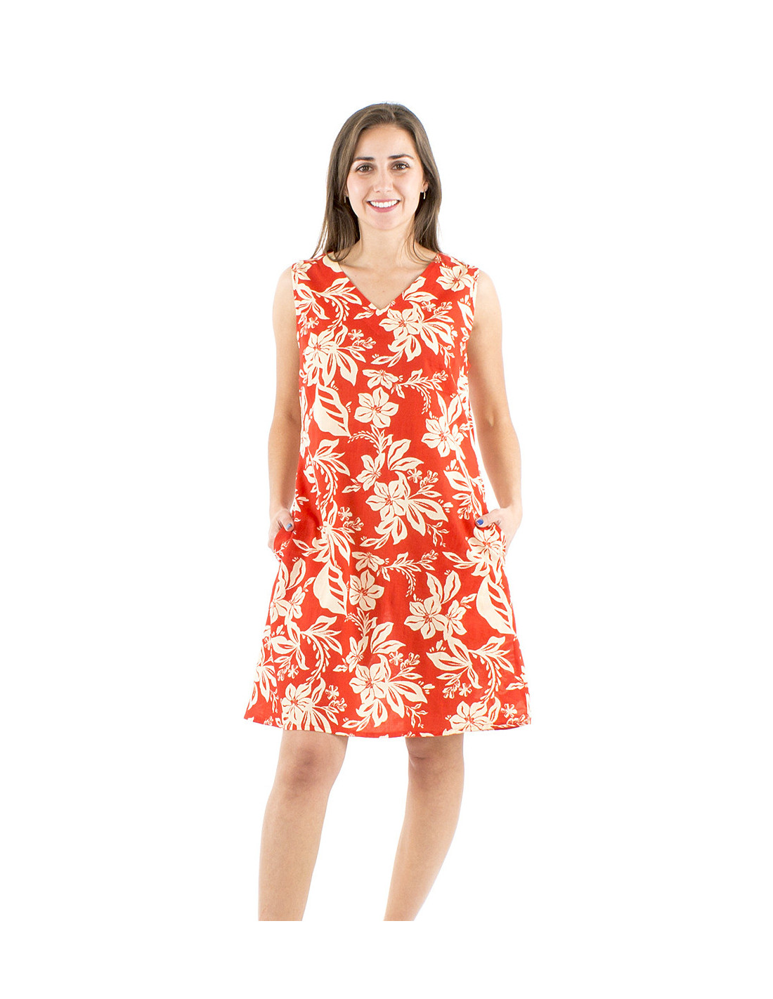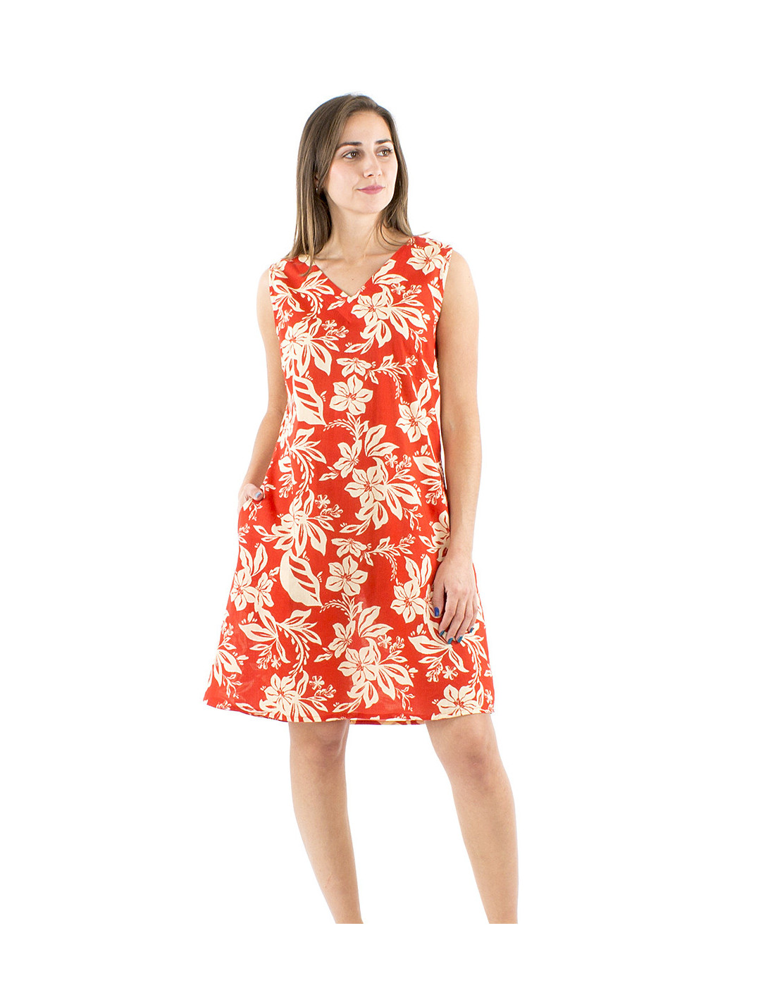 Short summer cotton dress with flowery tropical pattern : the feminine and comfy summer dress you absolutely need, with its original tropical floral print that leads us to farniente and holidays close to the beach. You will sure get noticed with this dress this summer, whatever the color you choose between deep blue, red or sage green. You'll totally fall for its pretty flared cut and its feminine V-neck, and we're sure you'll appreciate its side pockets that make it functionnal in addition to the originality of its look. This summer dress is available from S to XL, made to fit all bodyshapes.