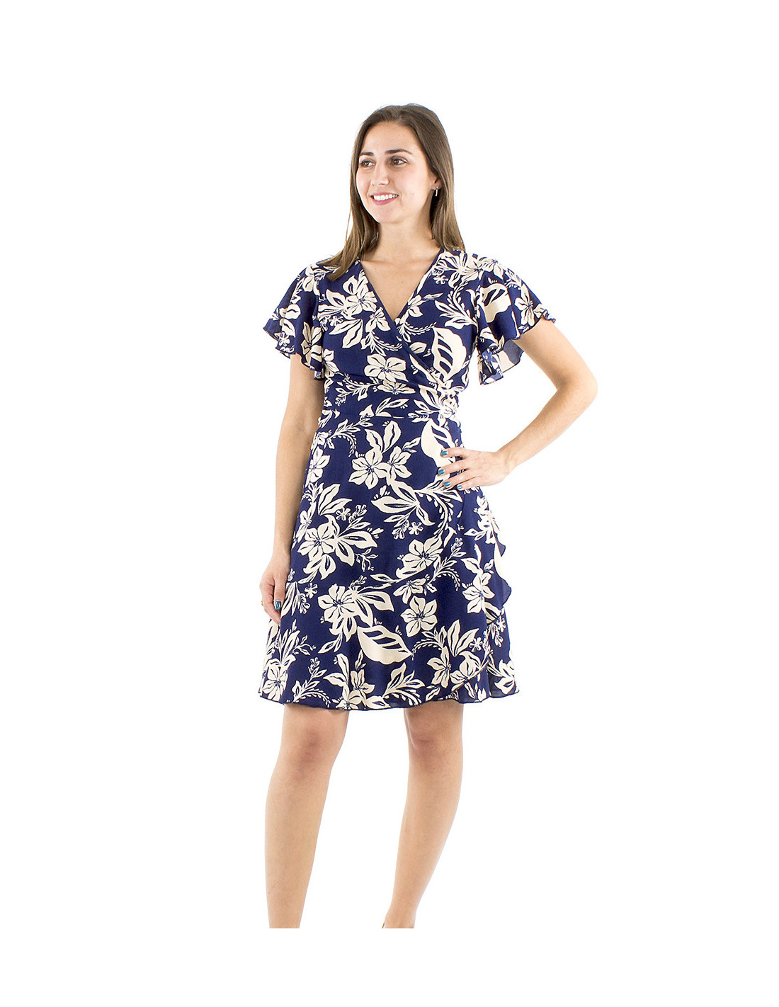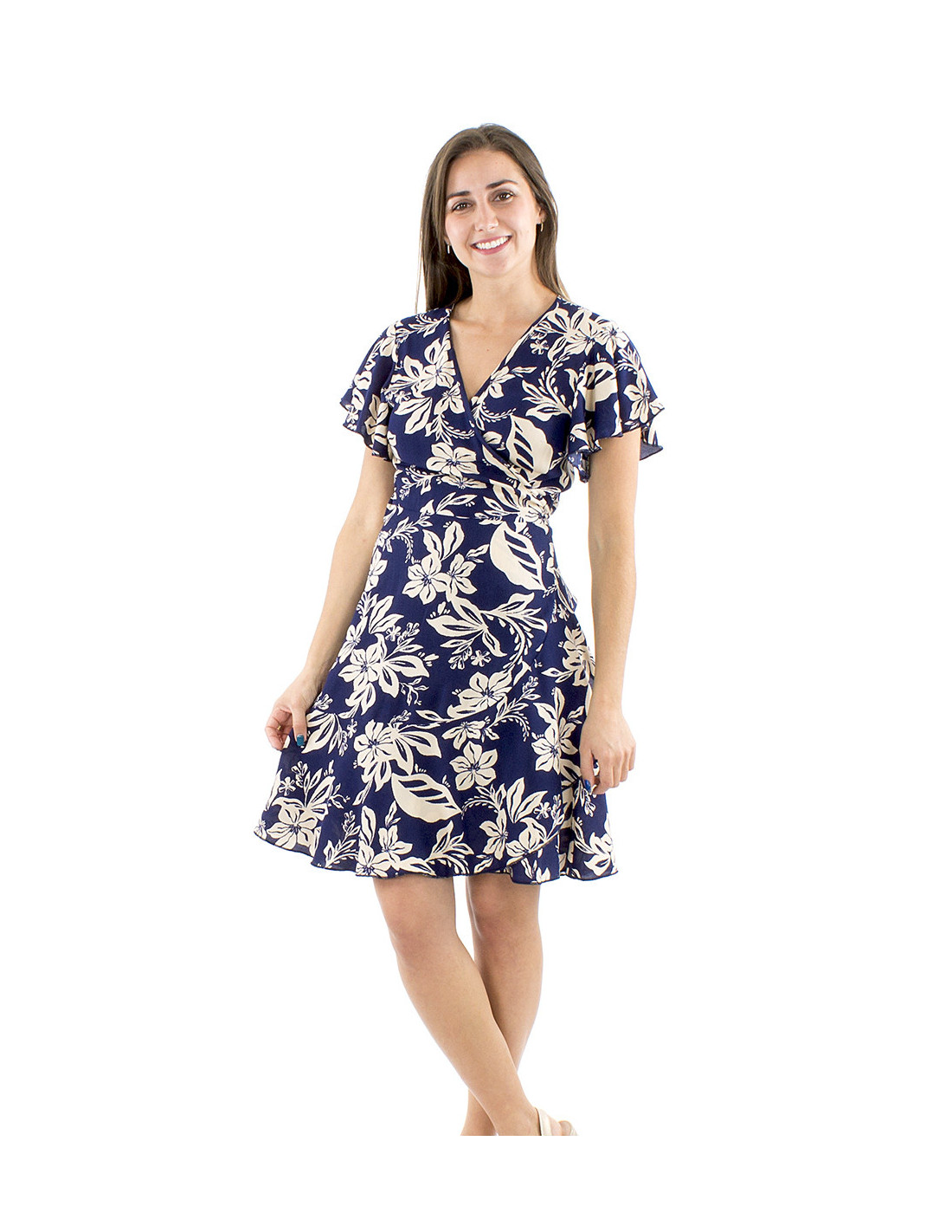 Boho summer dress with wrap V-neck : this pretty summer dress with a flowery boho print will please you immediatly with its sensual asymetrical ruffle on the side and its little short sleeves, also with ruffles and, for your comfort, it has an elastic band in it. Fall in love with its wrap neck giving a feminine and classy touch to your look. Made in a fluid and soft fabric, you'll always feel good in it, all at ease all day long and you'll start your day with the confidence of a woman that feels good in her clothes. This dress is available in deep blue or green sage, from S to XXL to fit all bodyshapes.