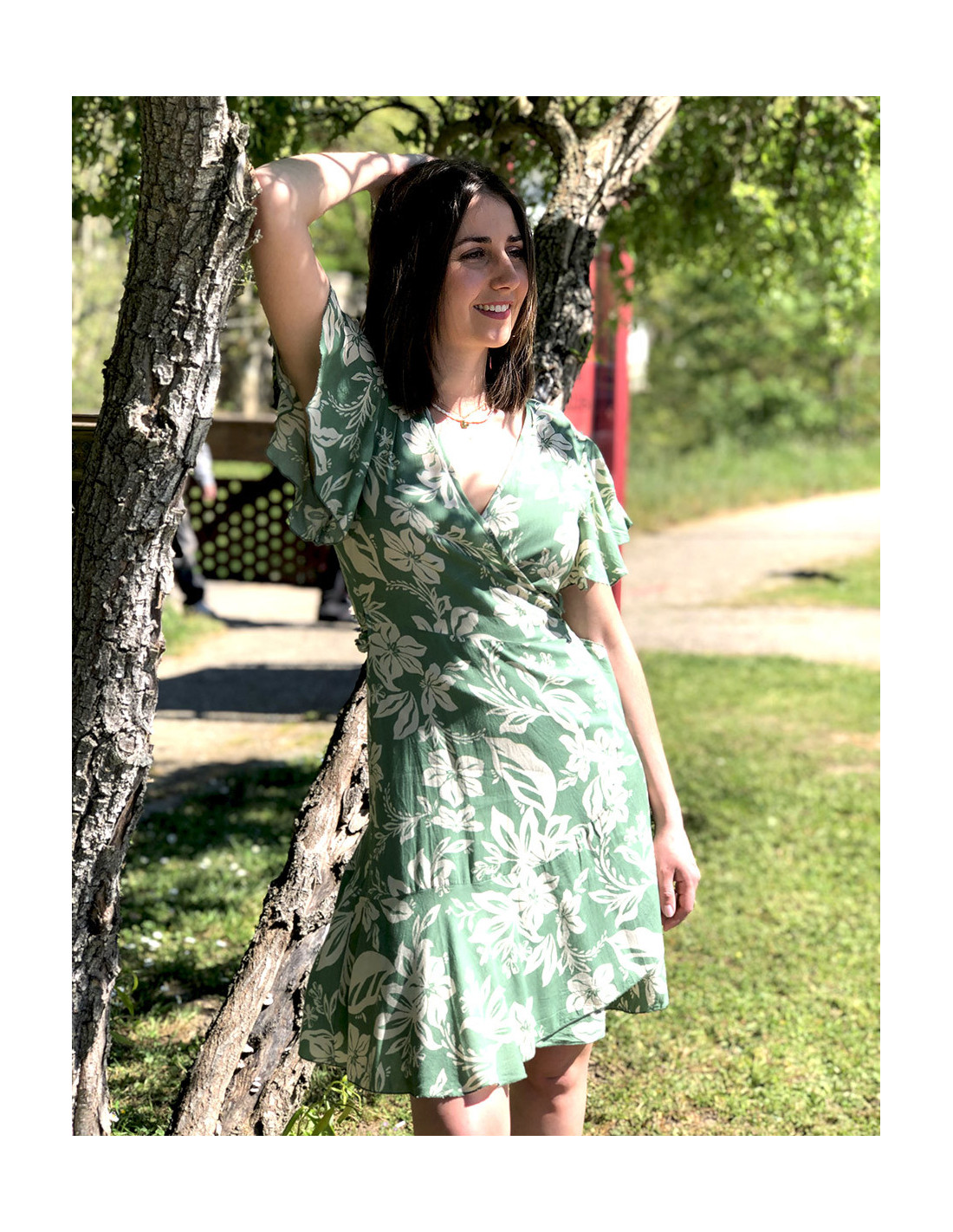 Boho summer dress with wrap V-neck : this pretty summer dress with a flowery boho print will please you immediatly with its sensual asymetrical ruffle on the side and its little short sleeves, also with ruffles and, for your comfort, it has an elastic band in it. Fall in love with its wrap neck giving a feminine and classy touch to your look. Made in a fluid and soft fabric, you'll always feel good in it, all at ease all day long and you'll start your day with the confidence of a woman that feels good in her clothes. This dress is available in deep blue or green sage, from S to XXL to fit all bodyshapes.