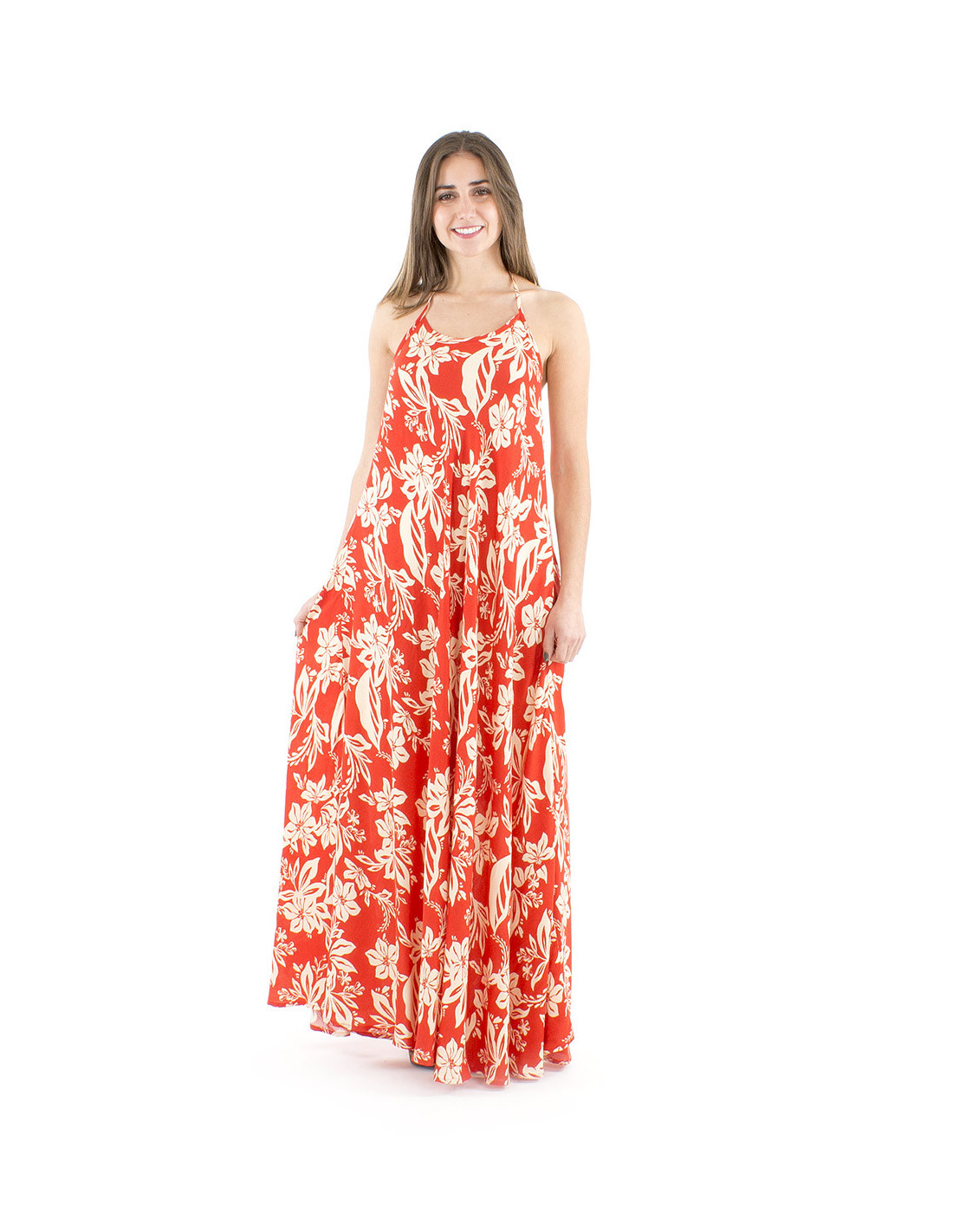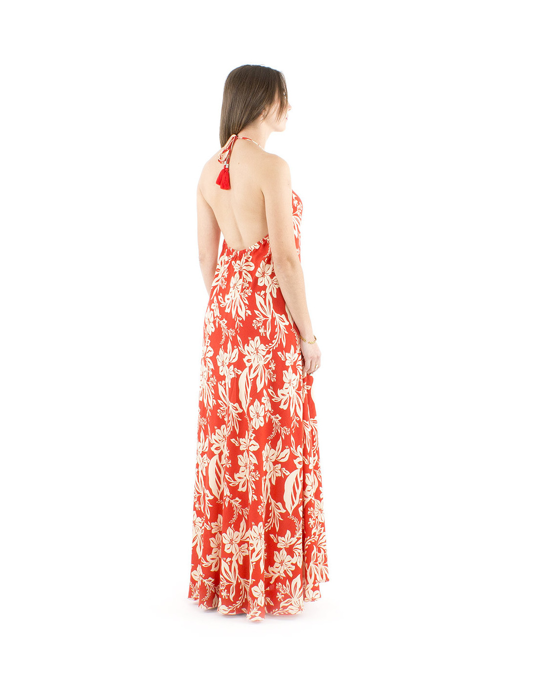 Long backless maxi-dress : Let your sensuality express itself with elegance in this long summer dress. Be totally charmed by its backless cut, perfect at any occasion, to be feminine and charismatic while staying classy. Its fluid fabric and its flowery summer print, in the boho chic style, will delight you. You'll be all at your ease remaining chic and glamorous. You'll also like the little pompoms at the end of its neck laces that brings charm and originality too. A easy to wear summer dress, comfy, that suits all morphotypes. Available in red or sege green, from S to XL.