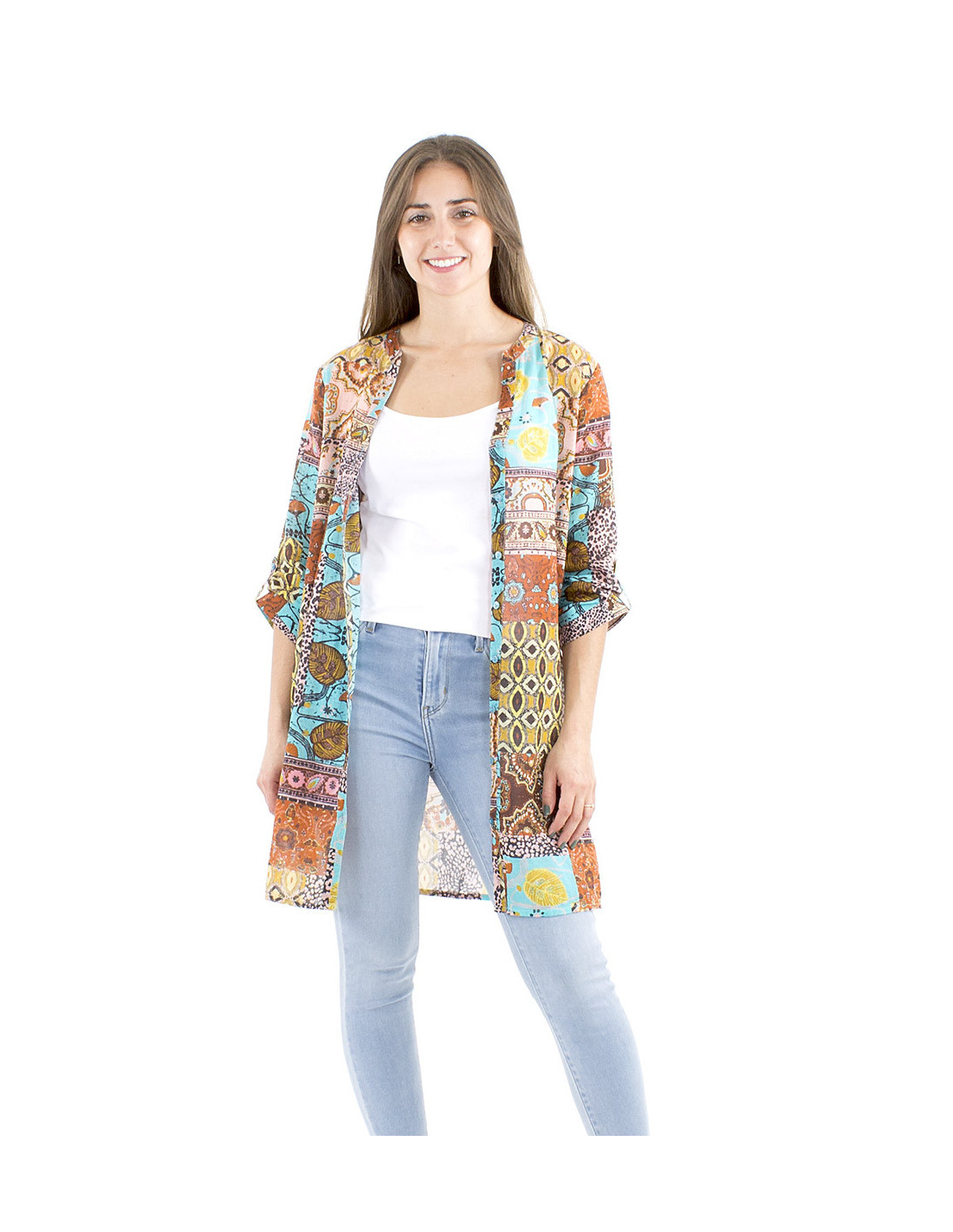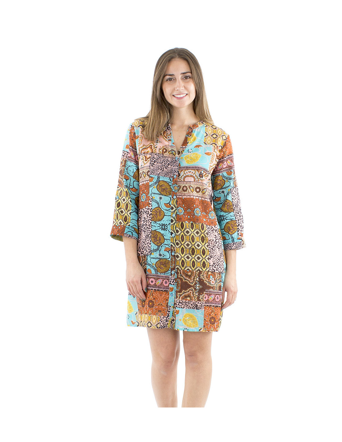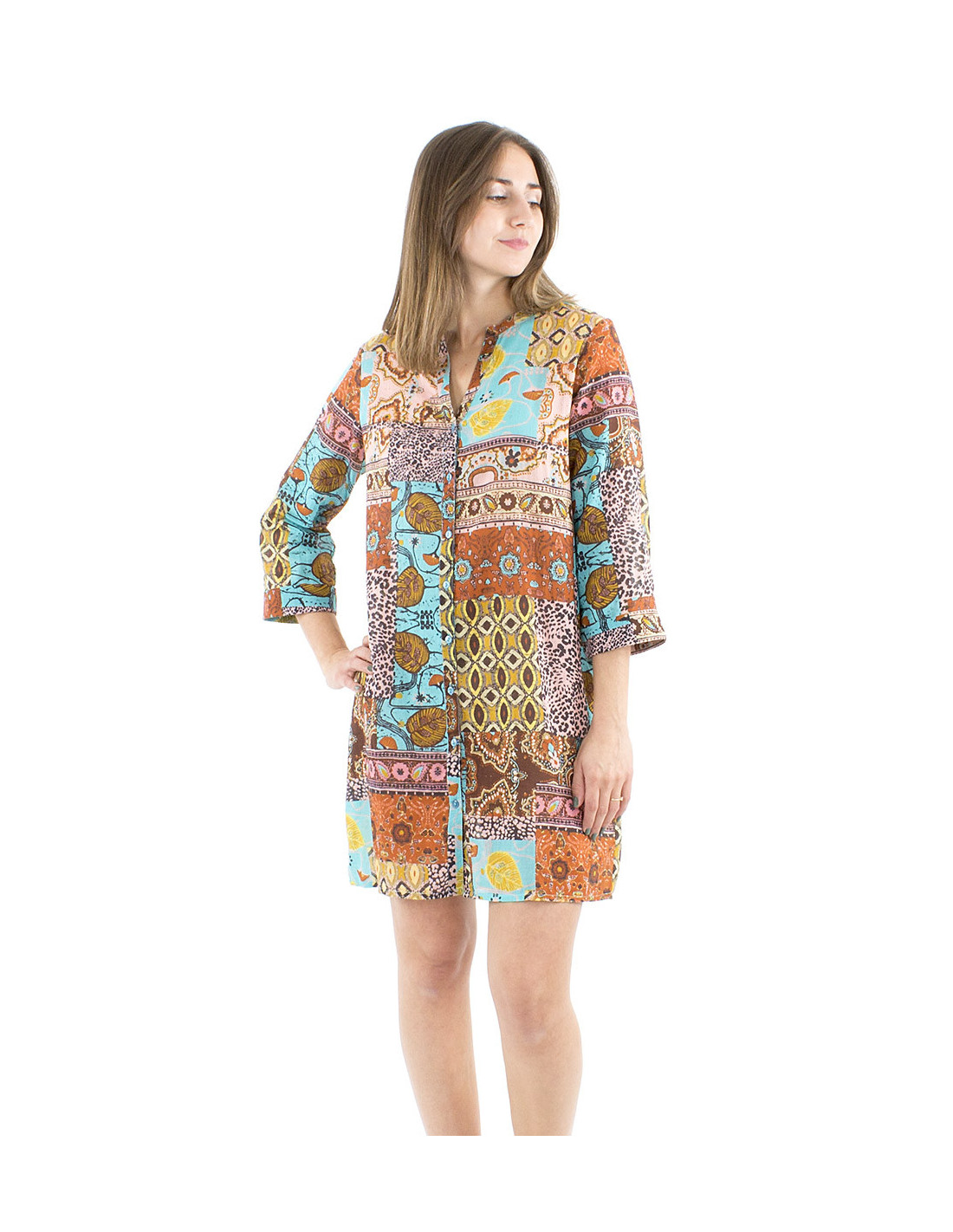 Original tunic dress with a corloful patchwork print : you love original dresses and bright colors ? You'll totally fall in love with this summer tunic dress, its classic cut in oppositon to its colorful ethnic pattern will please you for sure. A light cotton fabric, with a little bit of transparency, a dress made to be feminine and comfortable even in the heat of summer days. This boho tunic dress in the afrohemian style can also be wear as a light summer shirt if you open its buttons and put it with a little top of your choice. Its adjustable sleeves allow you to mix different styles and makes it practical which is a real plus. Available from S to 3XL, it will suits every woman, whatever your morphotype is.