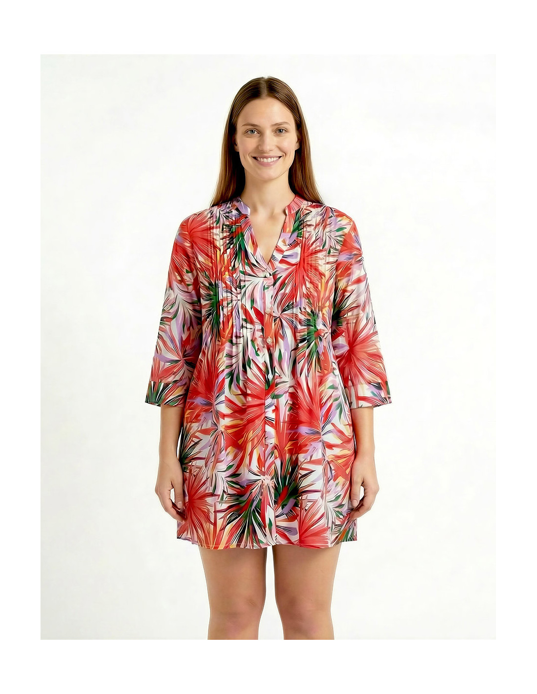 Tropical Design 100% Cotton Tunic Dress : Feel light and feminine in this pretty, colorful summer dress. Its loose-fitting shirt dress allows for freedom of movement and will provide comfort and well-being all day long. You'll appreciate its originality with gathers at the bust and a curved, mandarin-style collar, as well as its practical roll-up sleeves. Made from 100% cotton, it has a natural feel and is pleasant to wear, offering a lightweight look. This summer tunic dress can also be worn as a light jacket when left open over a top or tank top. We love its tropical print, which evokes travel and seaside holidays. This style is available in sizes S to XXL, in green or red, depending on your personal preference.