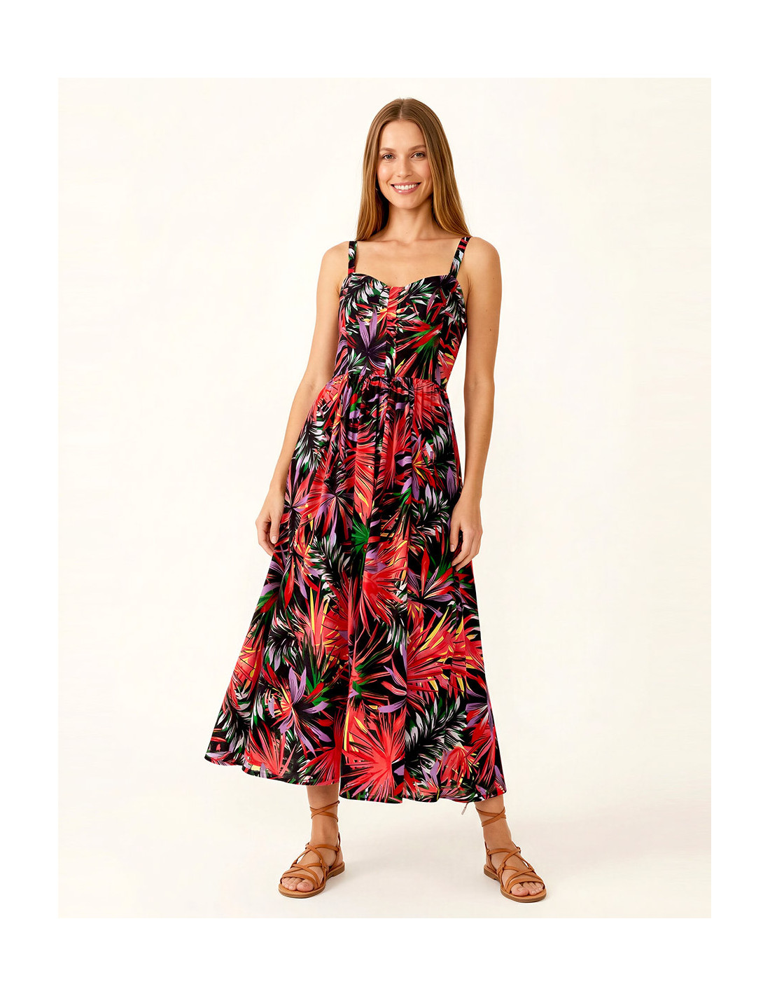 Long, flowing tropical dress : this style will instantly charm you with its original tropical print and fluid, lightweight fabric. Its discreet, slightly rounded neckline makes it feminine and elegant, while the delicate straps beautifully accentuate your shoulders and posture. We love the maxi dress effect, which creates a draped look and instantly adds style to your walk. A dress to wear all summer long, for any occasion, from the beach to the city. Available in sizes S to XL in black, green, or red to suit your taste and mood.