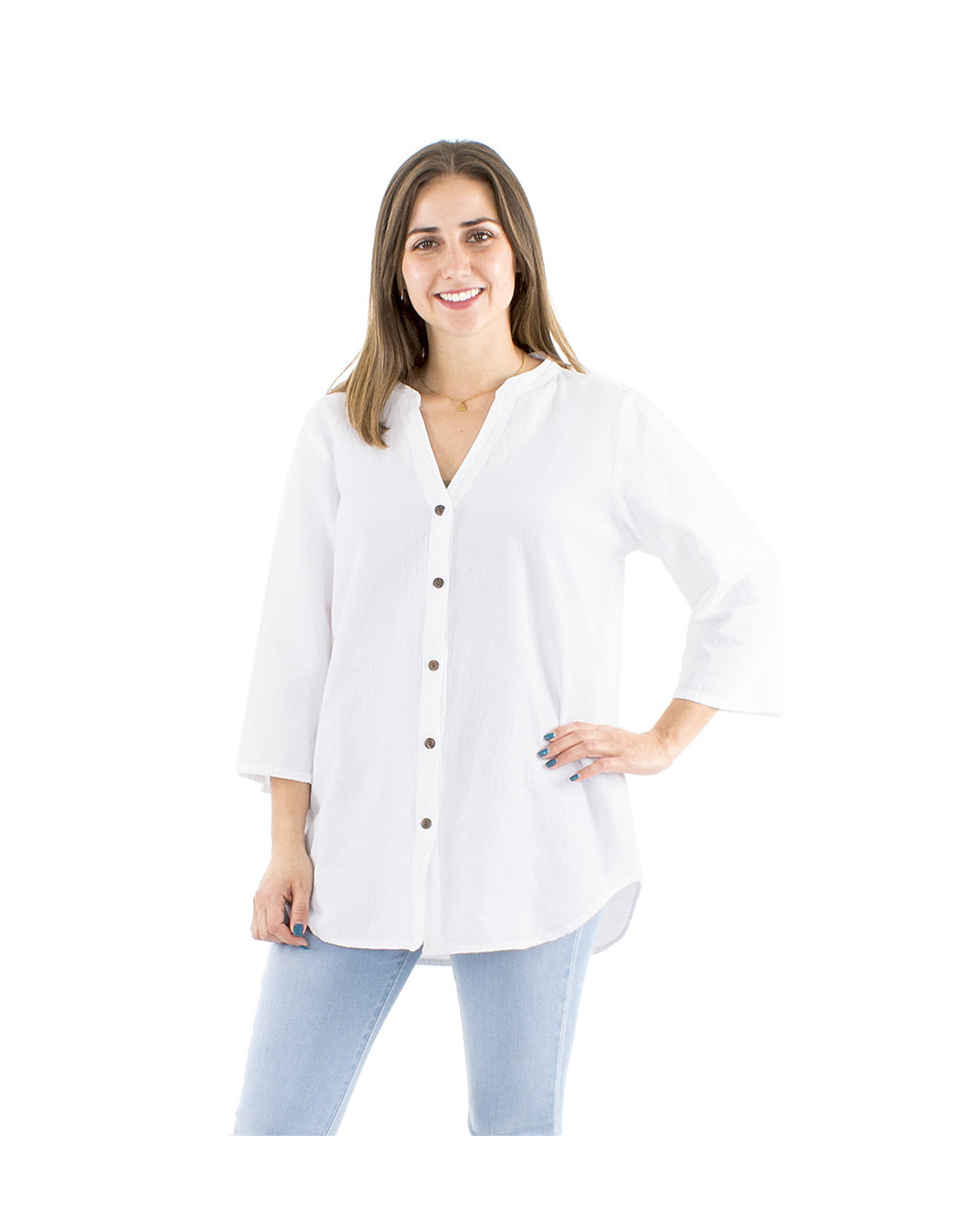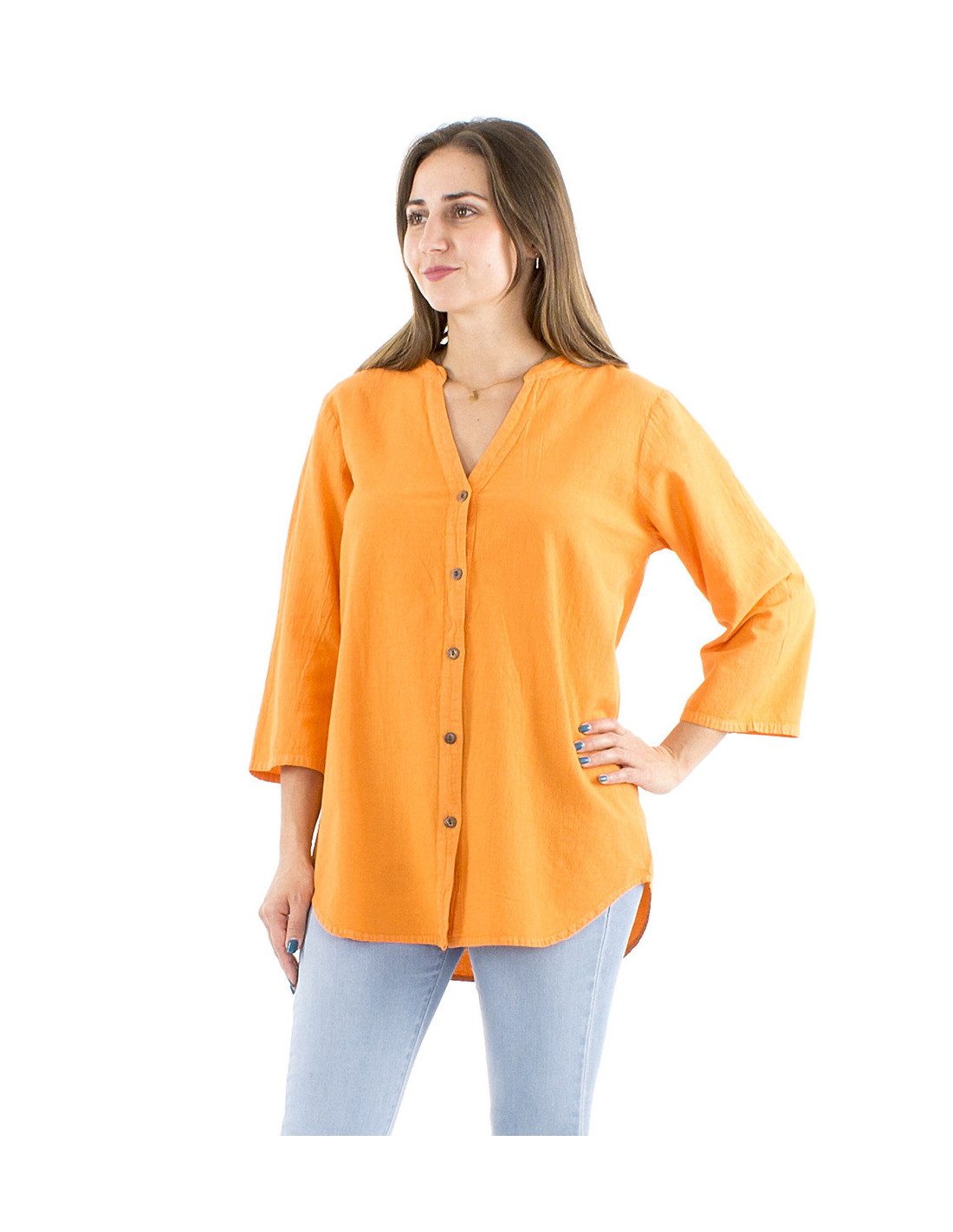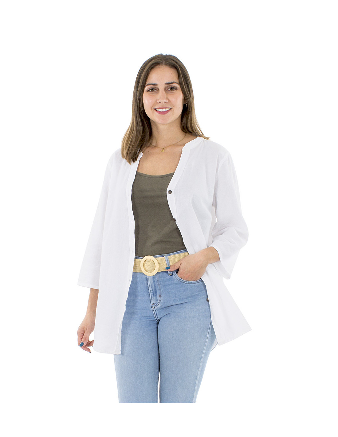 This loose and comfortable summer shirt is the must-have bohemian chic piece for your wardrobe. Made from 100% cotton, it has a naturally elegant feel and is perfectly complemented by its coconut wood buttons. Worn open or closed, it offers two distinct styles : one more relaxed, like an oversized painter's shirt, when open, and the other more dressed up, when closed, revealing a flattering V-neck and rounded, eye-catching mandarin collar details. Available in sage green, blue, coral, or white, it comes in sizes S to XXL.