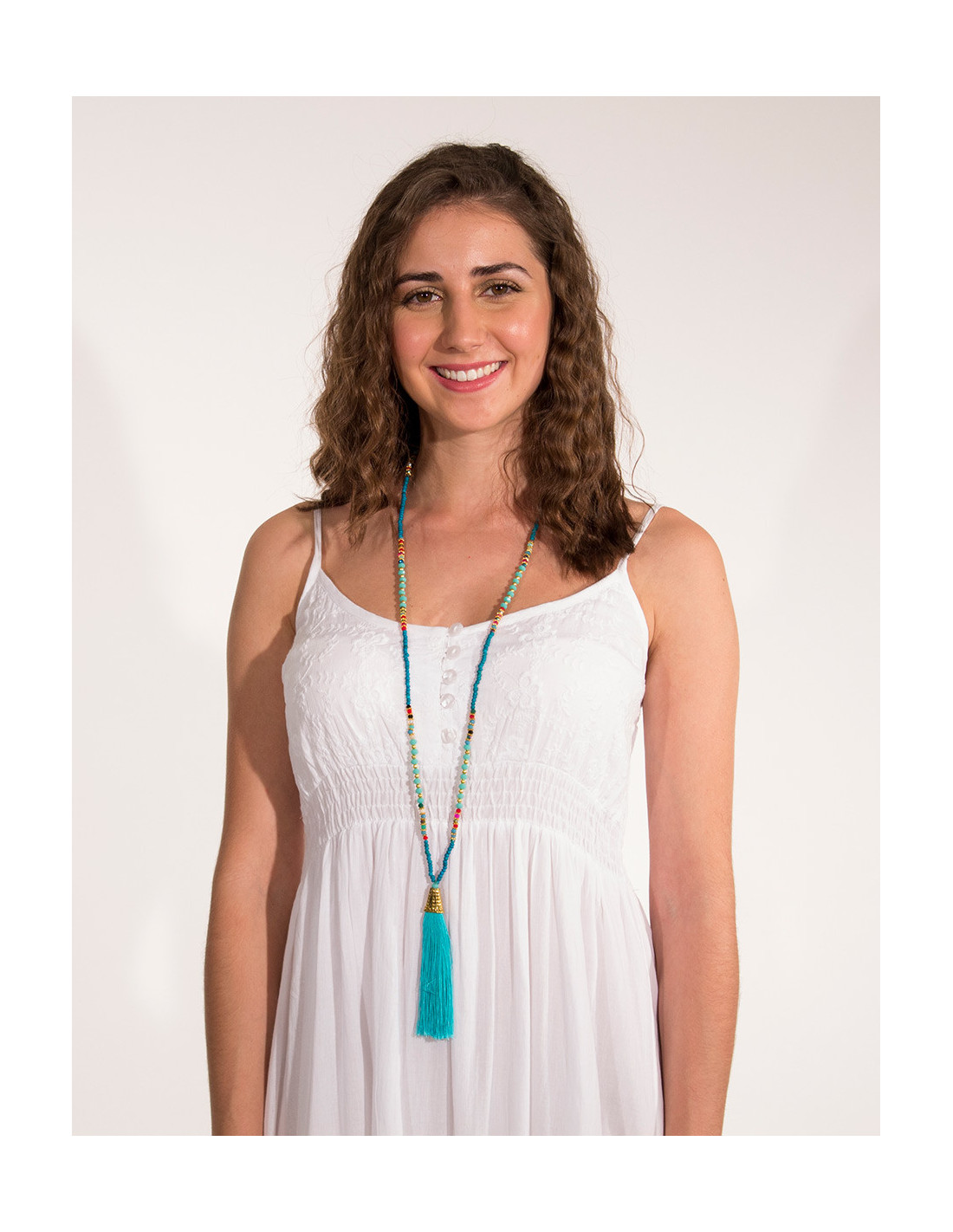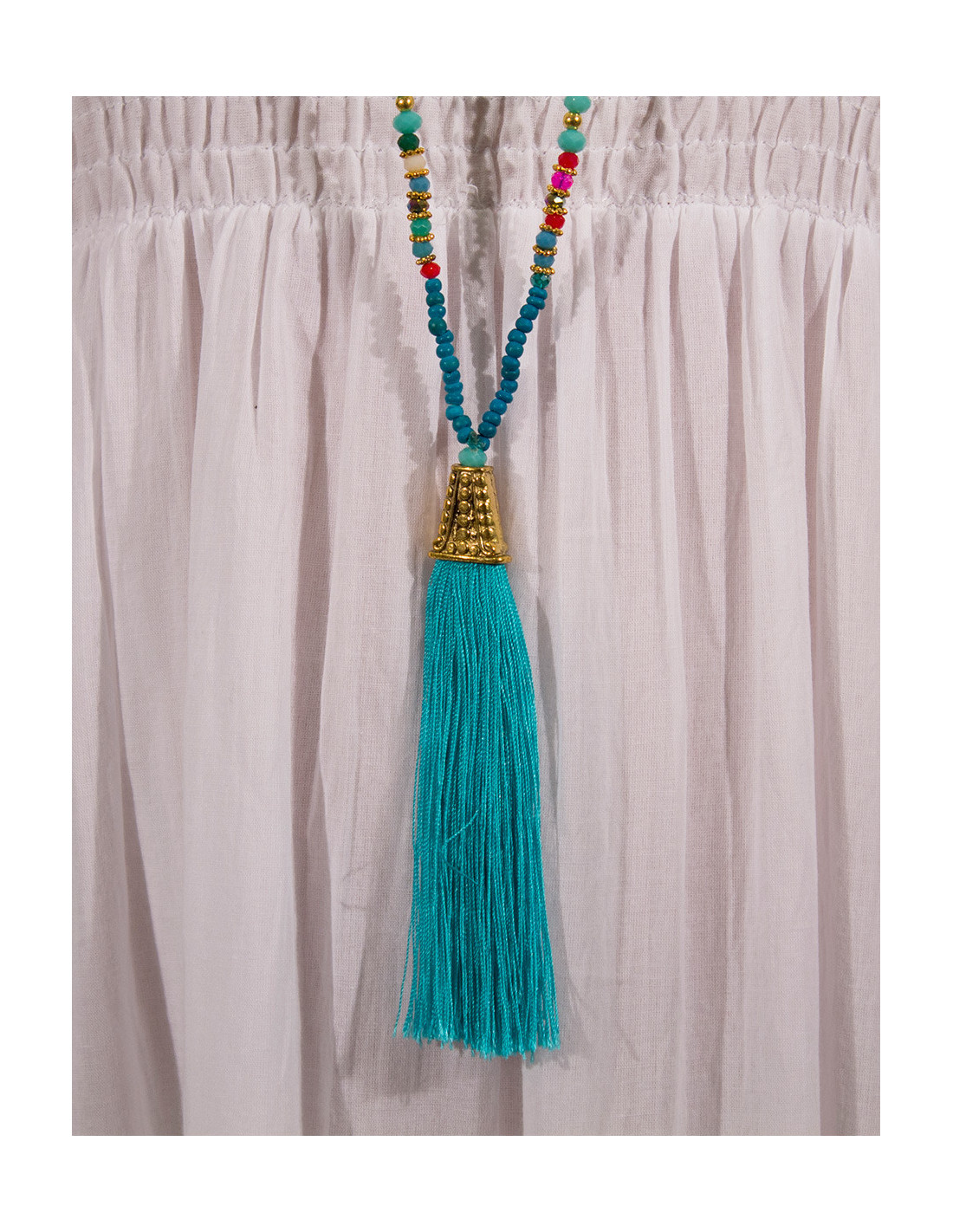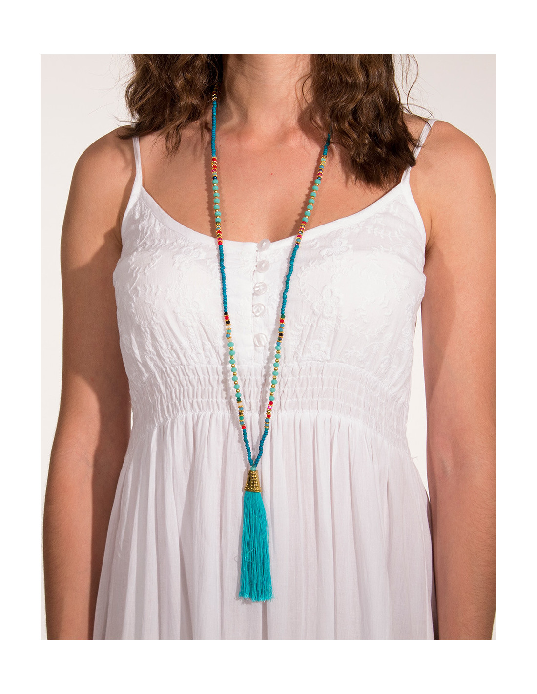 This long necklace is made of coloured beads and gold, finished with a long pompom of coloured fringes. We love the simple and pure style that dresses bohemian outfits.