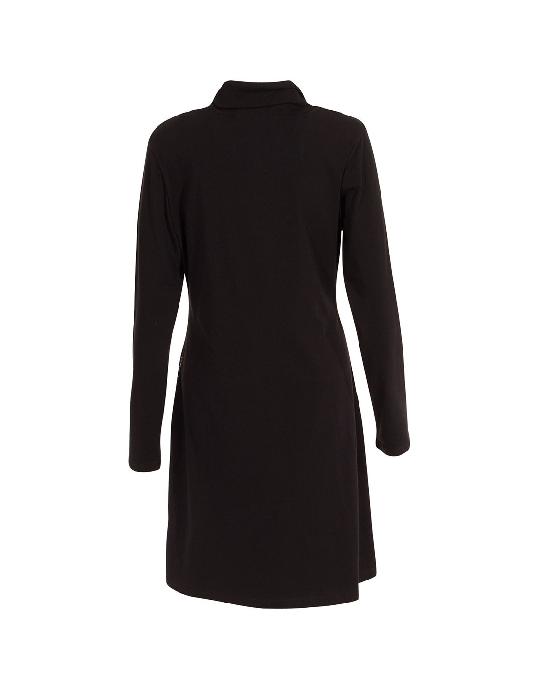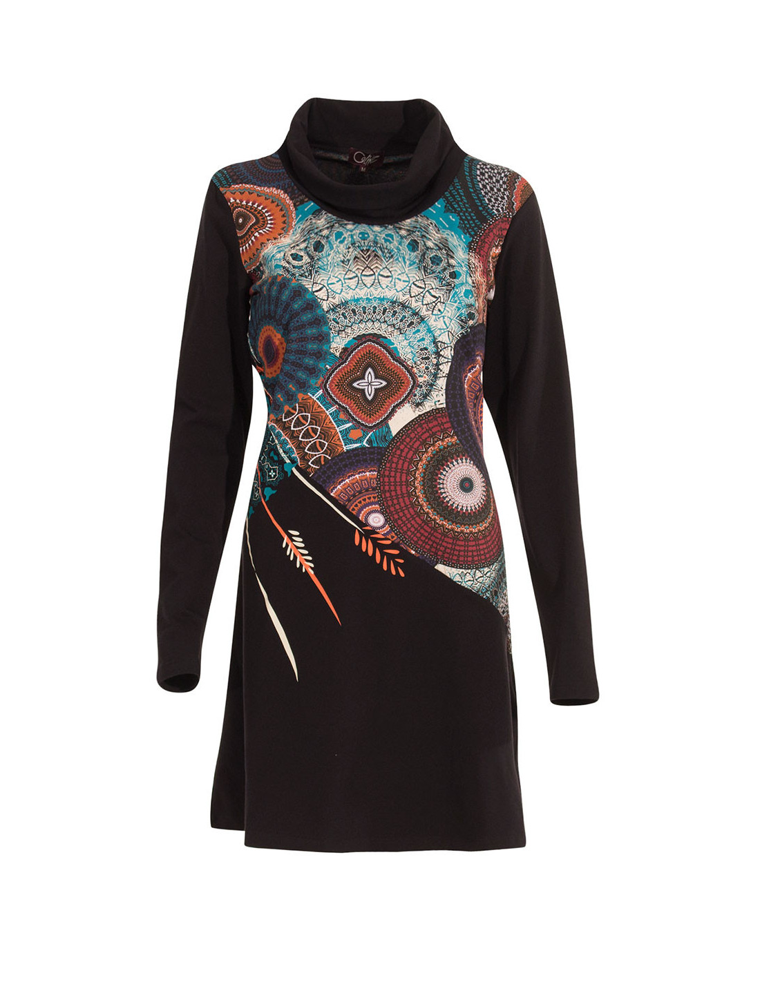 On retrouve bien ici l'originalité de la marque Coline avec cette robe associant le tissu uni et les mandalas très finement travaillés et colorés. Le col retombe de façon fluide. On aime la superbe impression de mandala aux tiges feuillues sur la hanche droite. Longueur S : 88cm - XXXL : 98cm.