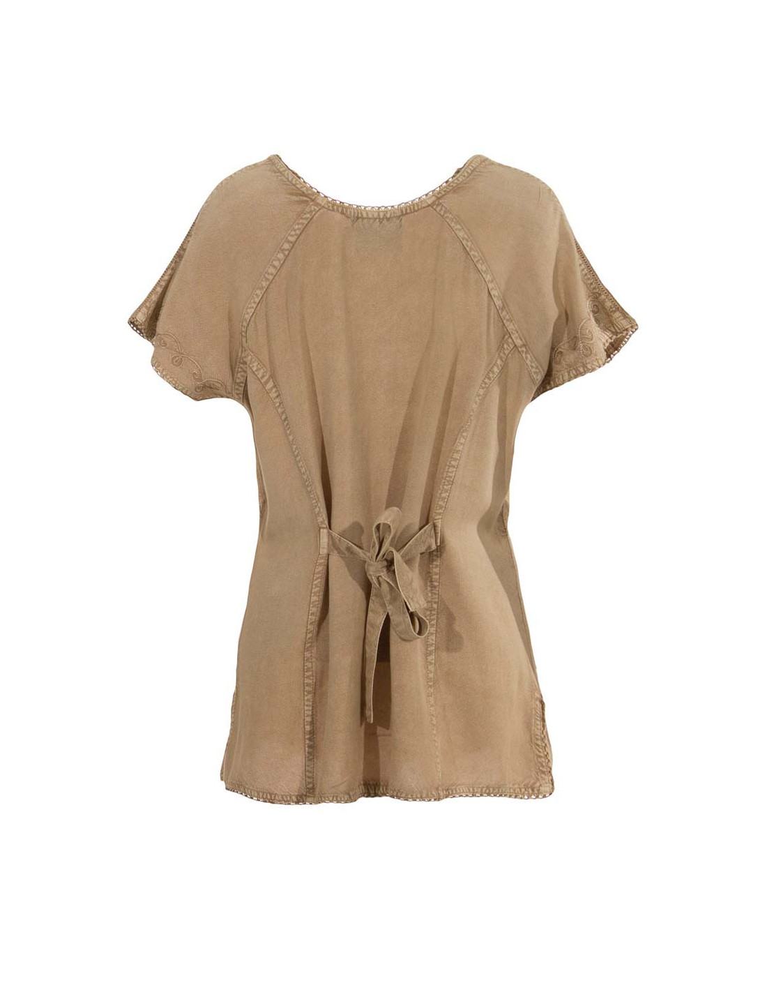 Ce chemisier à manches courtes en stonewash brodé est joliment orné de petites perles et sequins brillants. Il a un lien à nouer dans le dos. Longueur M : 63cm