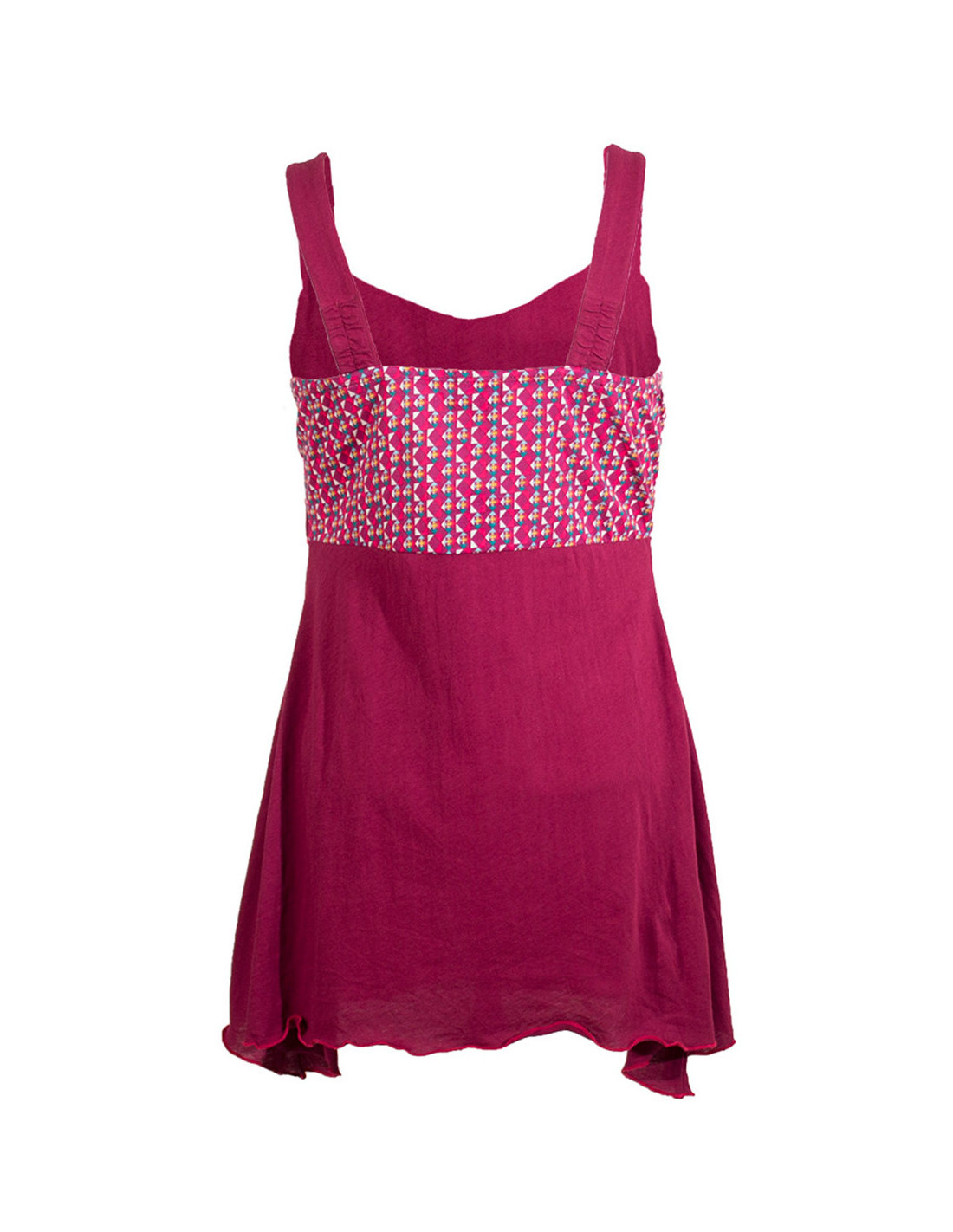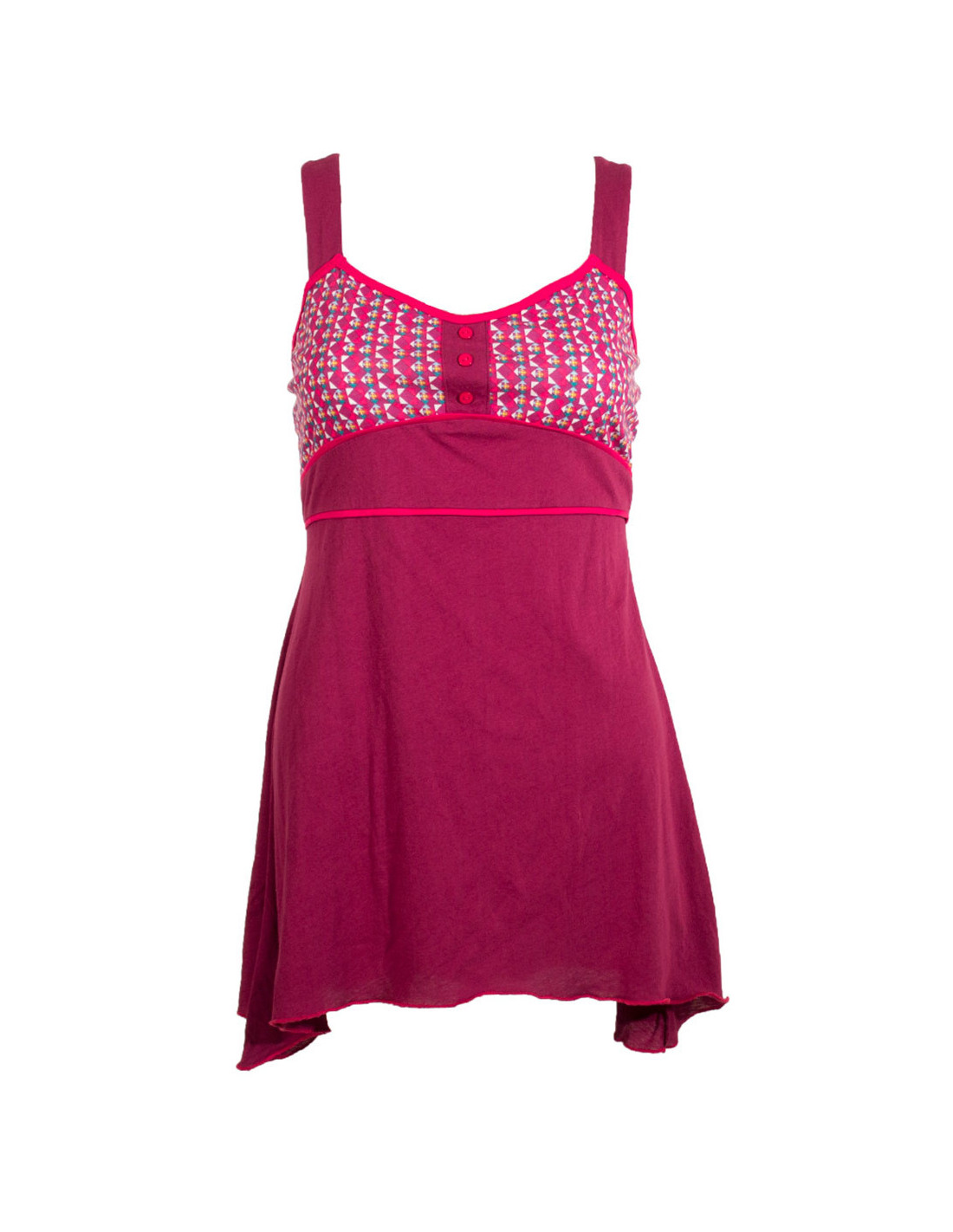 'Débardeur long asymétrique imprimé sur poitrine, liseret sous poitrine, bretelles élastiquées dans le dos. Longueur S : 57cm, XXL : 65cm.'