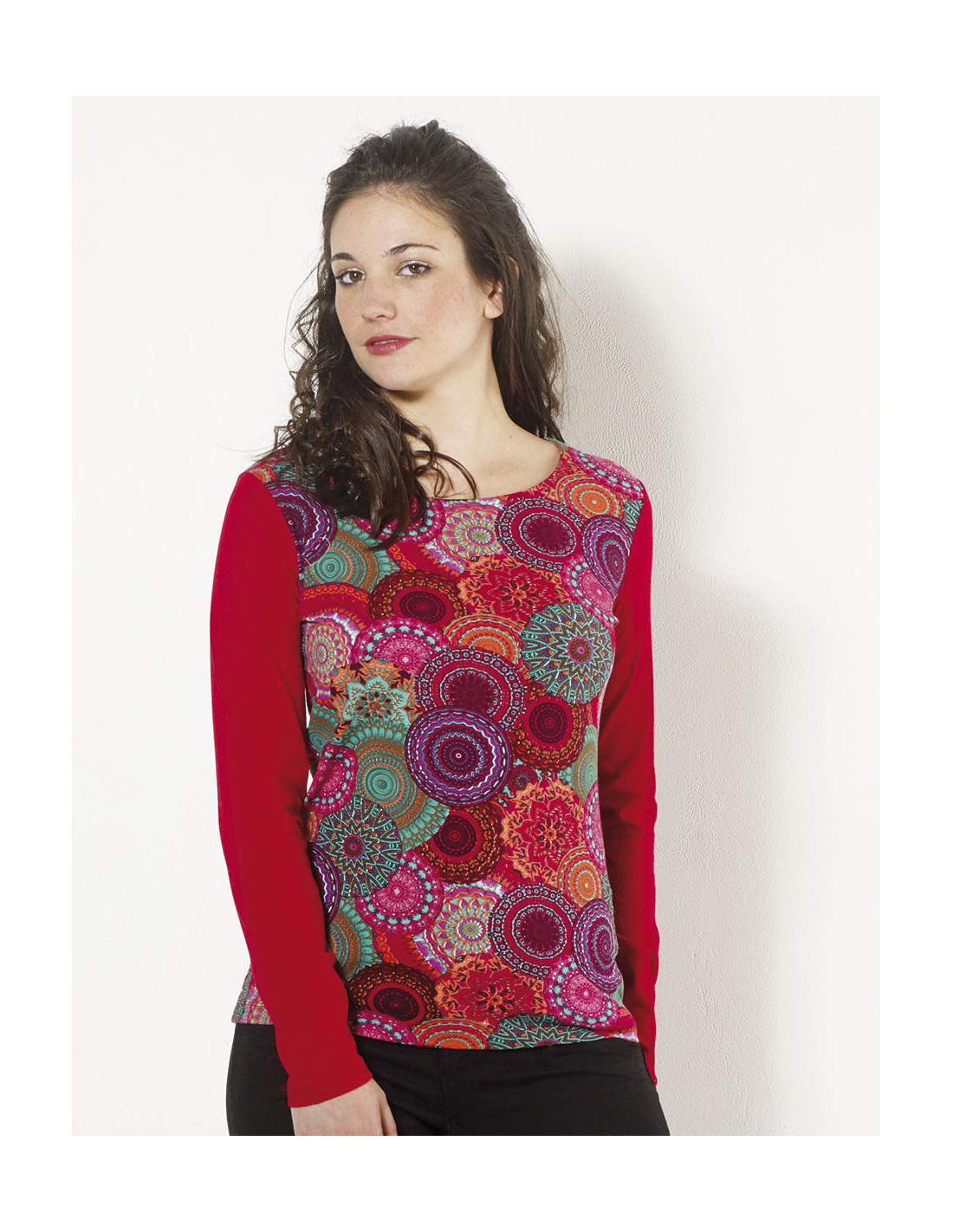 Voilà un beau tee-shirt rouge à manches longues au style Hippie pour egayer votre hiver. Le dos et le devant sont faits dans un tissu aux imprimés mandalas colorés. Longueur S : 60cm - XXL : 67cm.