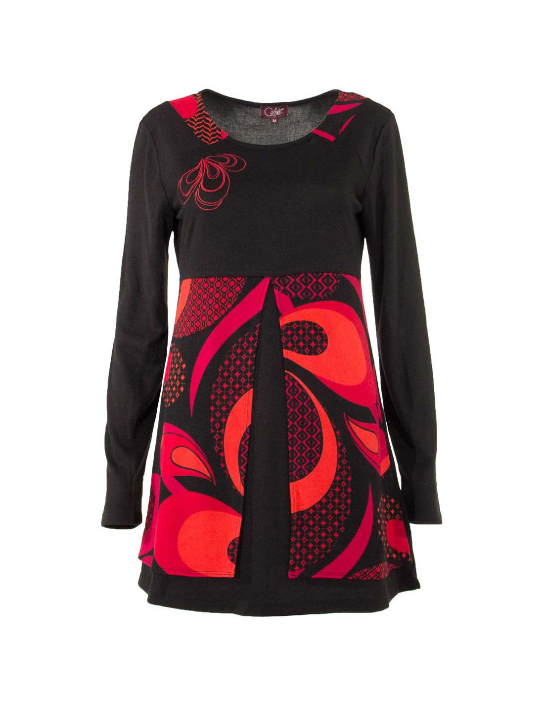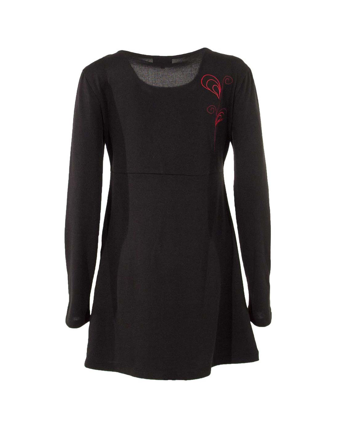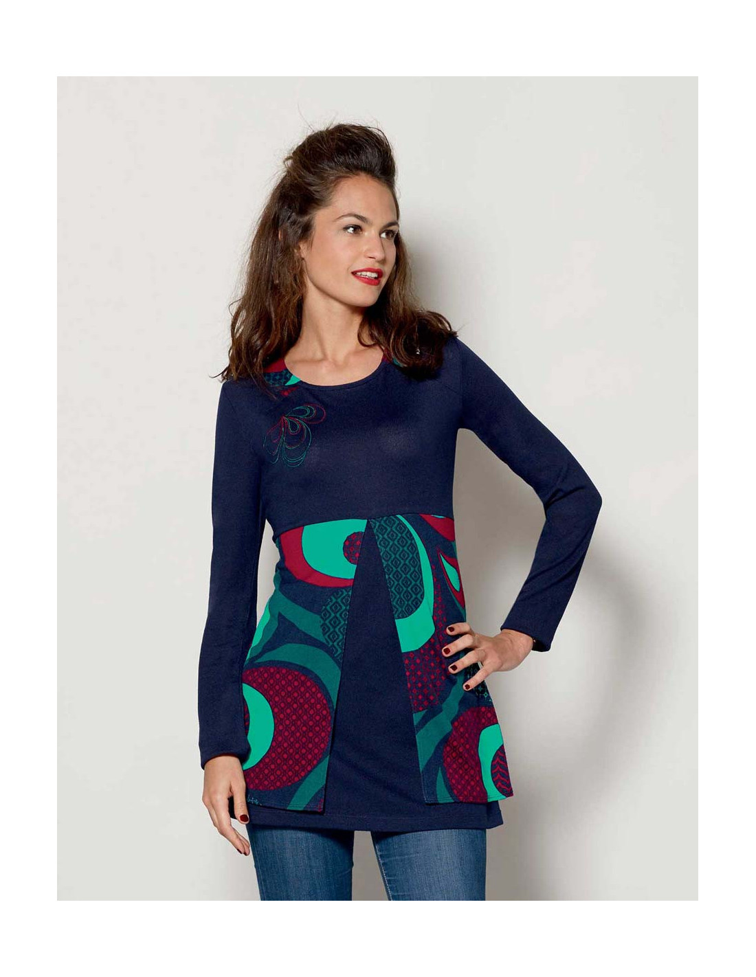 Tunique en maille fine avec un bel effet de superposition de 2 pans de tissu coloré fixés au niveau de la taille haute. On aime les broderies de motifs seventies sur la poitrine et en haut du dos. Longueur S : 75,5cm - XXXL : 83cm