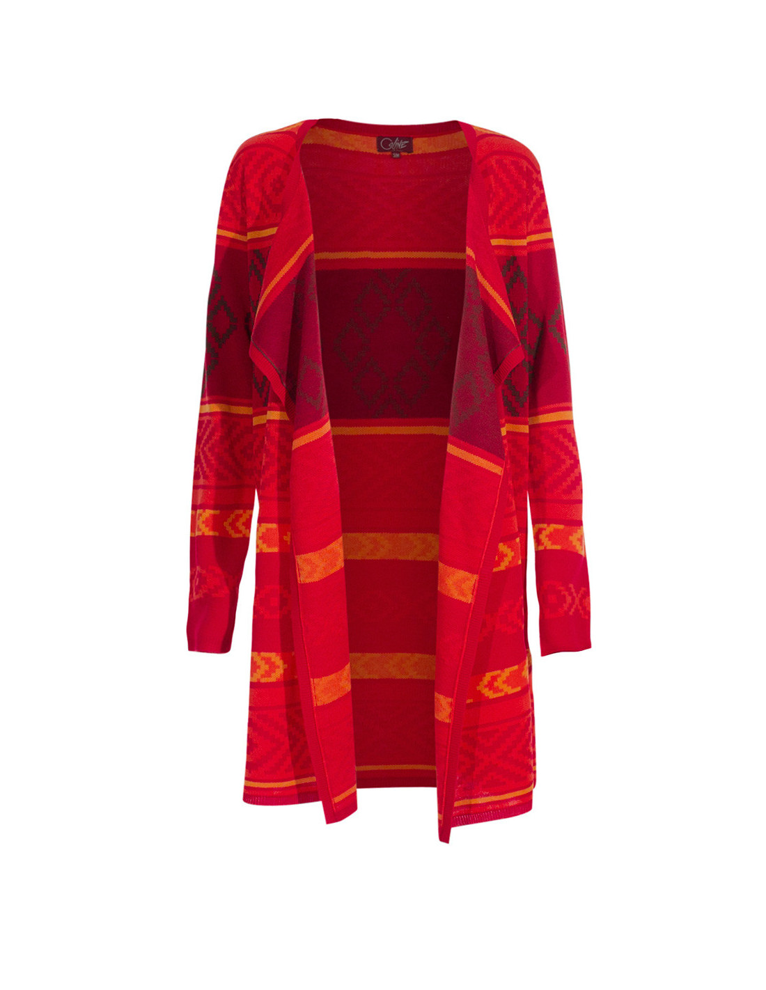 Cette veste mi-longue aux motifs ethniques se porte ouverte pour un tombé fluide et confortable. Longueur S : 84cm - XXL : 88,5cm.