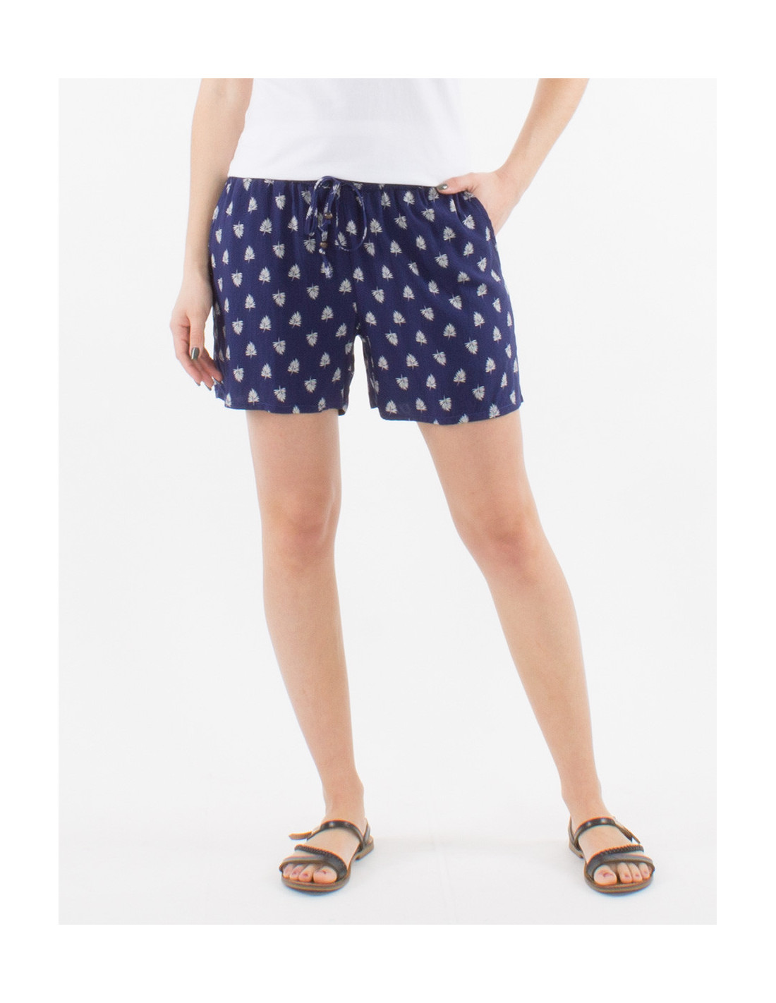 Petit short d'été pour femme basique léger et fluide imprimé boho chic bleu marine avec plumes blanches