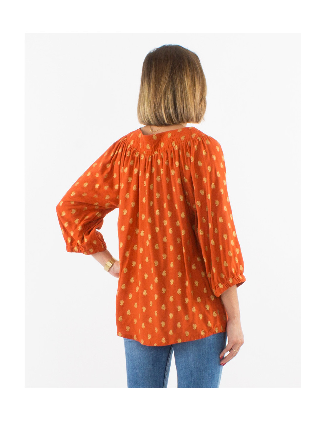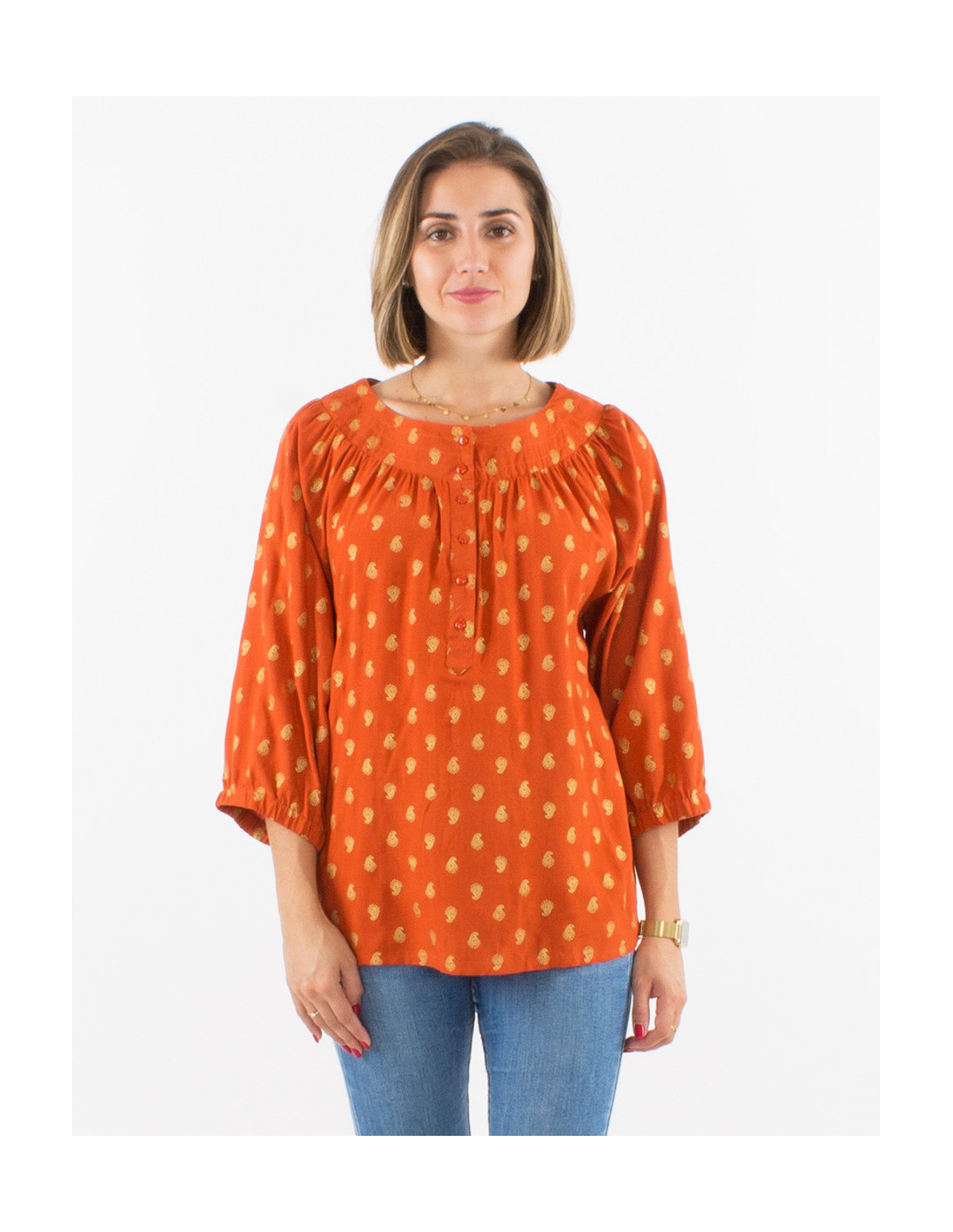 Blouse ample femme fluide à manches 3/4 ballon et plis poitrine motif doré rouille