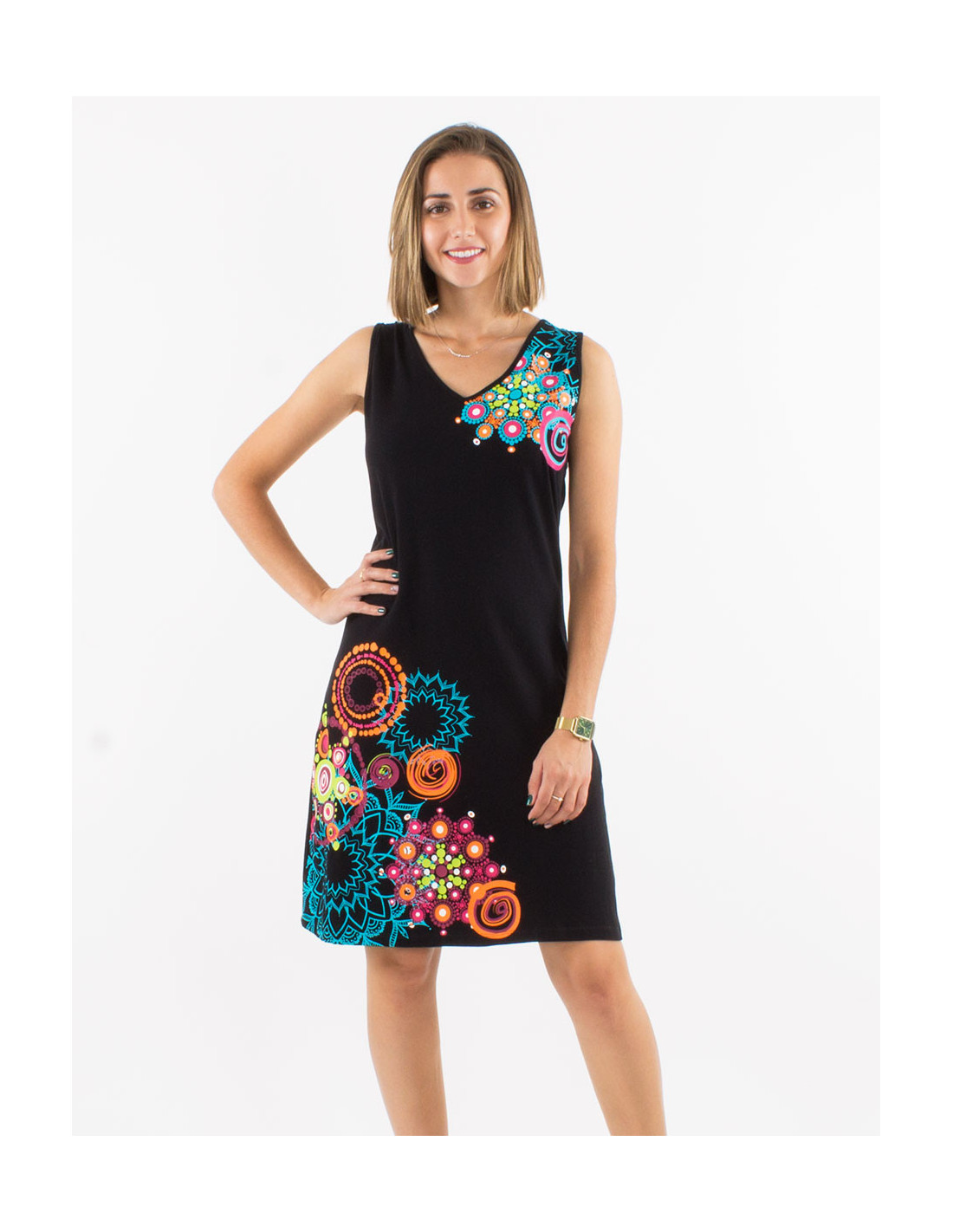 Robe courte sans manches en coton noir à imprimé baba cool rosaces bariolées