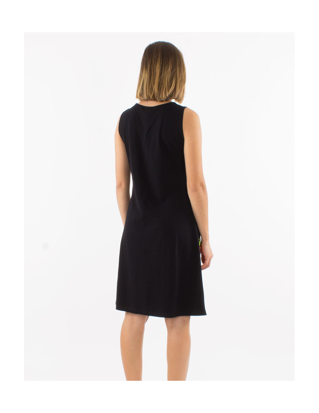 Dos de robe courte sans manches en coton noir à imprimé baba cool rosaces bariolées