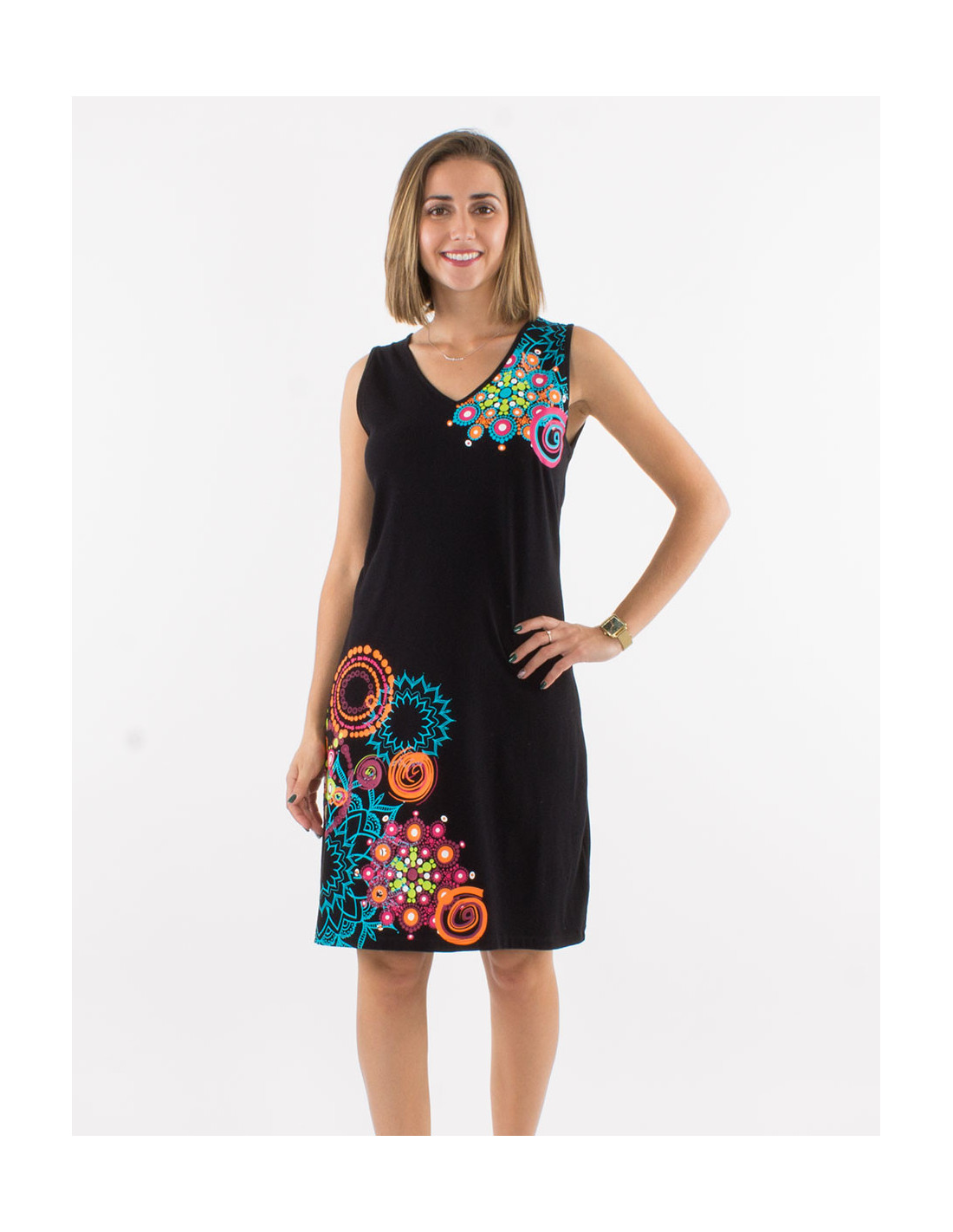 Robe courte noire en coton sans manches à motifs baba cool colorés