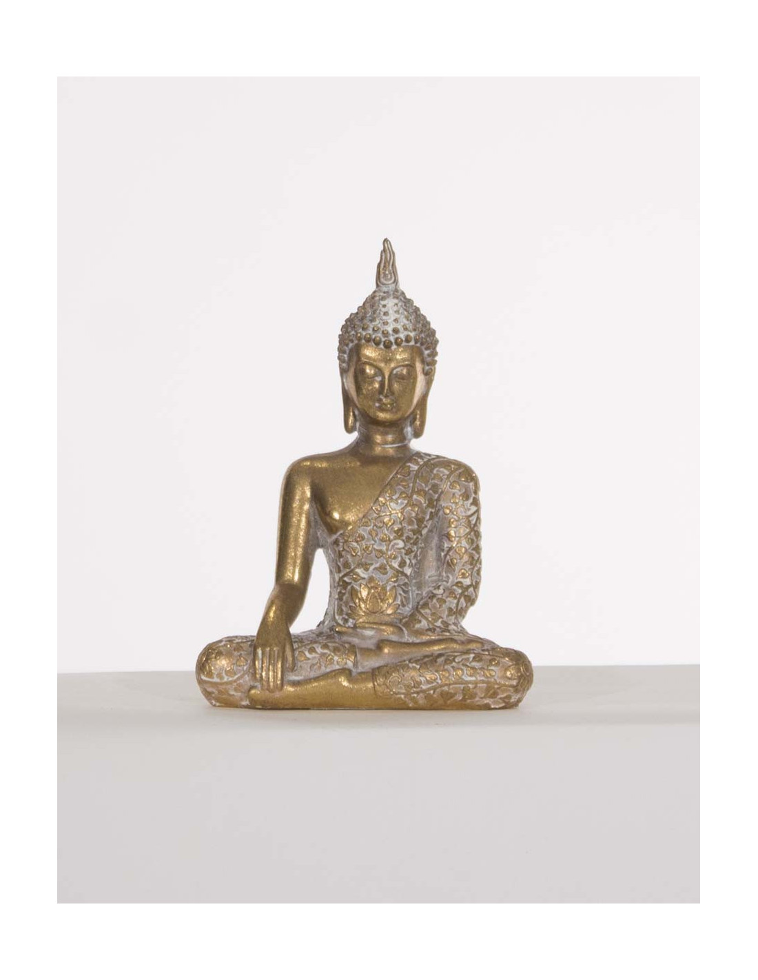 Statue de Bouddha assis en position d'éveil, la main droite posée sur son genou et les doigts pointés vers la terre. La main gauche est posée pour que la paume soit tournée vers le ciel. Il possède une flamme sur la tête, un signe qui évoque le caractère lumineux et pur du Bouddha. Cette statue en Résine est légère (150 grammes) grace à sa composition en résine de Polyester. Les finitions sont précises et délicates, ce bouddha vous apportera les énergies positives nécessaires pour une mise en ambiance de méditation ou de déco Zen.