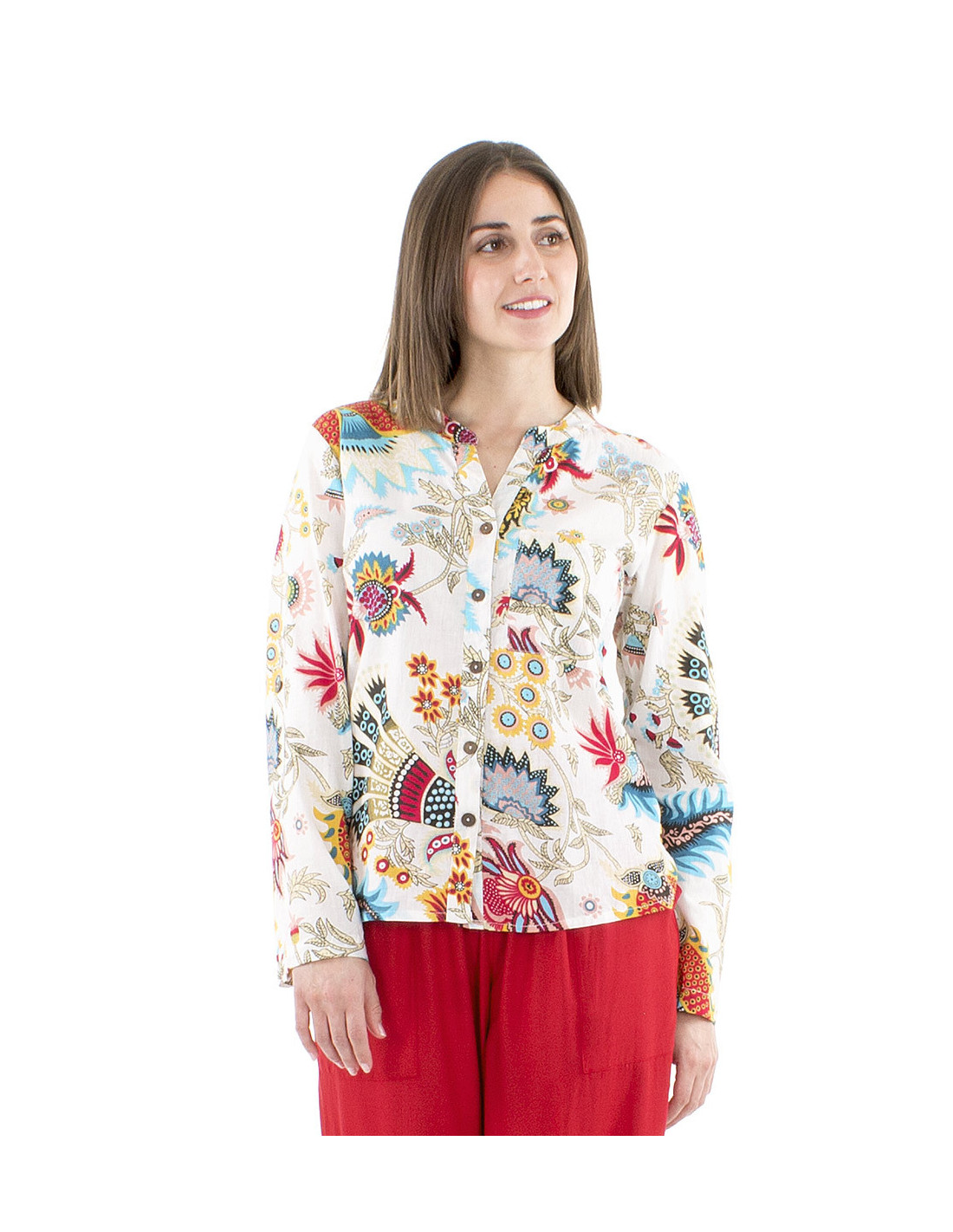 Ce chemisier pour femme haut en couleurs va vous ravir : une confection 100% coton qui laisse respirer la peau, un motif ethnique inspiré de l'Inde, original et coloré (disponible en deux coloris différents pour répondre à toutes vos envies), une coupe ample et confortable pour vous sentir toujours à l'aise, sans oublier ses boutons en bois de coco qui apportent encore plus d'originalité et une touche naturelle à votre style. Disponible du S au XXL.