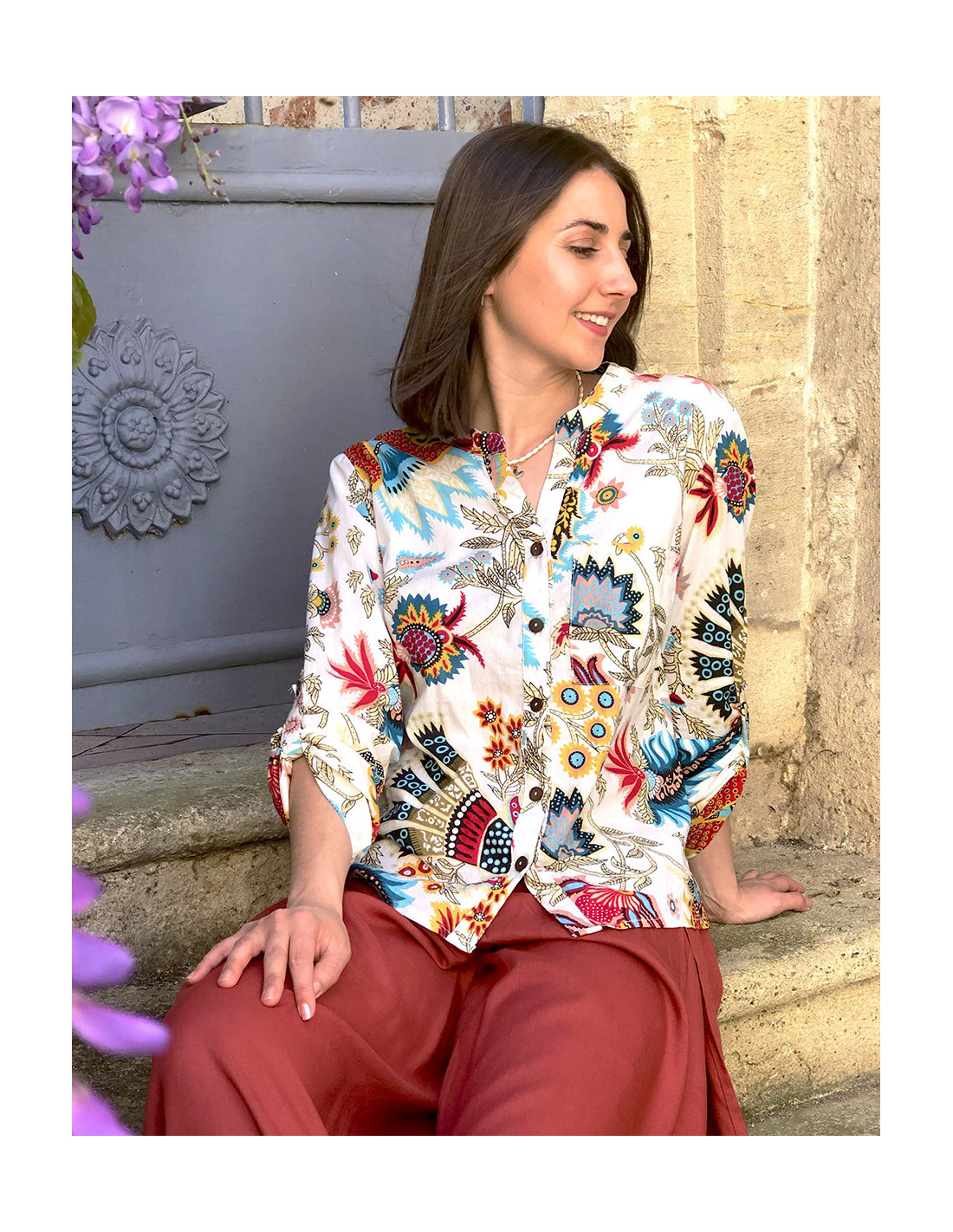 Chemisier femme original motif coloré et manches ajustables