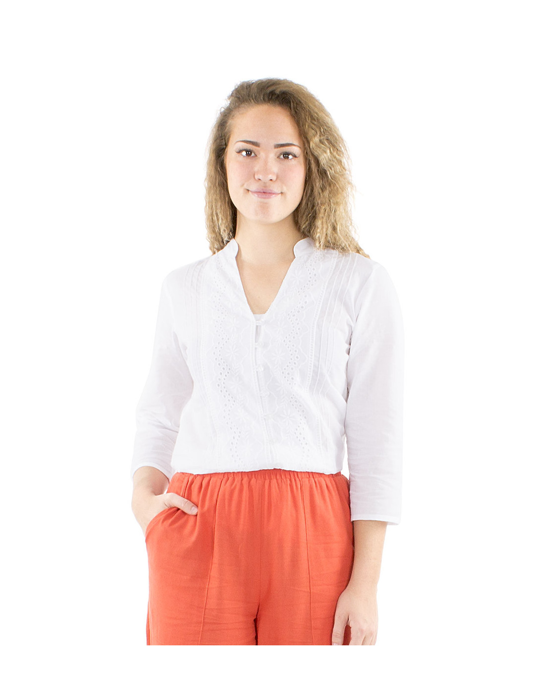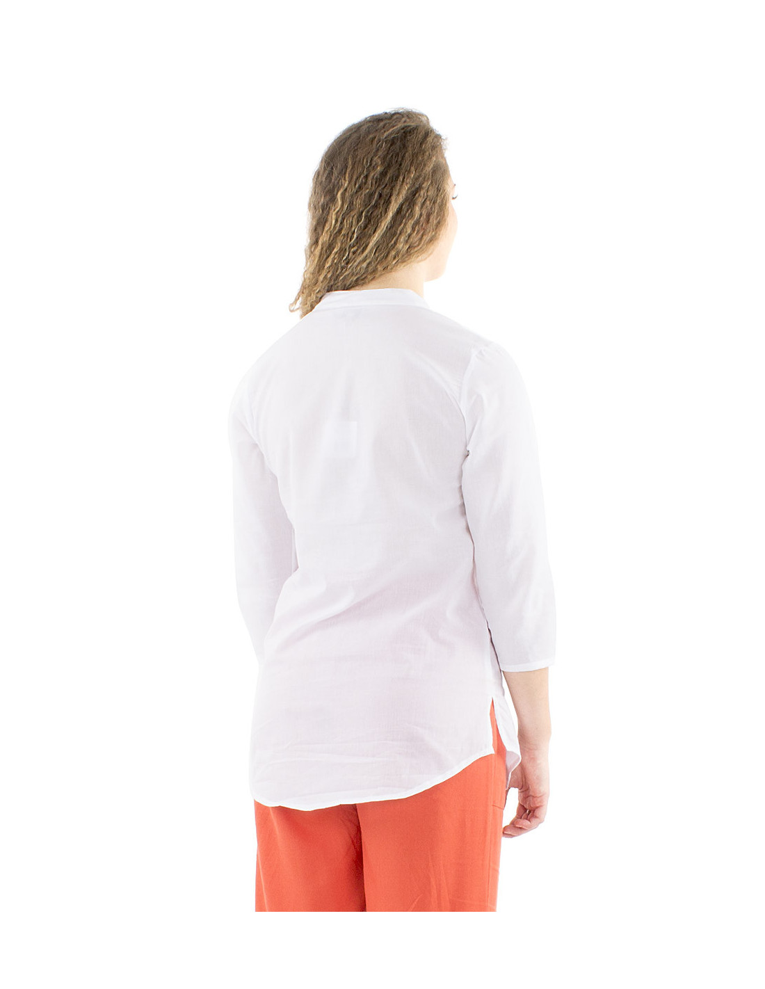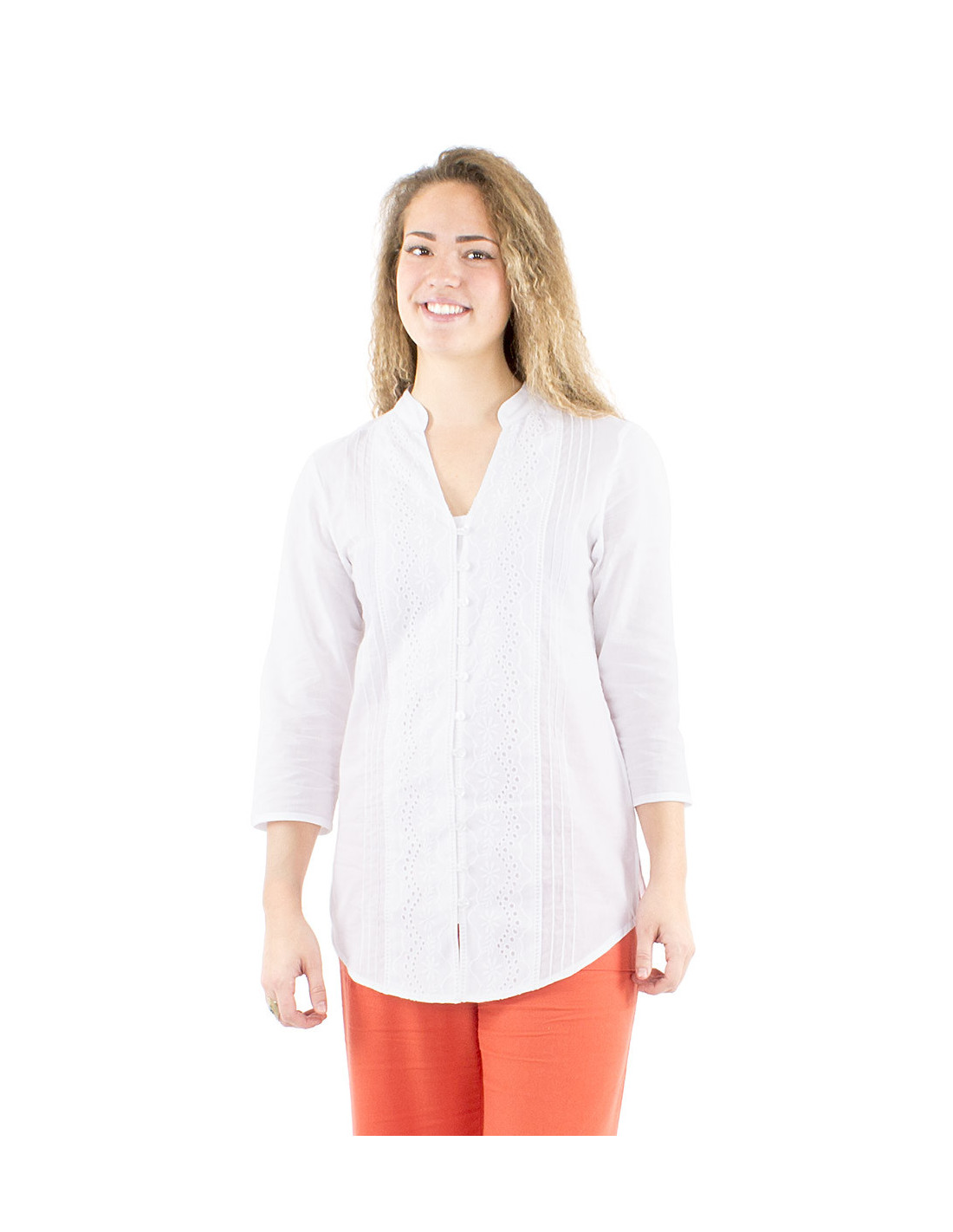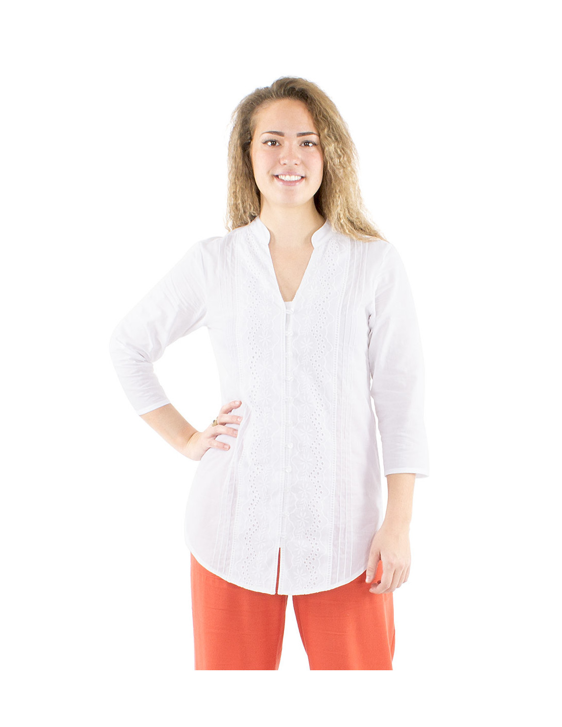 Chemise longue en coton pour femme : Vous allez adorer ce chemisier bohème et romantique, avec ses manches 3/4 et son col V aux bords arrondis directement inspiré du col Mao. De jolis boutons blanc de haut en bas qui se ferment sur un empiècement de broderies anglaises et de fronces. Une pièce unique et élégante, à porter en tunique avec sa jolie découpe arrondie ou rentrée dans un pantalon pour un style plus travaillé. Disponible du S au XXL, il satisfera toutes les morphologies.